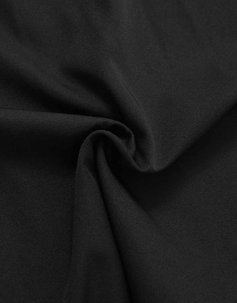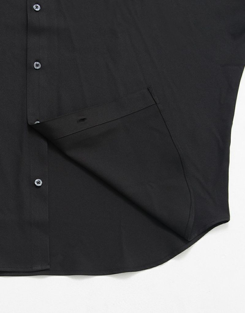 襟のハトメにピアスを配置したブラックカラーのオーバーサイズシャツ。