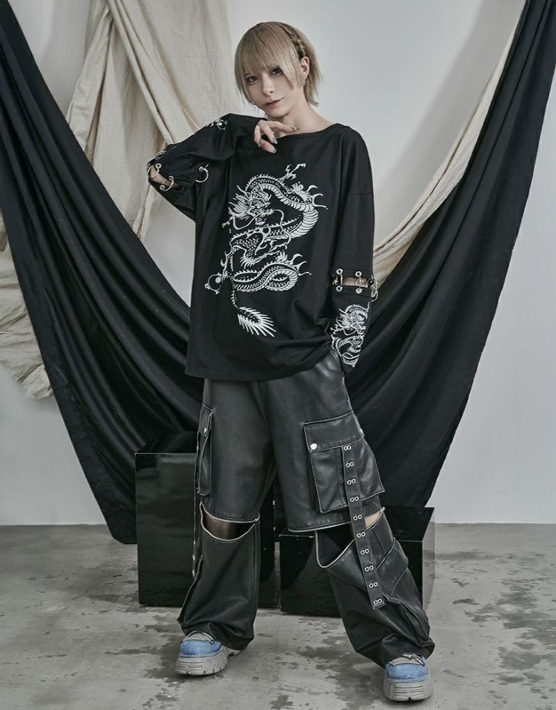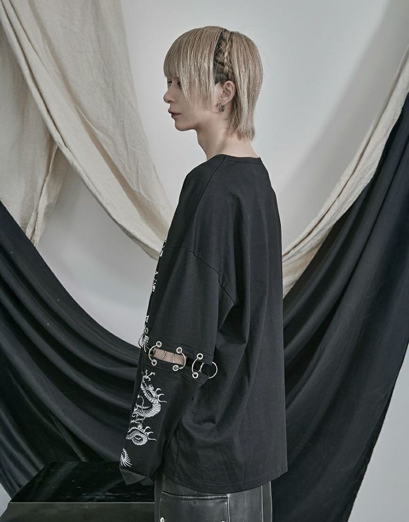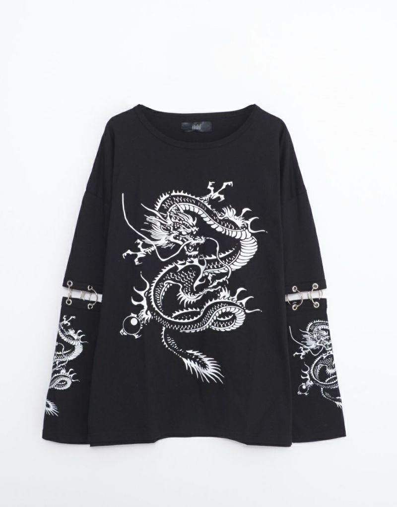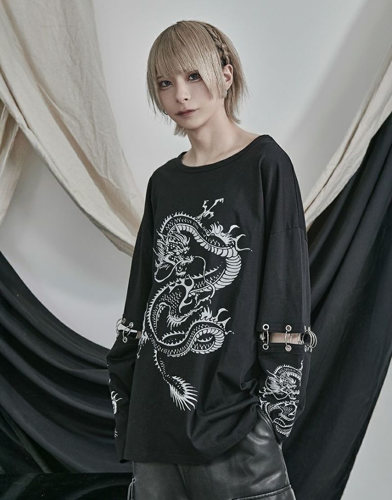 ililil【イルイルイル】よりgimmick dragonロンTが登場。 オリエンタルテイスト溢れるドラゴングラフィックをフロントと袖にプリントしたデザインロンT。袖にアイレットを配置しリングでつないだセパレートデザインなので半袖Tシャツとしてもご着用いただけます。インパクトあるグラフィックに拘りのデザインワークがあいまったオススメのロンティー。 オーバーサイズで仕上げメンズ、レディースを問わず、ユニセックスで着用可能です。
