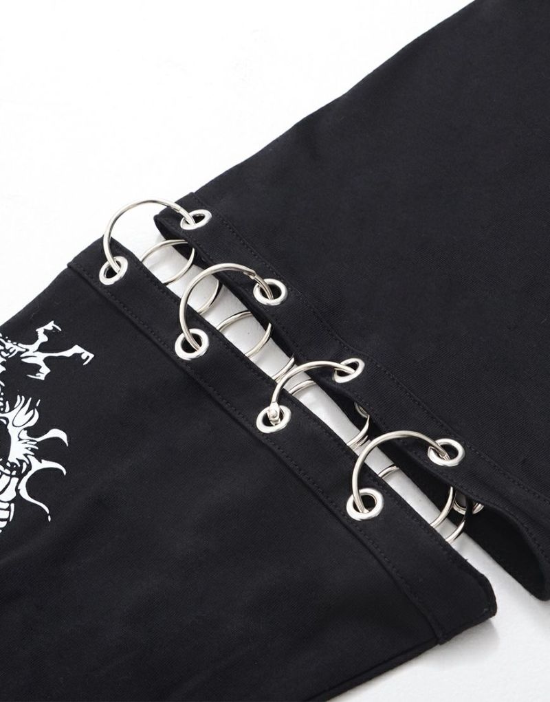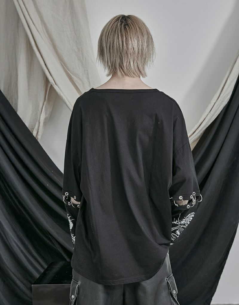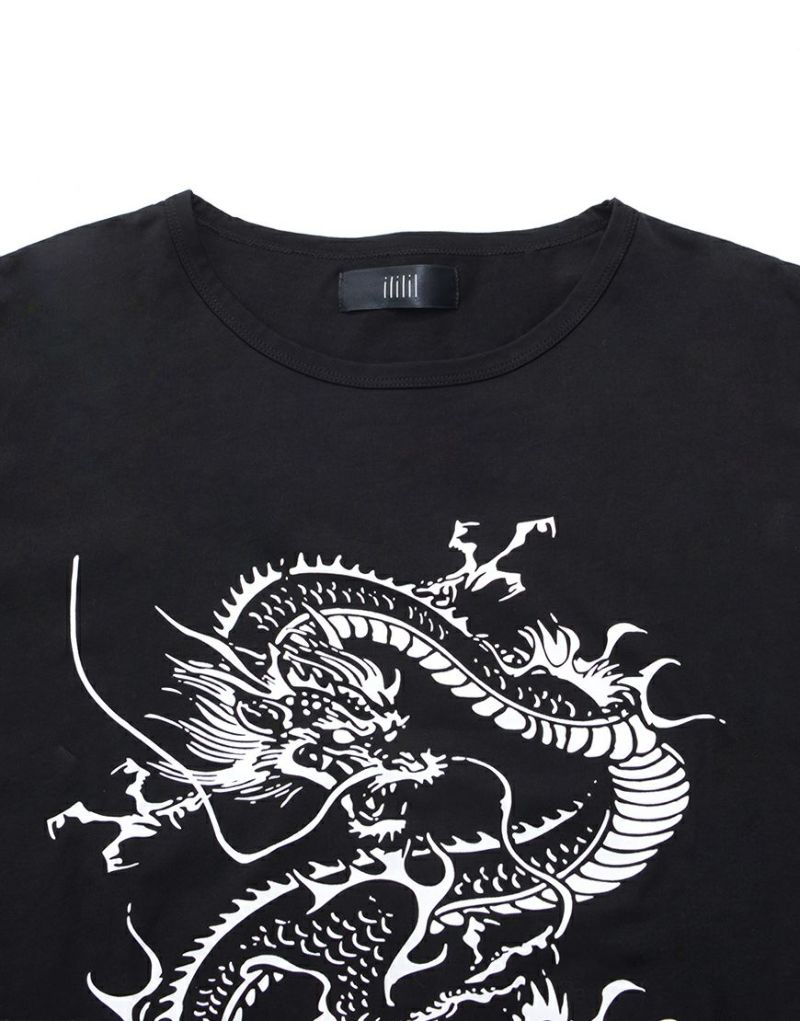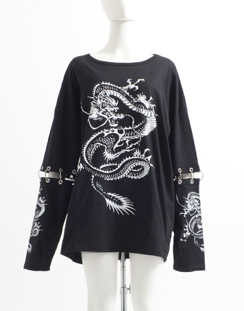 ililil【イルイルイル】よりgimmick dragonロンTが登場。 オリエンタルテイスト溢れるドラゴングラフィックをフロントと袖にプリントしたデザインロンT。袖にアイレットを配置しリングでつないだセパレートデザインなので半袖Tシャツとしてもご着用いただけます。インパクトあるグラフィックに拘りのデザインワークがあいまったオススメのロンティー。 オーバーサイズで仕上げメンズ、レディースを問わず、ユニセックスで着用可能です。