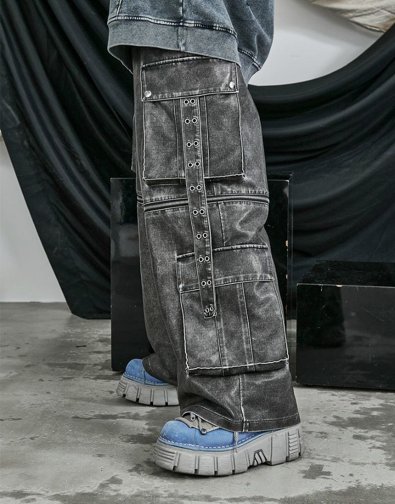 サイドのカーゴポケットにメタルパーツやダブルハトメベルトで装飾を施し、