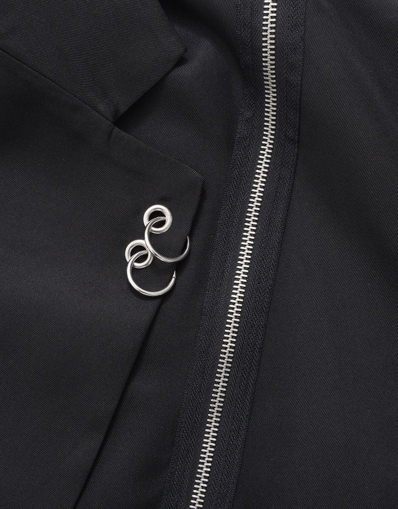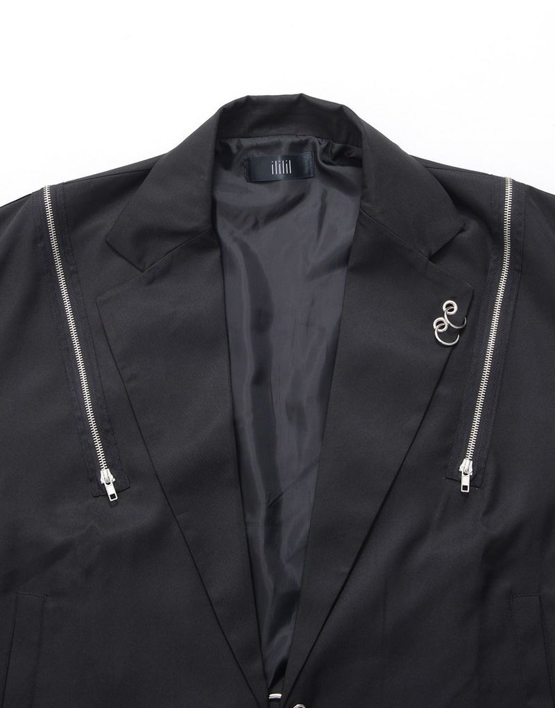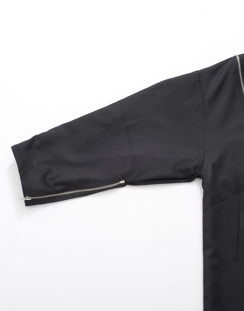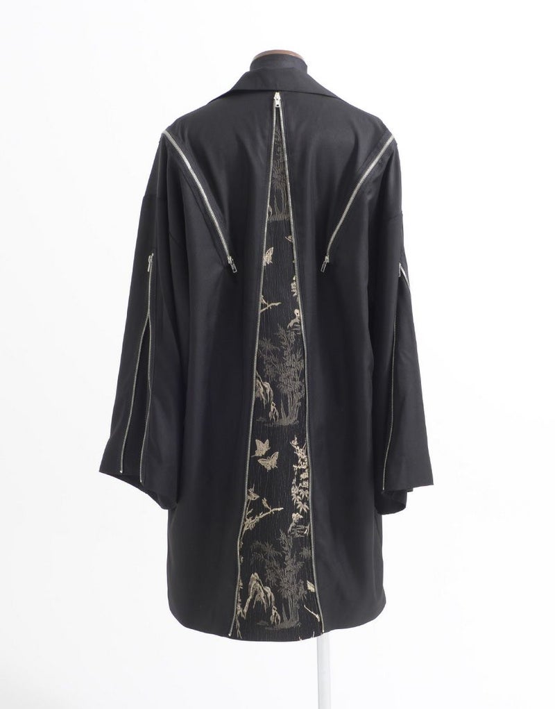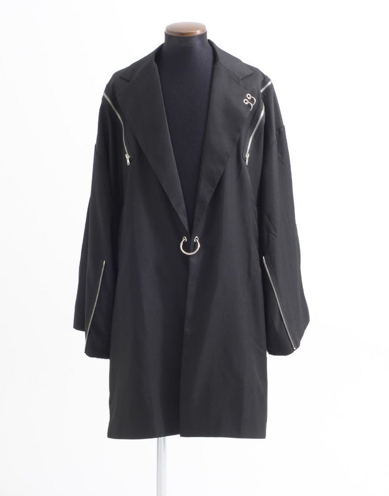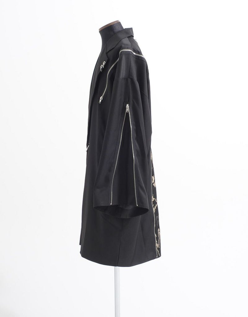 袖と背中にファスナーが付いたロングテーラードジャケットです。