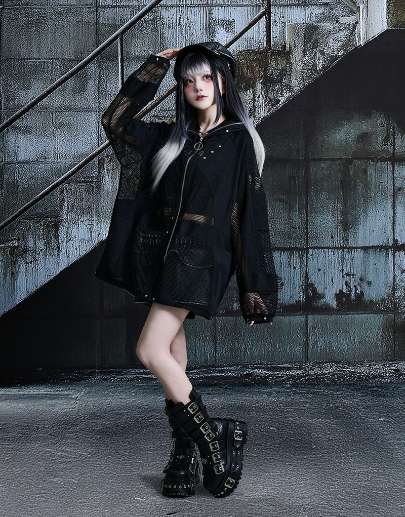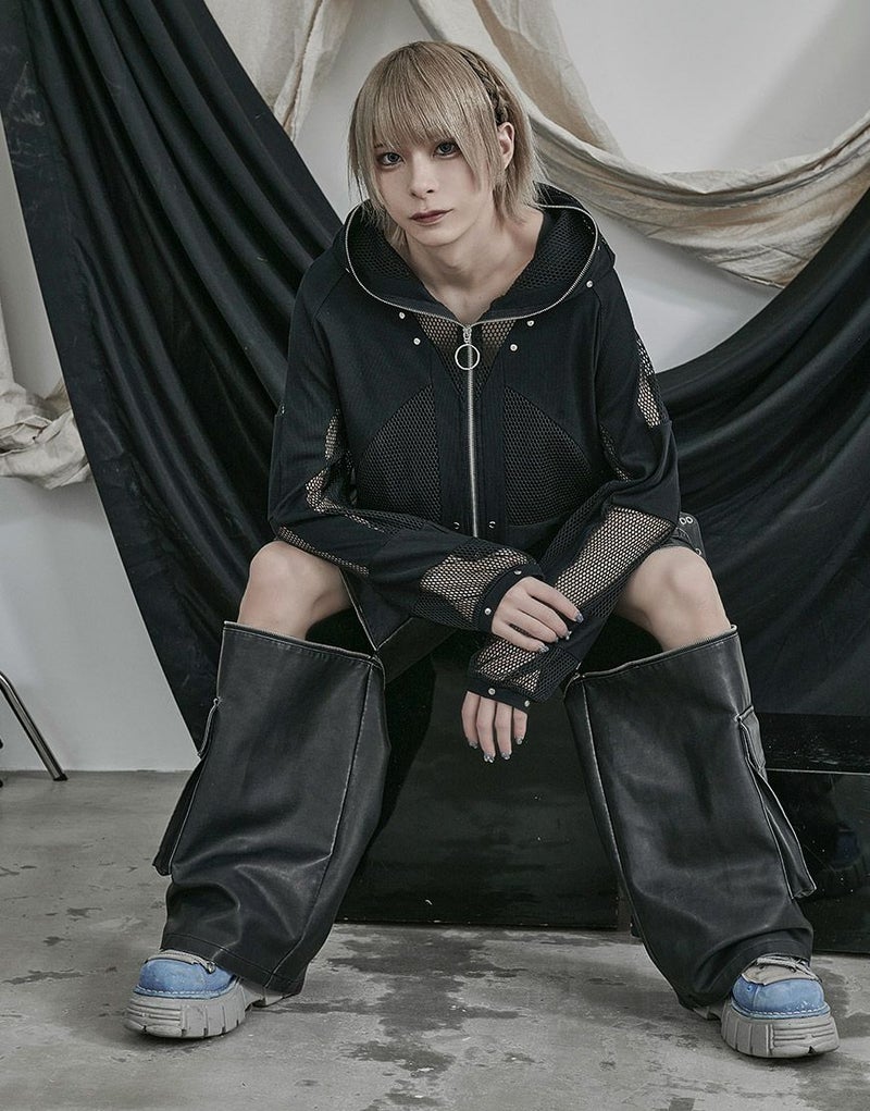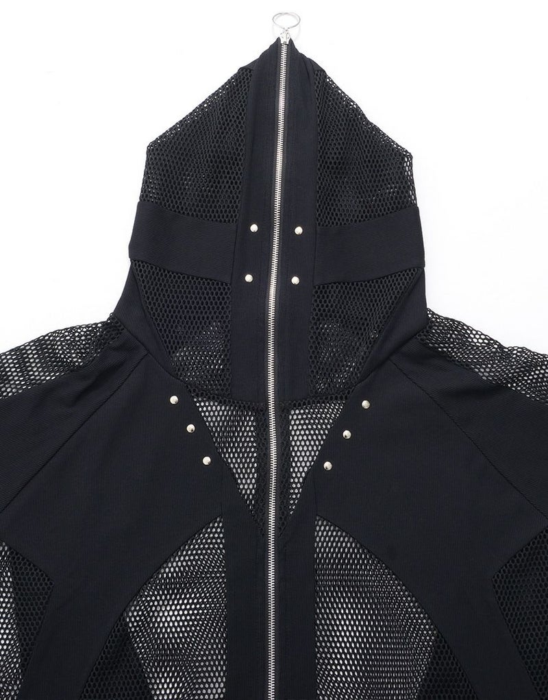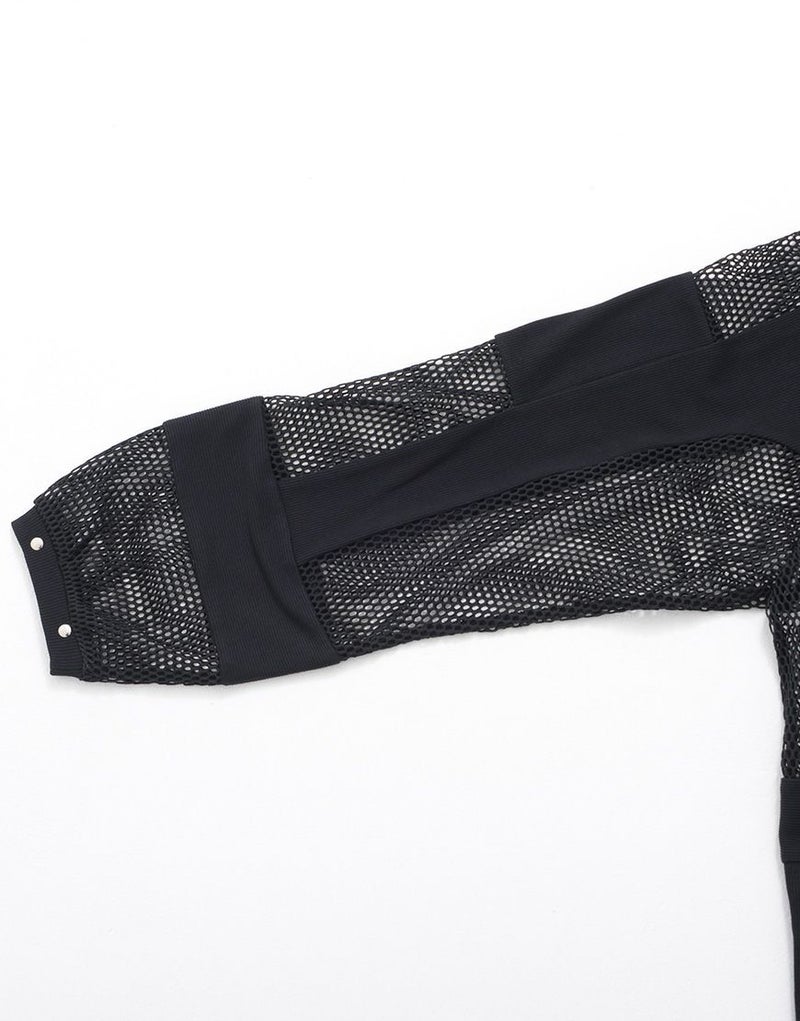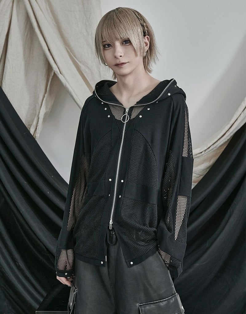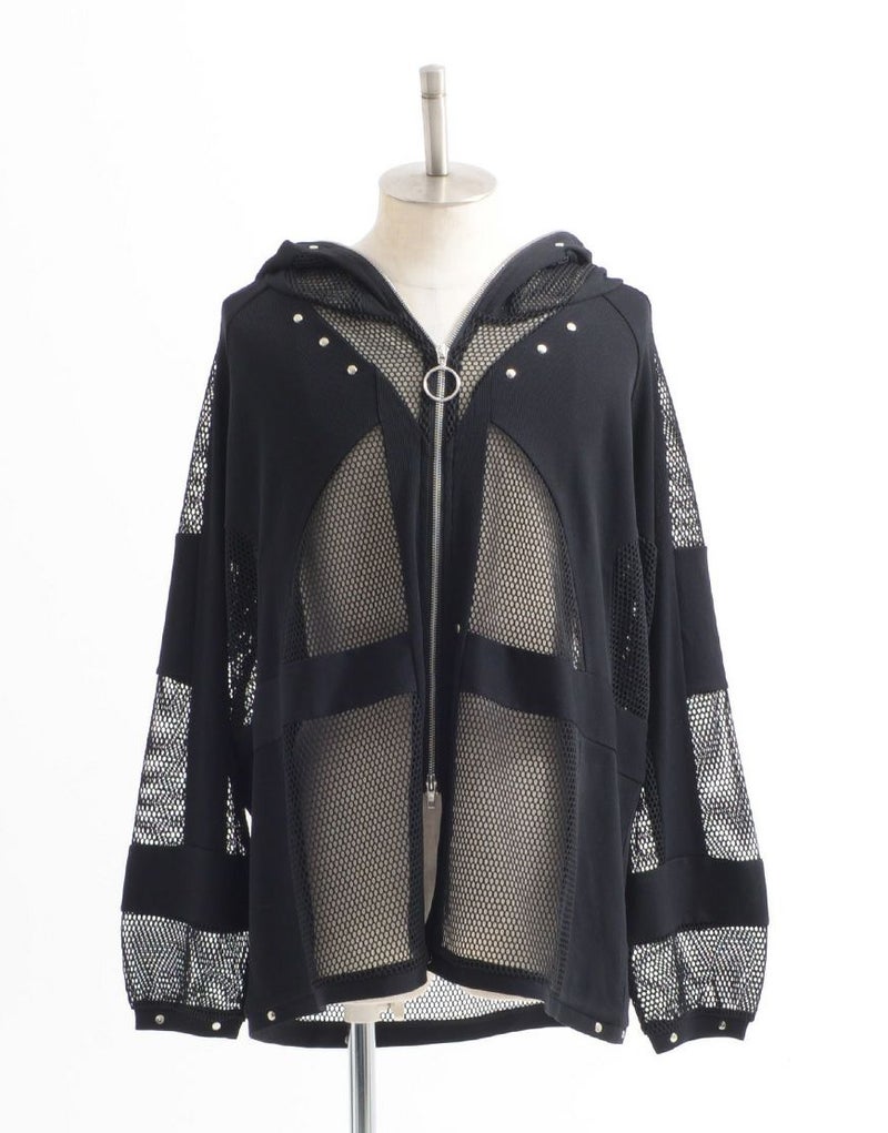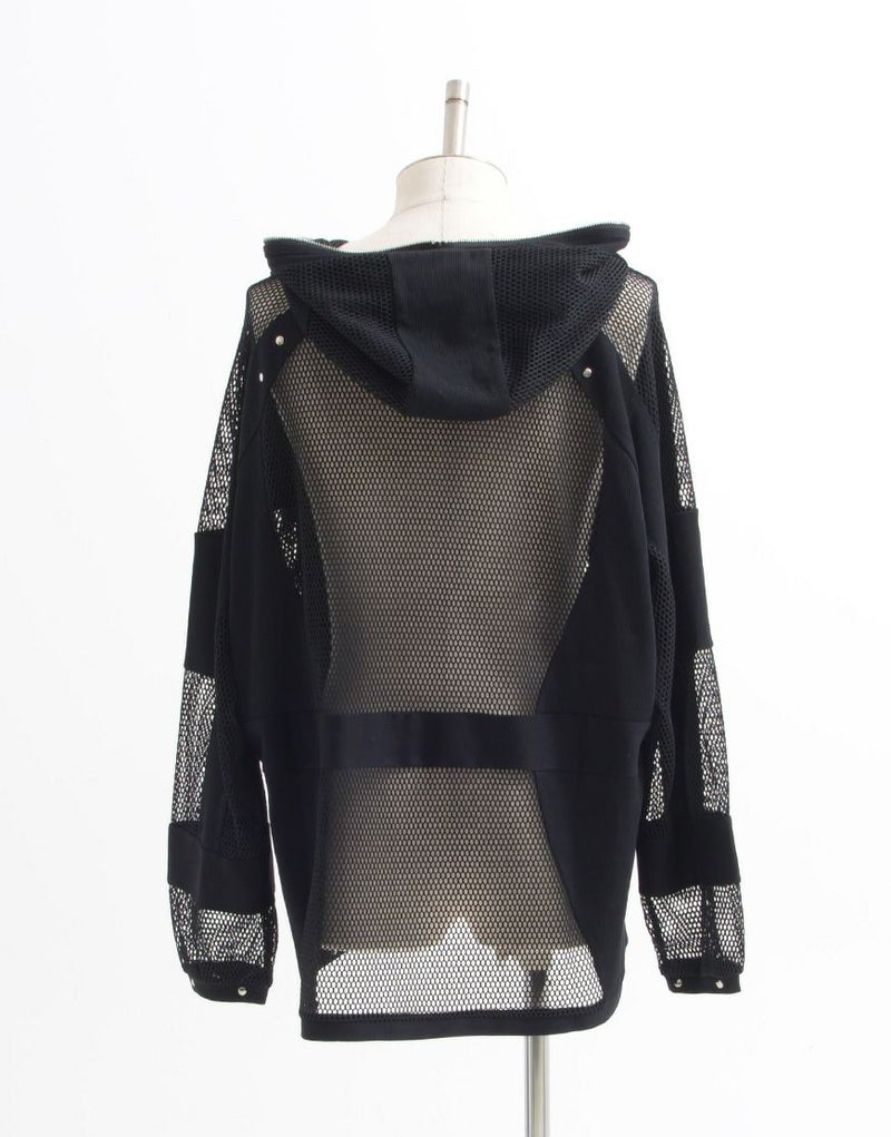 全体的に透け感のあるメッシュ生地とリブ生地の切り替えデザインをいれたパーカー。