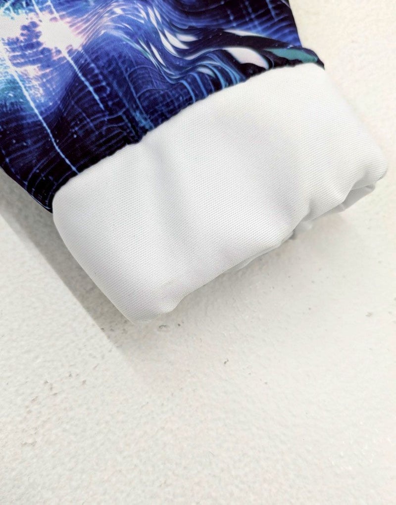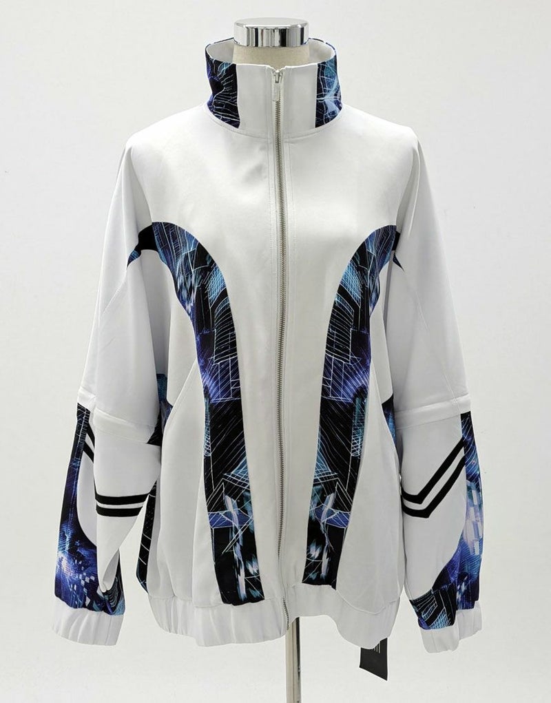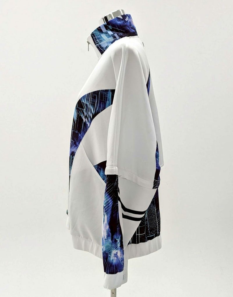ブルーのグラフィック切替が目を引く、ジップ仕様のジャージトップス。