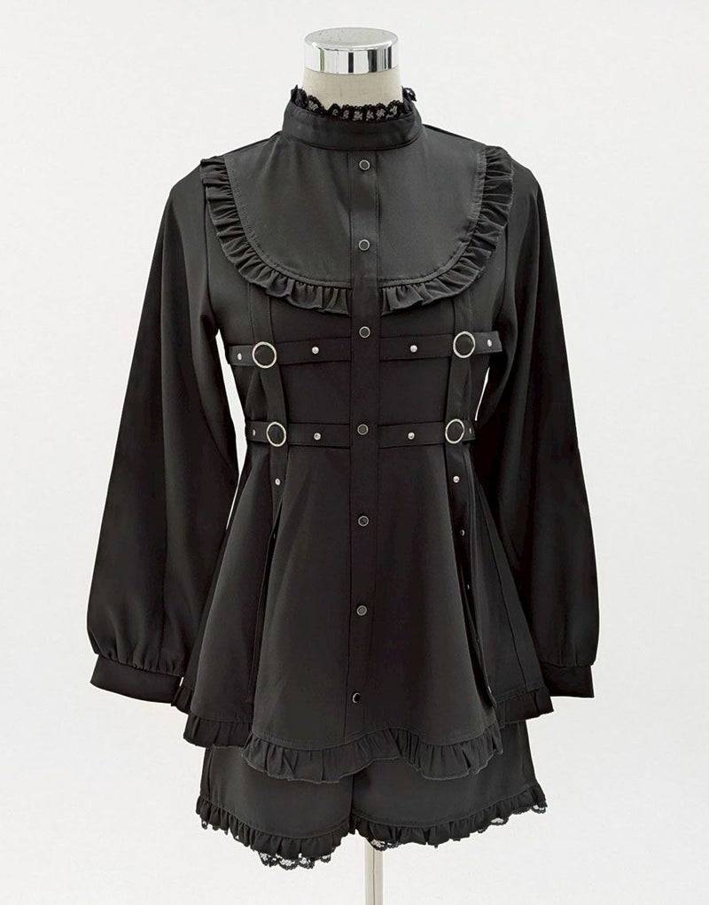 ハーネス風のデザインが特徴的なペプラムセットアップ。