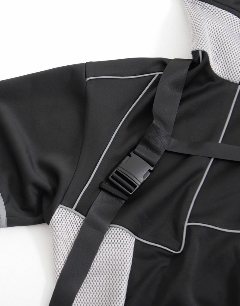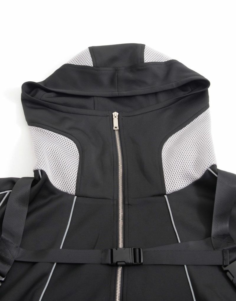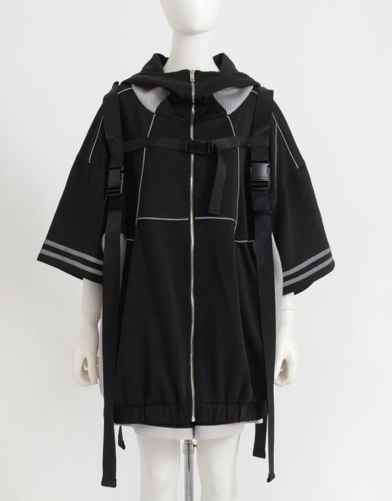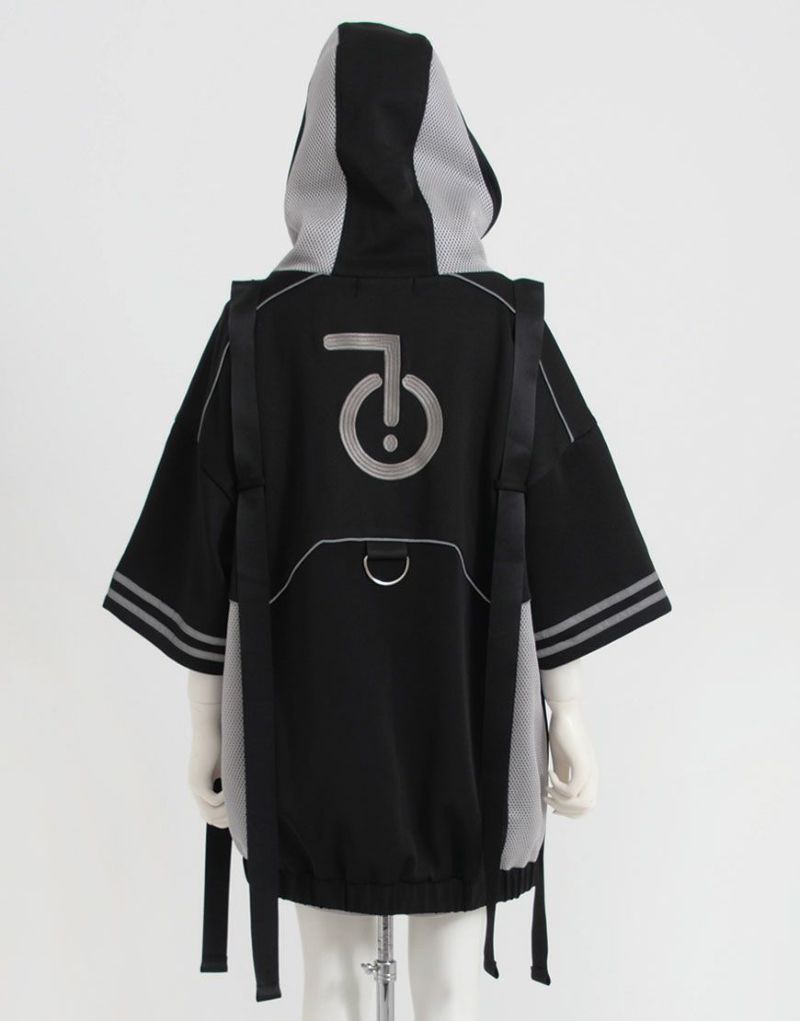 ililil【イルイルイル】よりログイン完了!!ぱ~か~が登場です。 リフレクターパイピングを施したジャージ素材パーカーです。 サイドや、フードから肩にかけてをクッションメッシュで切り替えサイバー感を演出。 フロントからバッグに垂れるようにフェイクベルトがついた豪華な仕様。 バッグにはオリジナルロゴを刺繍で施し、その下にはDカンを配置。 ハイネックになっているので開けたり閉めたりで印象変化も楽しめます。 ゆるっとしたサイズ感でレディース、メンズ問わず着用可能です。