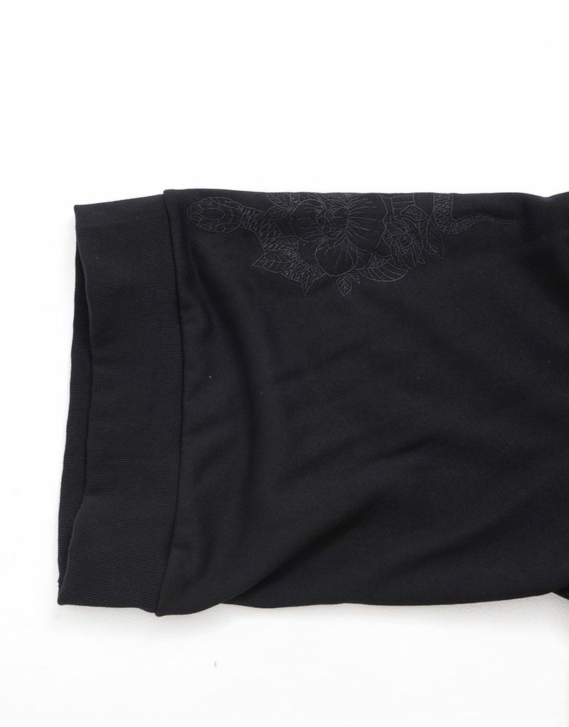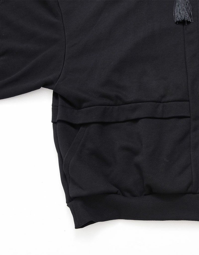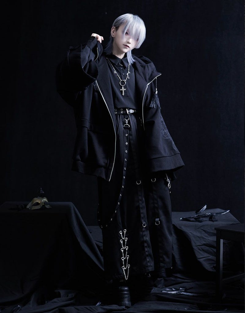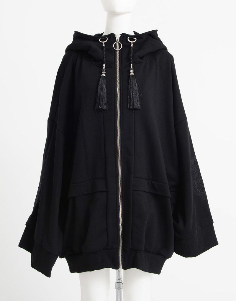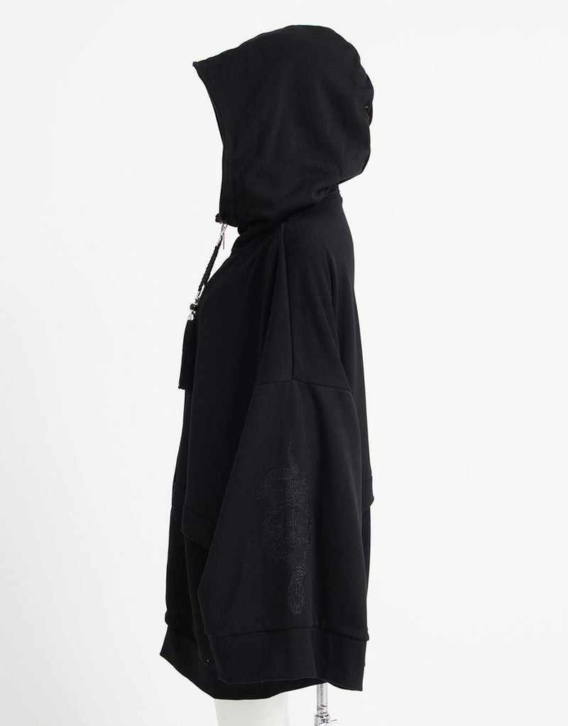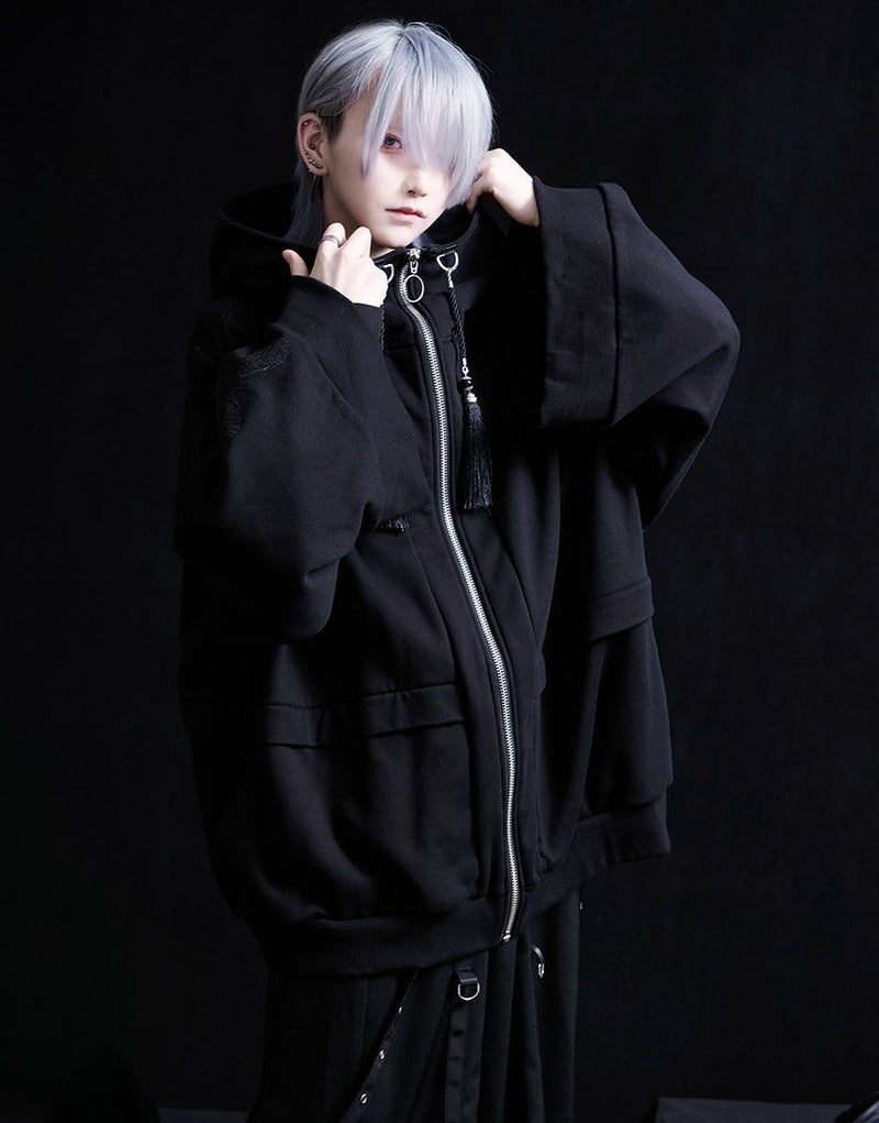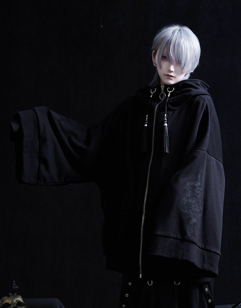 ililil【イルイルイル】より【蛇昇華界】着物パーカーが登場です。 肩から袖口にかけて広がっている袖に、 蛇と華の刺繍が施されたジップアップパーカー。 首元にはDカンにタッセルのついた豪華なデザイン。 ハイネックになっているので開けたり閉めたりで印象変化も楽しめます。 程よいゆとりのあるサイズ感で着やすさも抜群です。 #ユニセックス #パーカー #フーディー #ブラックコーデ #オーバーサイズ #ジップアップ #ハイネック