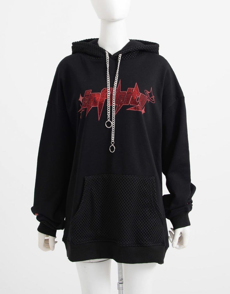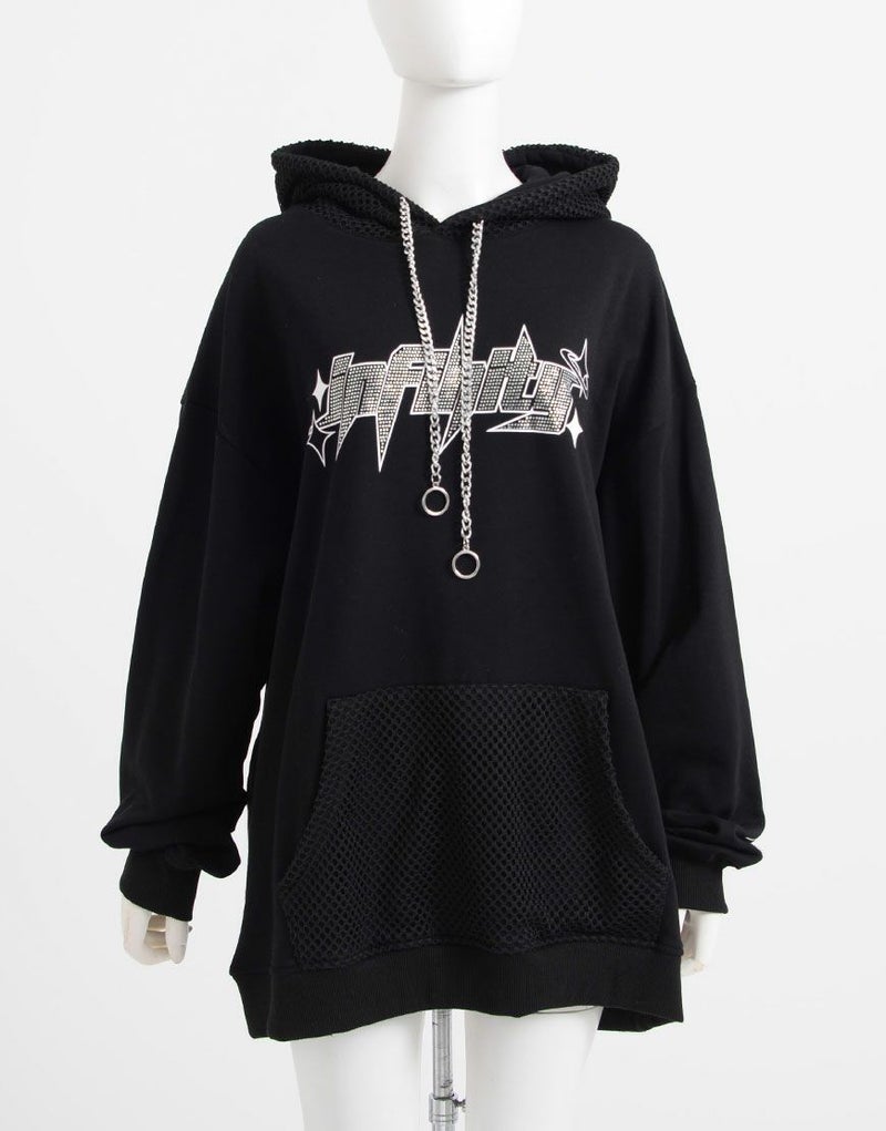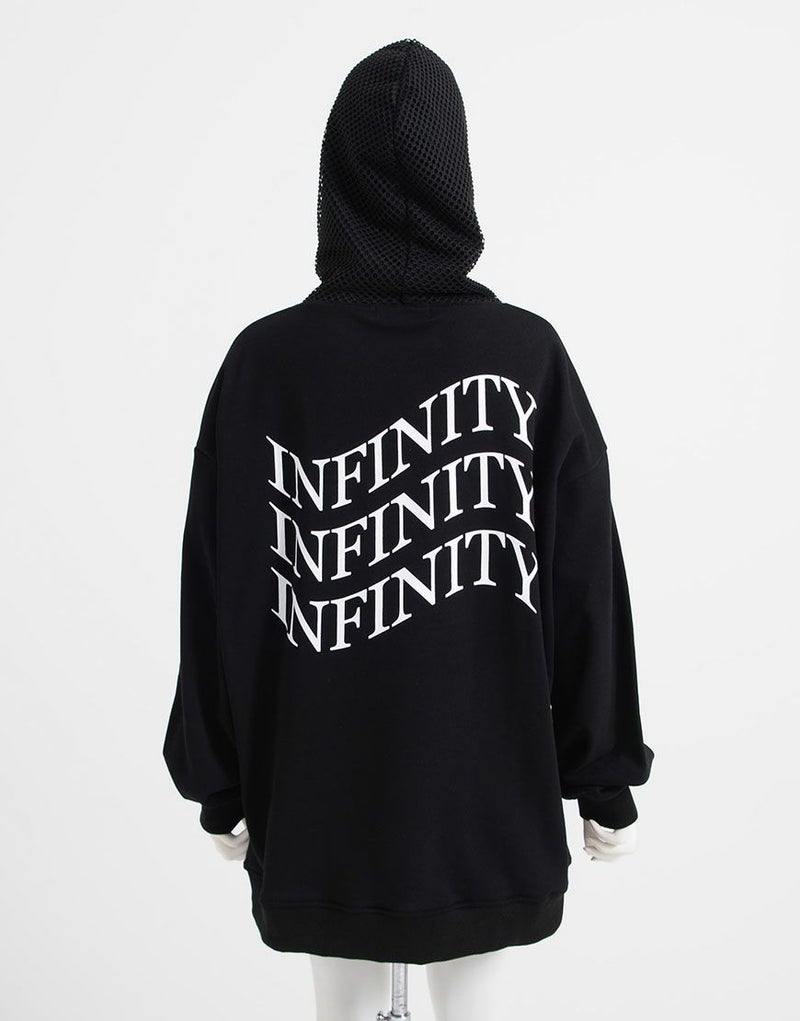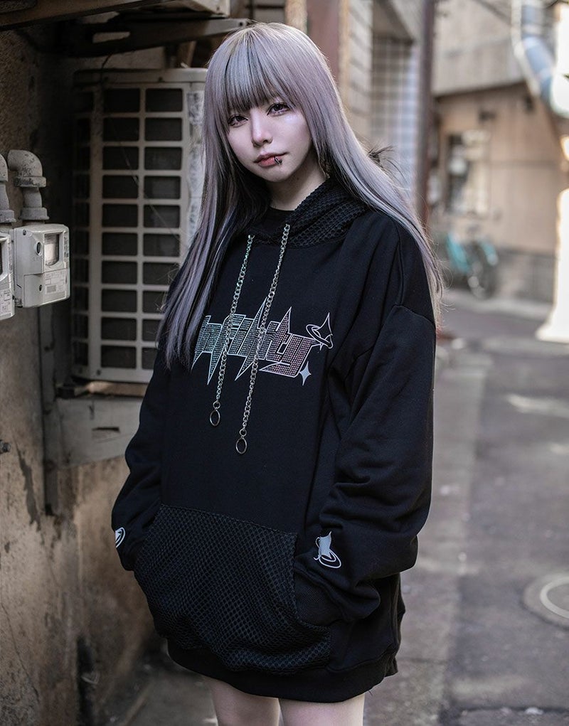 ililil【イルイルイル】より無限発光しちゃうぞぅ!パーカーが登場です。 フロントにはラインストーン使いのオリジナルロゴ、 バックにはINFINITYのウェーブロゴを配置したパーカー。 フードの紐をチェーンにし印象的なデザインに。 ビッグシルエットでメンズ、レディースを問わず、ユニセックスで ご着用頂ける一押しパーカーです。 #ユニセックス #ジェンダーレス #パーカー #ラインストーン #プリント