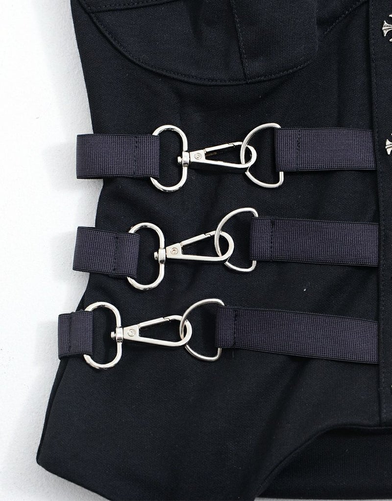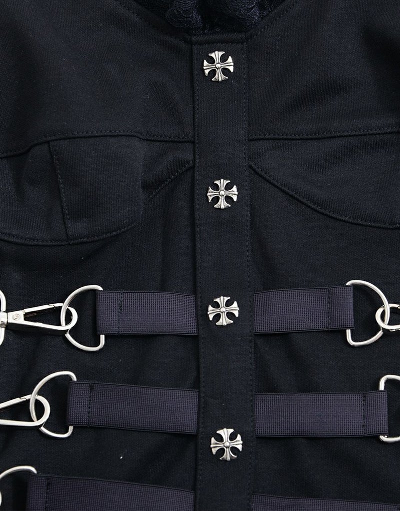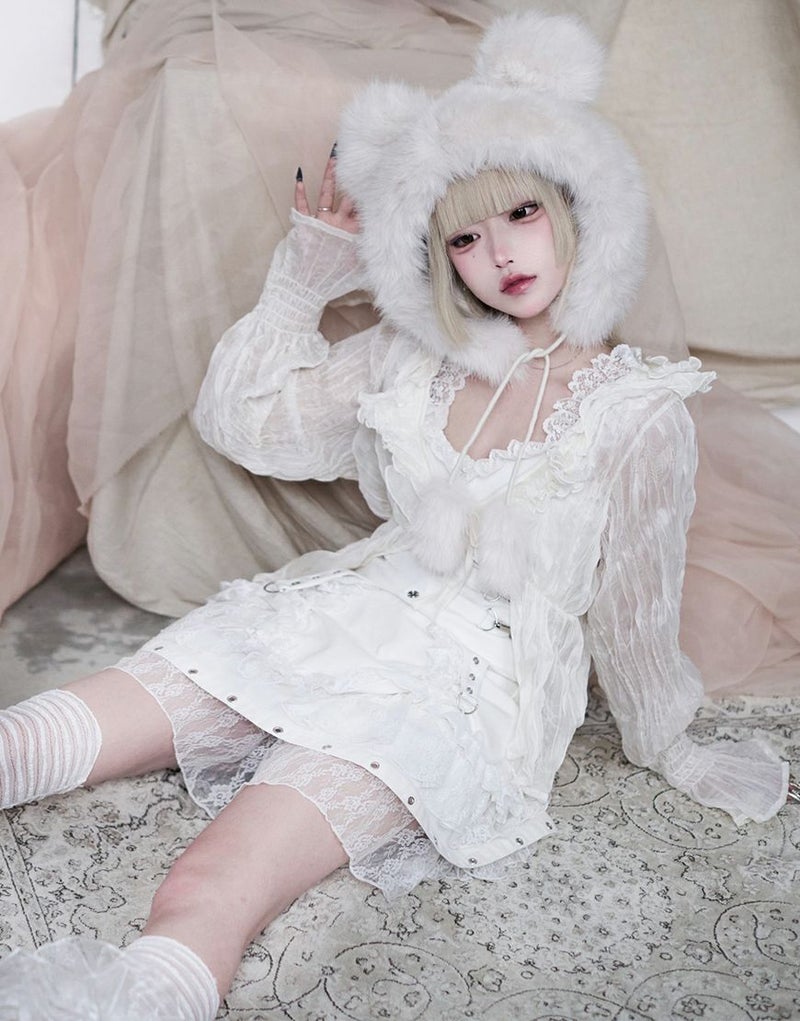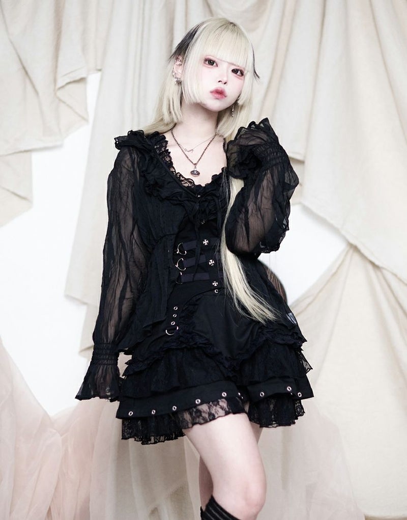 襟周りと肩部分にはレースが施され、フロントにはハトメがアクセントとして配置されています。