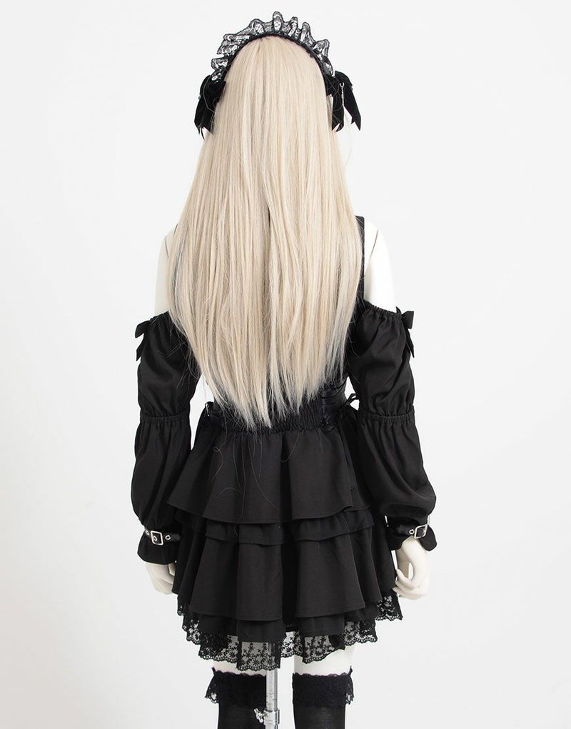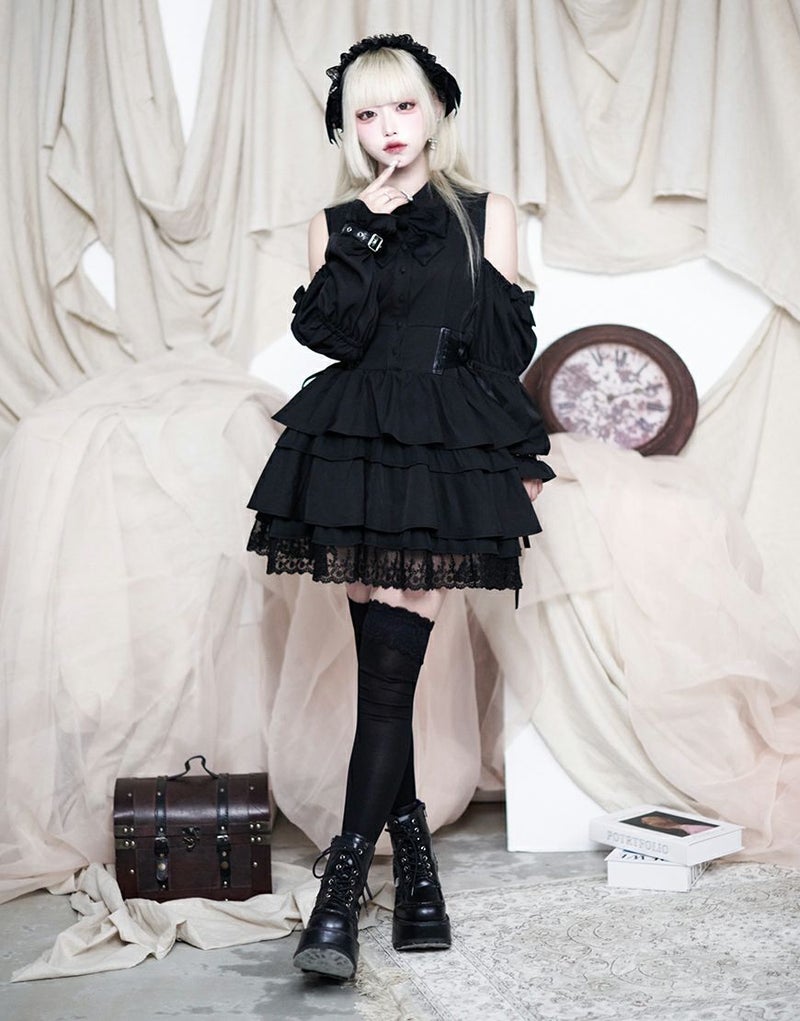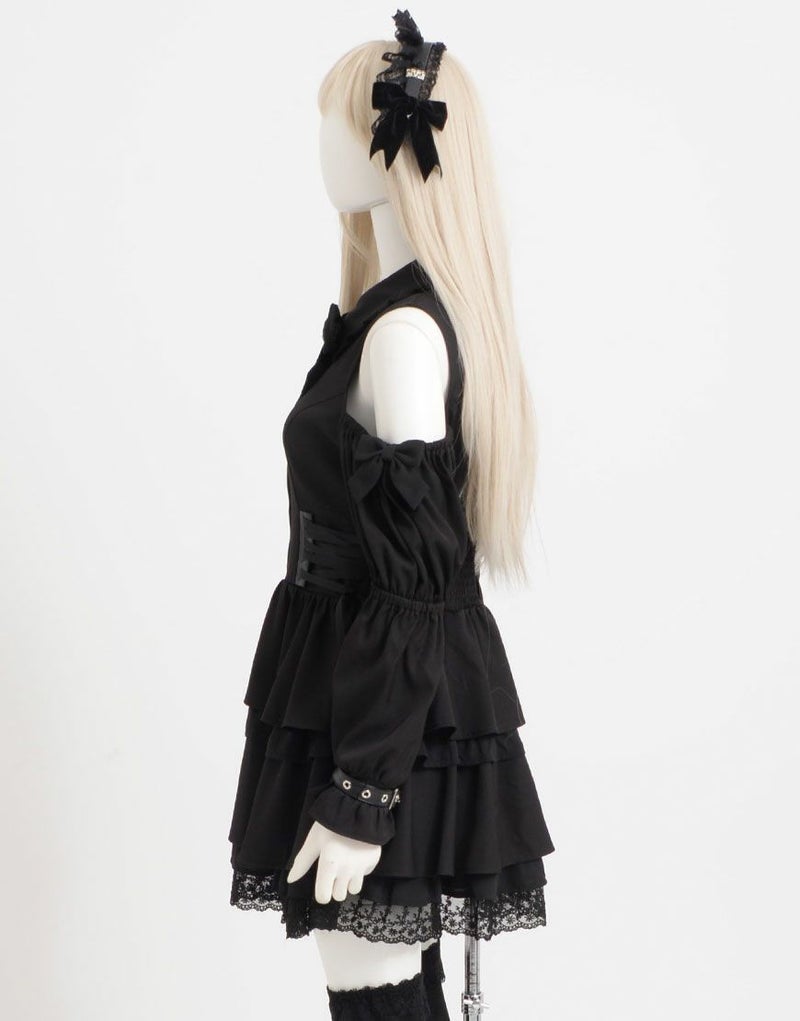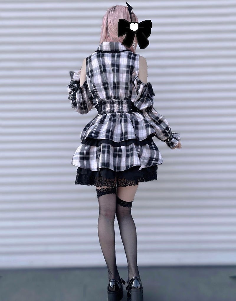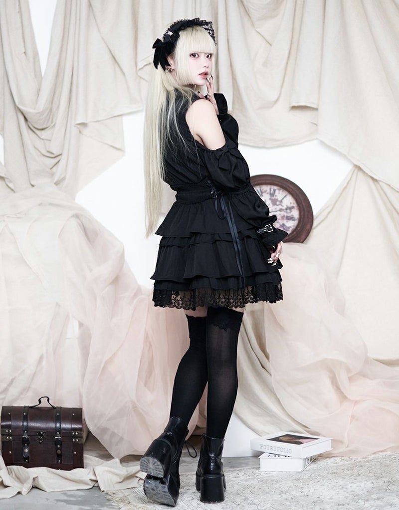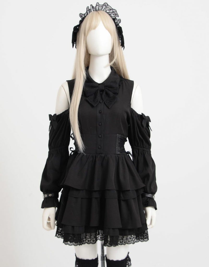 肩開きが地雷感のあるミニ丈ワンピース。