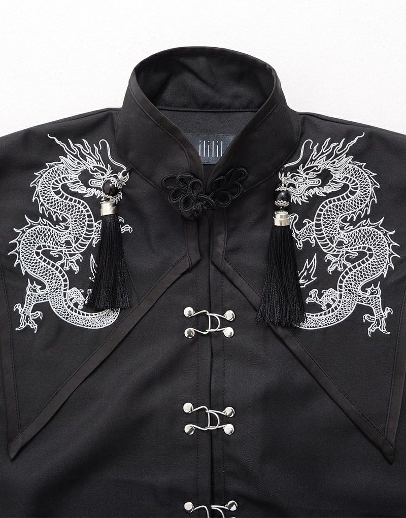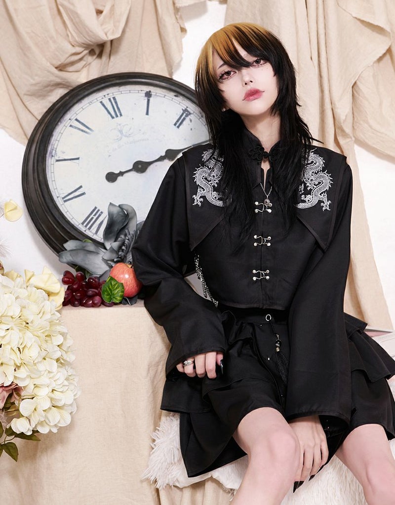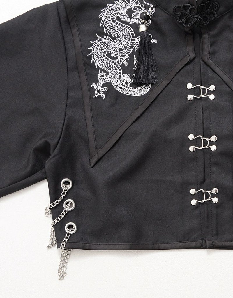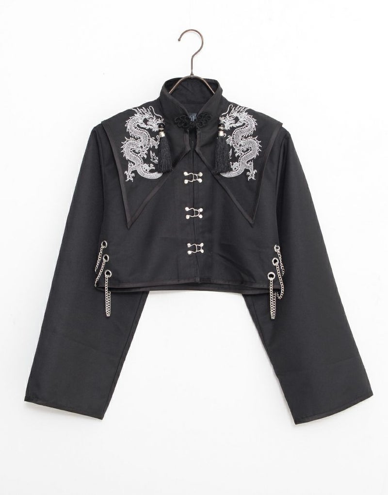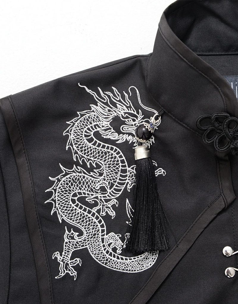 タッセルやチャイナボタンをあしらい、フロントの襟には龍の刺繍を施して、華やかさと個性を引き立てています。