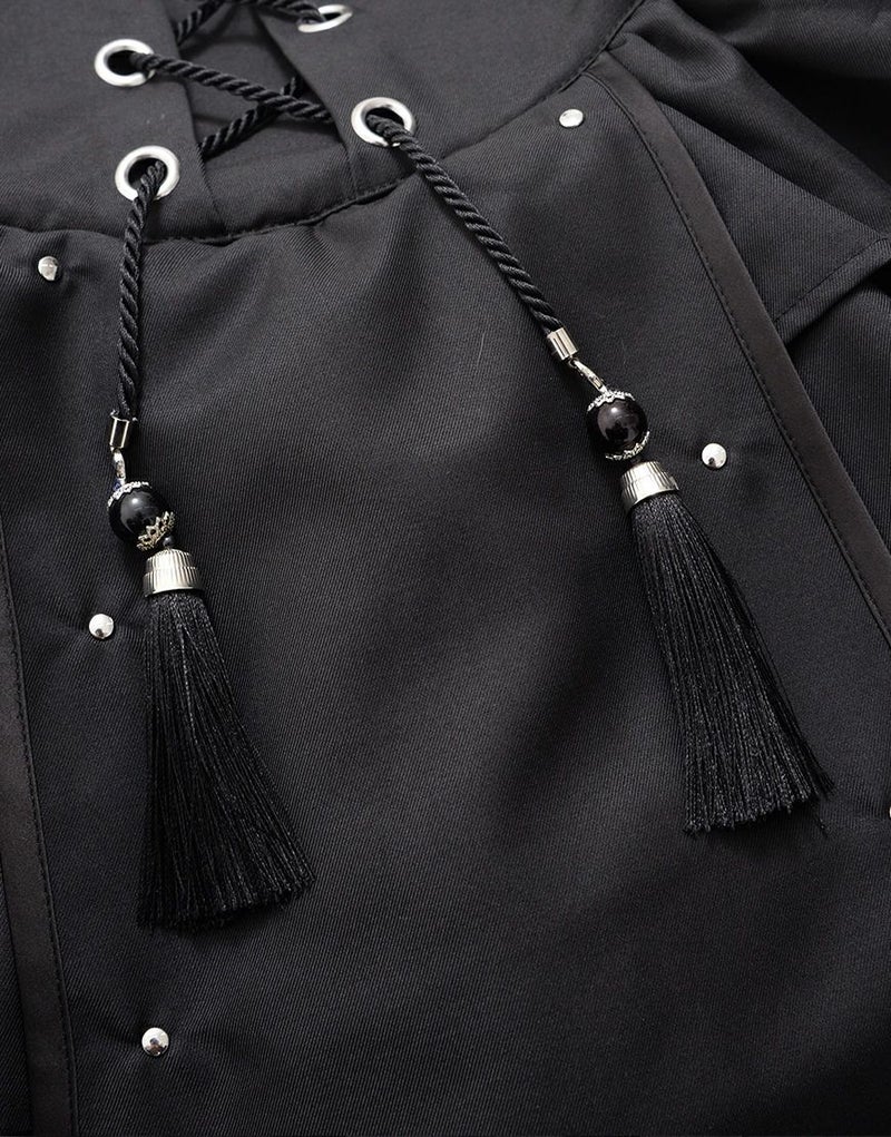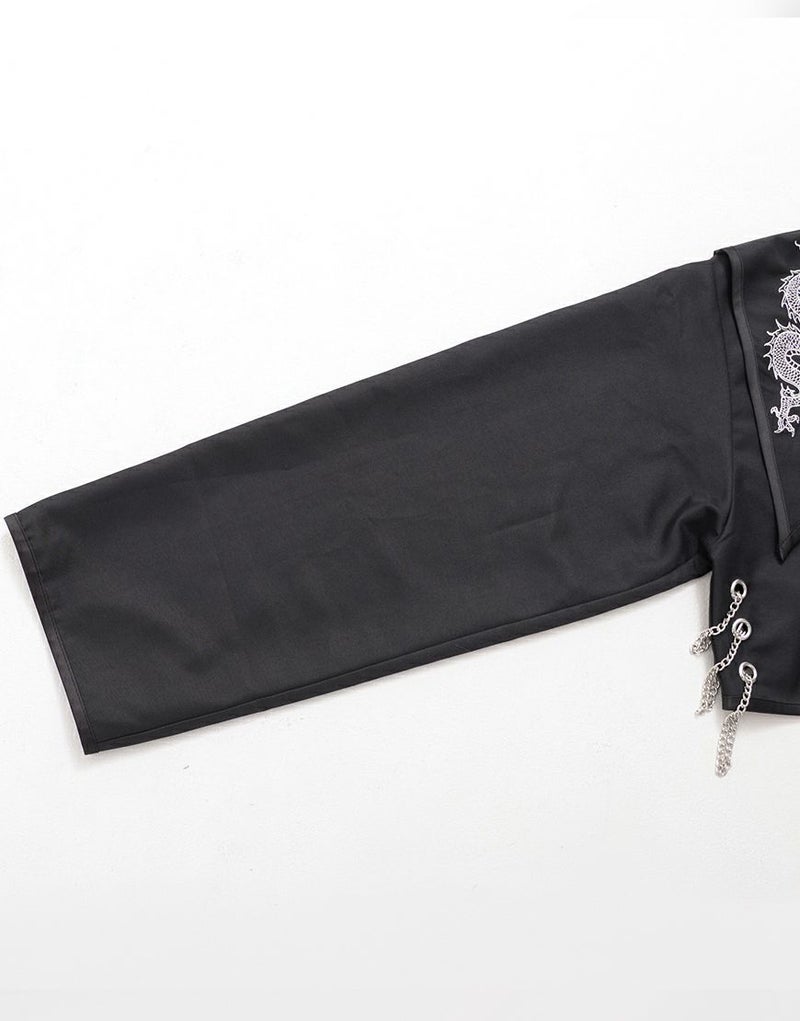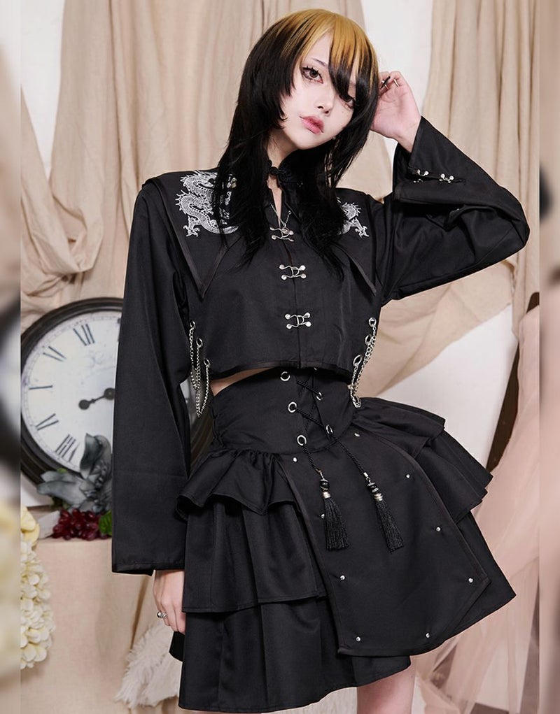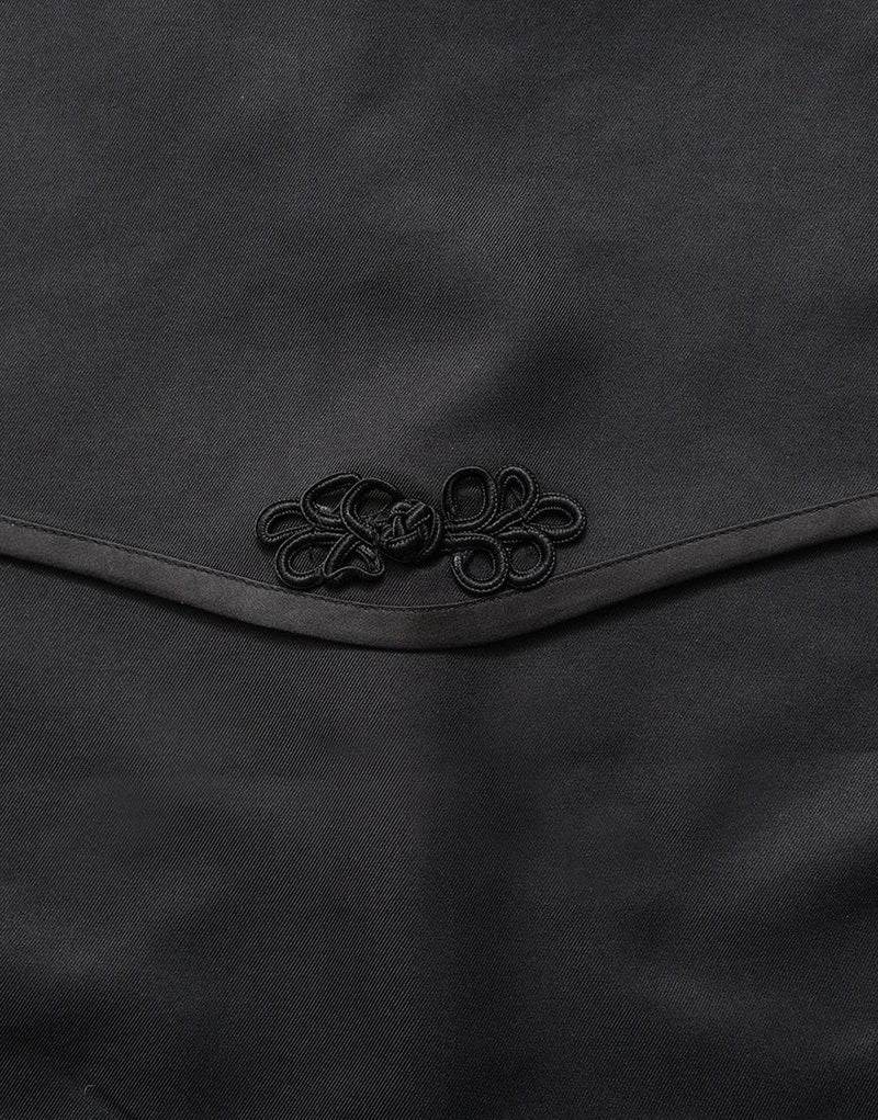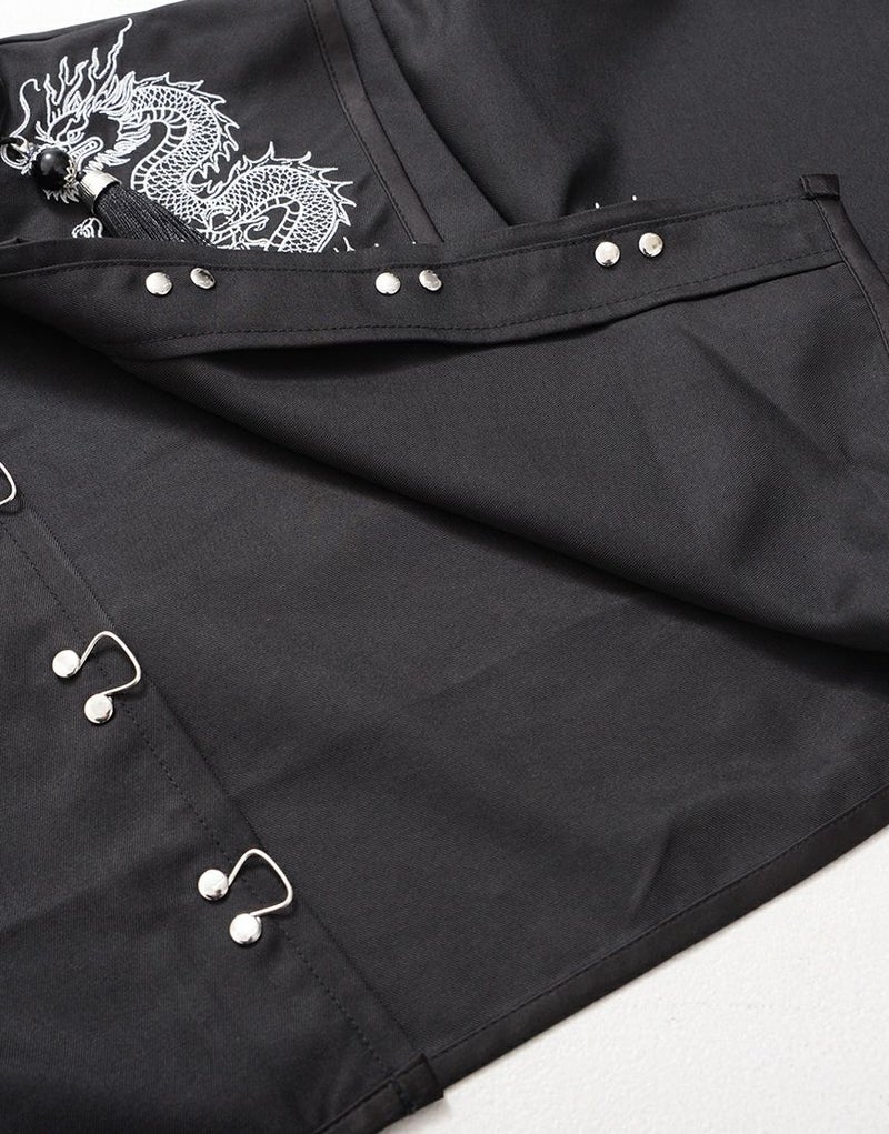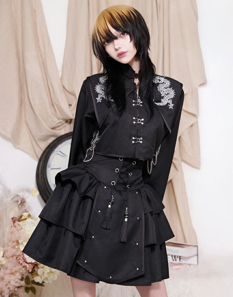 タッセルやチャイナボタンをあしらい、フロントの襟には龍の刺繍を施して、華やかさと個性を引き立てています。
