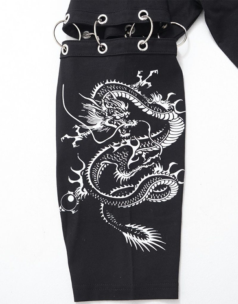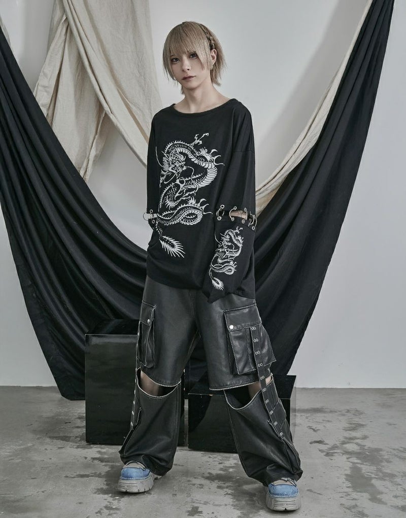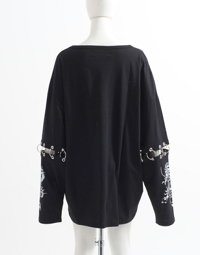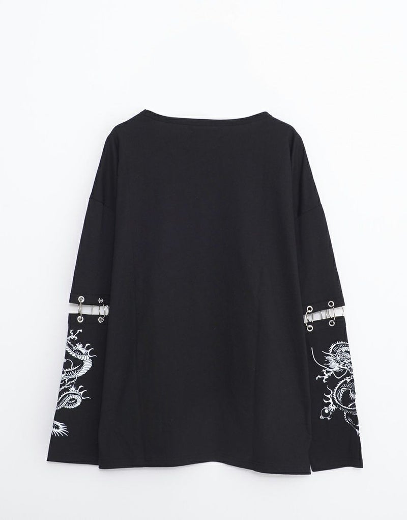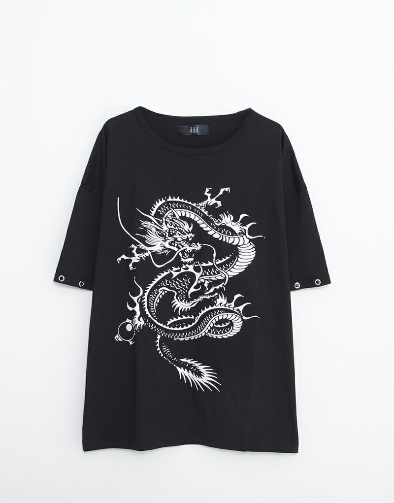 ililil【イルイルイル】よりgimmick dragonロンTが登場。 オリエンタルテイスト溢れるドラゴングラフィックをフロントと袖にプリントしたデザインロンT。袖にアイレットを配置しリングでつないだセパレートデザインなので半袖Tシャツとしてもご着用いただけます。インパクトあるグラフィックに拘りのデザインワークがあいまったオススメのロンティー。 オーバーサイズで仕上げメンズ、レディースを問わず、ユニセックスで着用可能です。