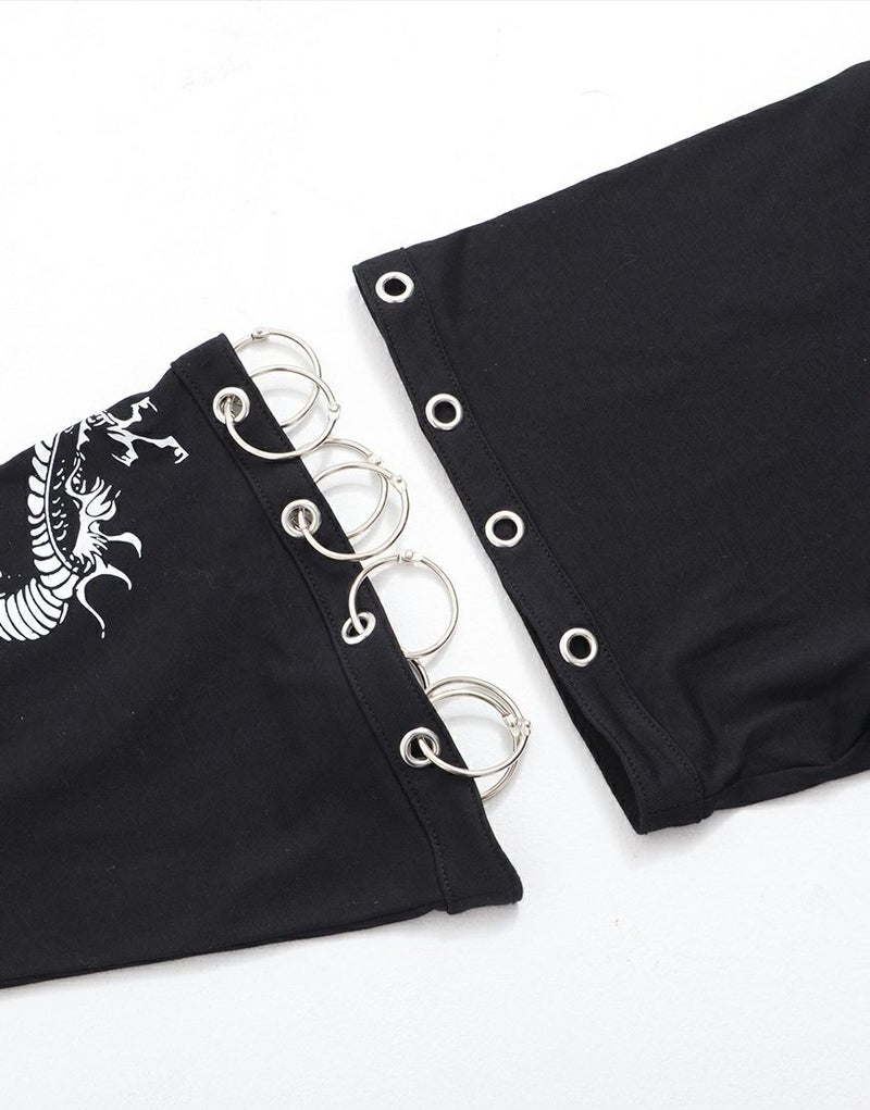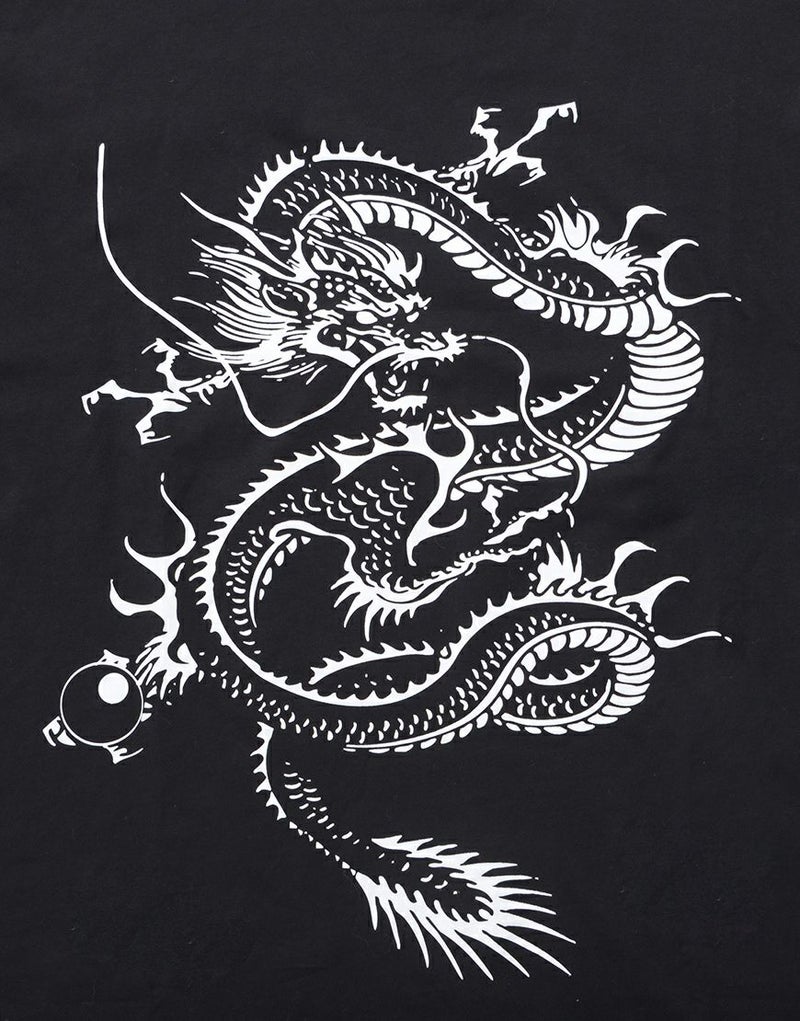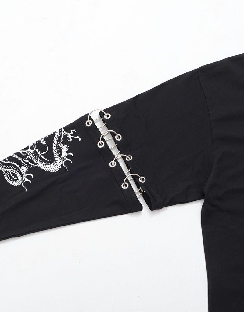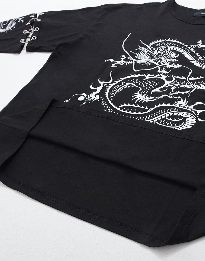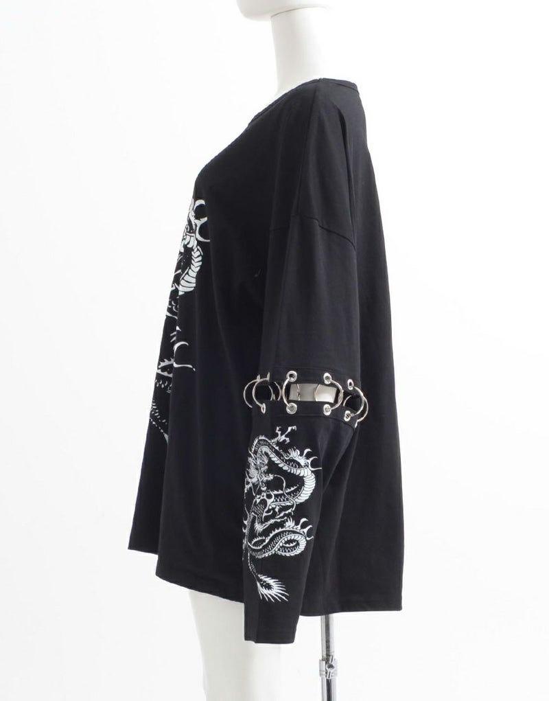 ililil【イルイルイル】よりgimmick dragonロンTが登場。 オリエンタルテイスト溢れるドラゴングラフィックをフロントと袖にプリントしたデザインロンT。袖にアイレットを配置しリングでつないだセパレートデザインなので半袖Tシャツとしてもご着用いただけます。インパクトあるグラフィックに拘りのデザインワークがあいまったオススメのロンティー。 オーバーサイズで仕上げメンズ、レディースを問わず、ユニセックスで着用可能です。