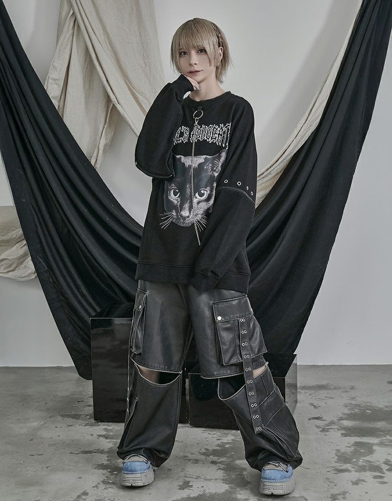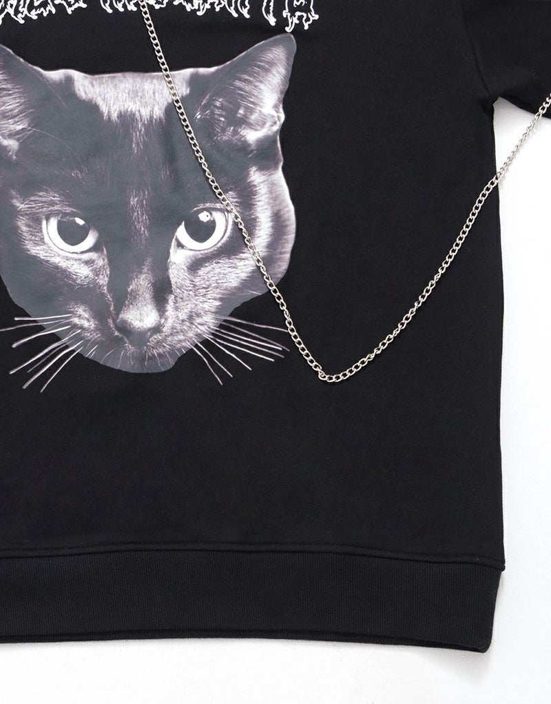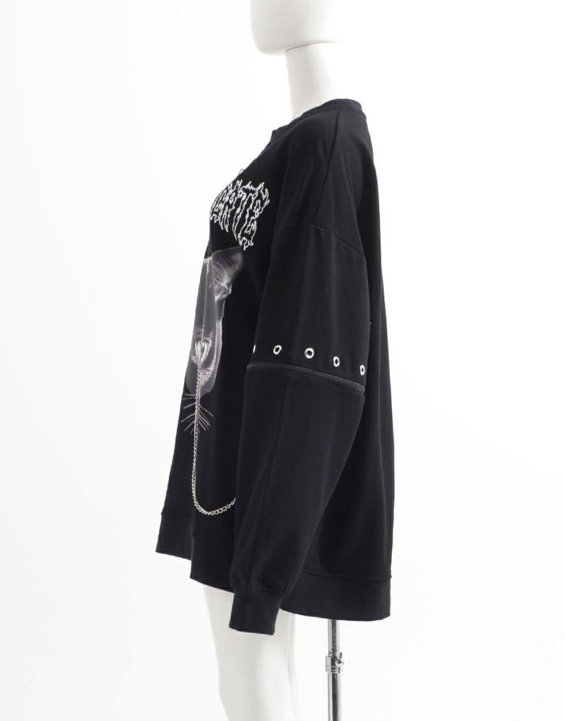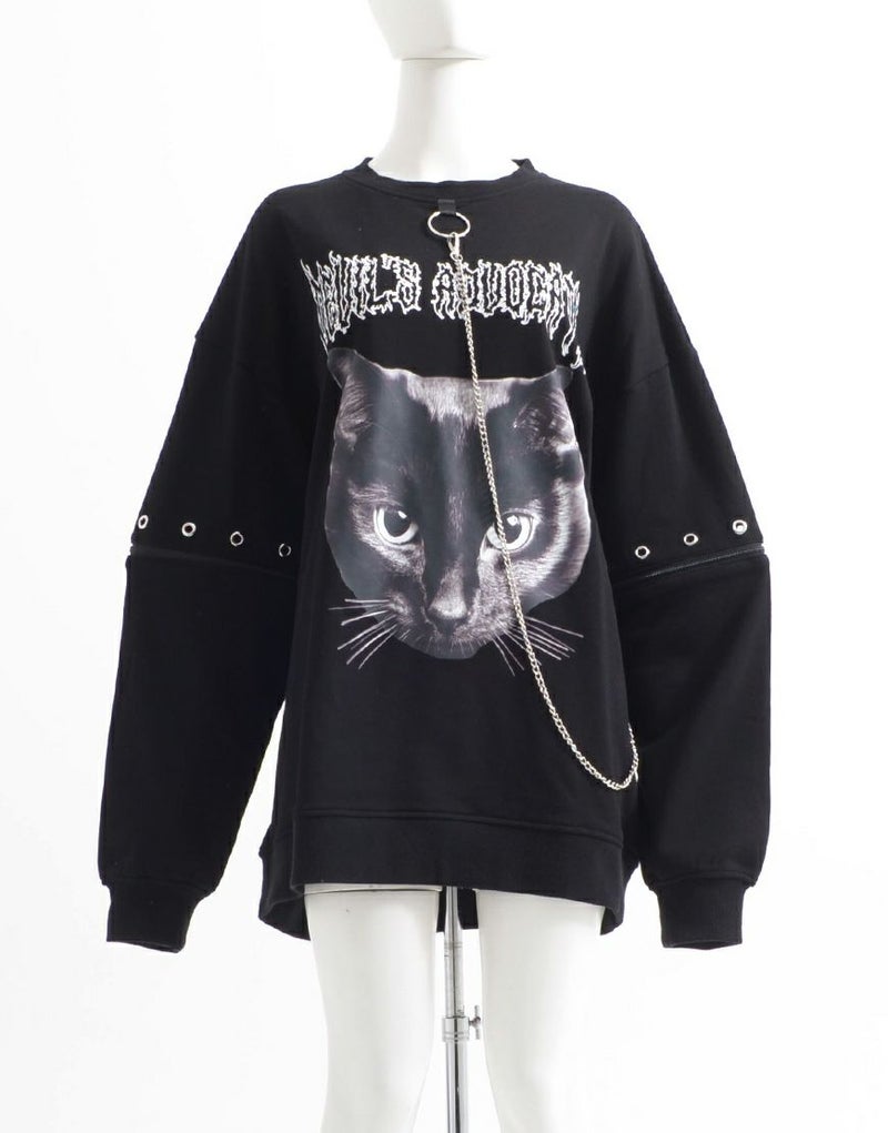 病みかわいい黒猫グラフィックをフロントに大きくプリントしたデザインスウェットトレーナー。