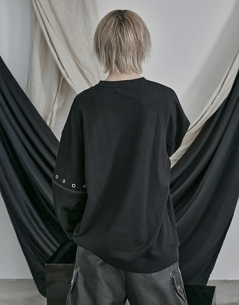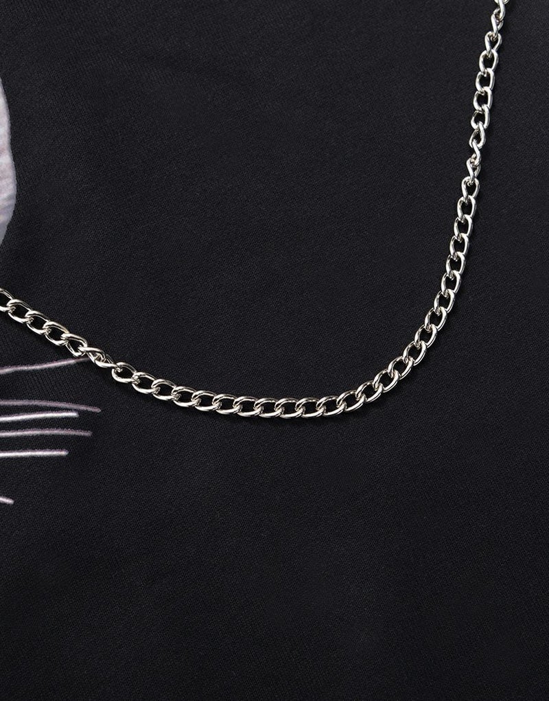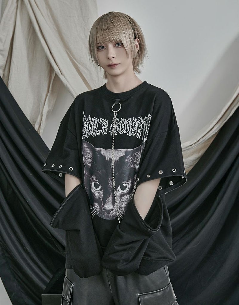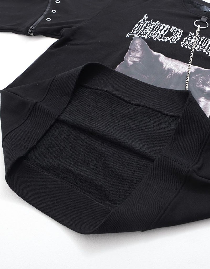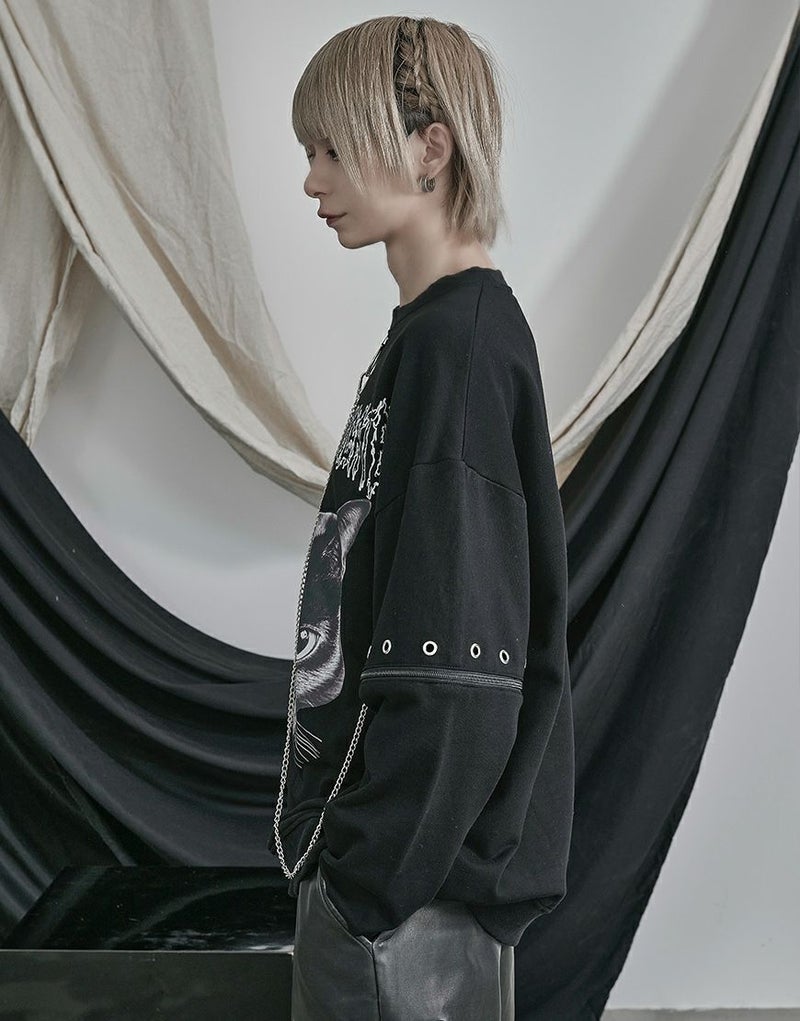 病みかわいい黒猫グラフィックをフロントに大きくプリントしたデザインスウェットトレーナー。