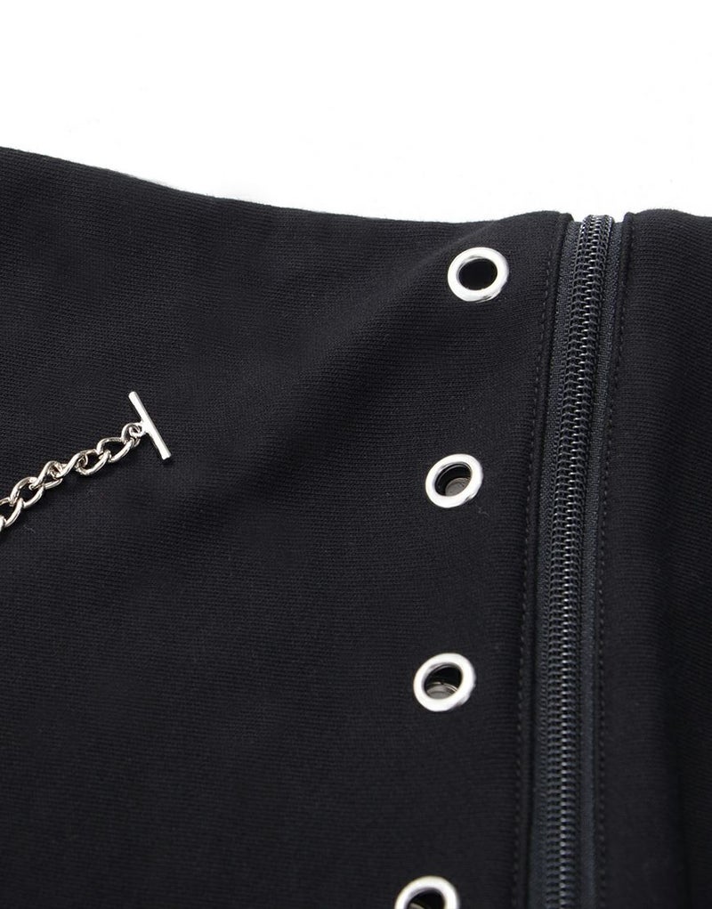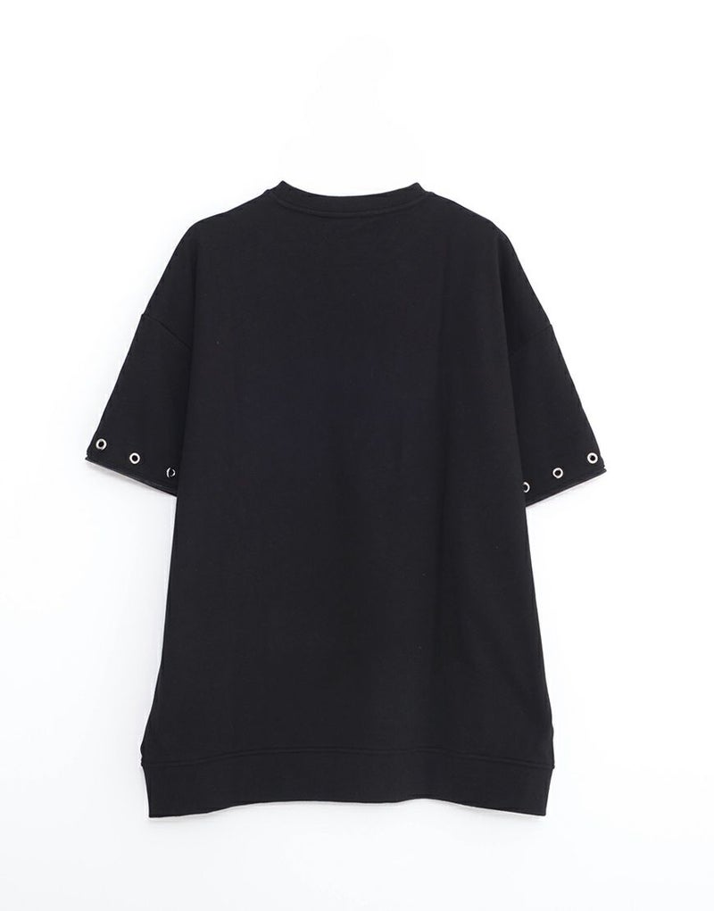 繊細なタッチのプリントはインパクト抜群。更にフロントネックのリングと袖のアイレットをチェーンで繋げた装飾と拘りのディテールとなっています。