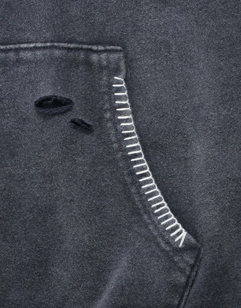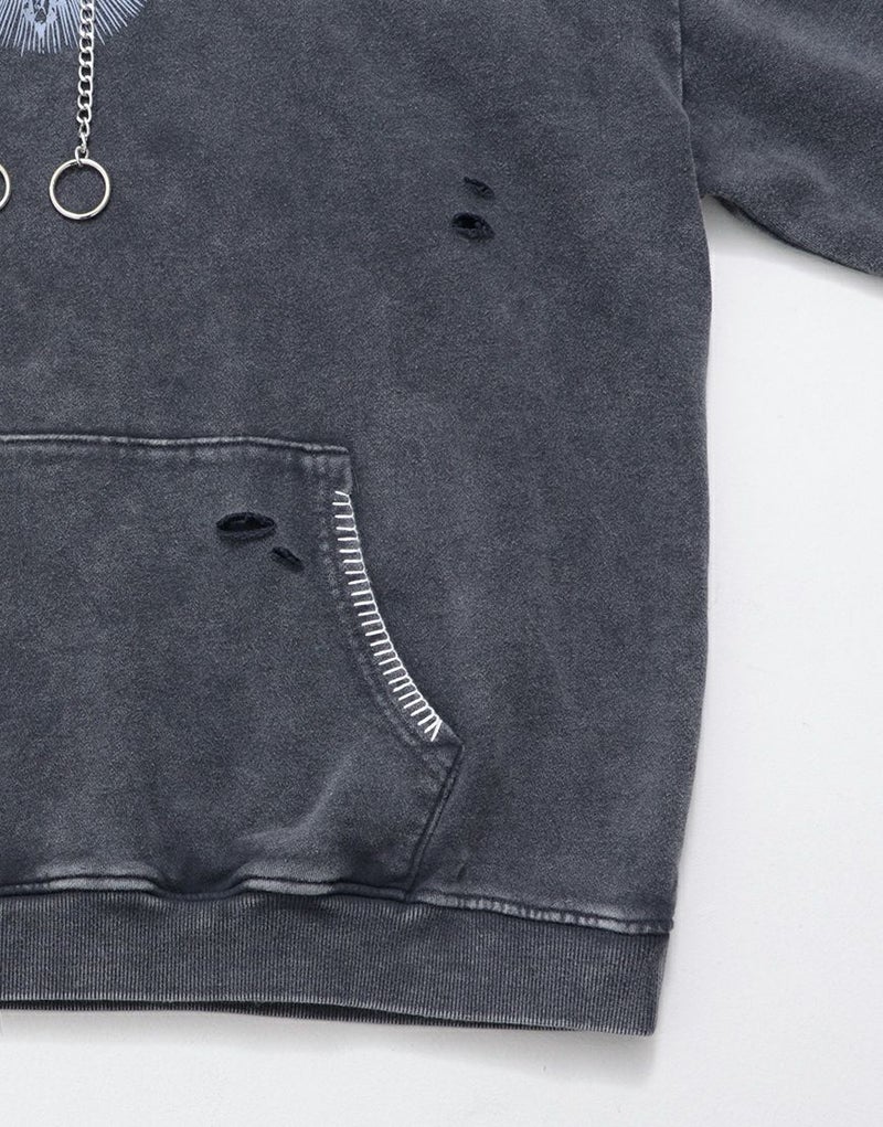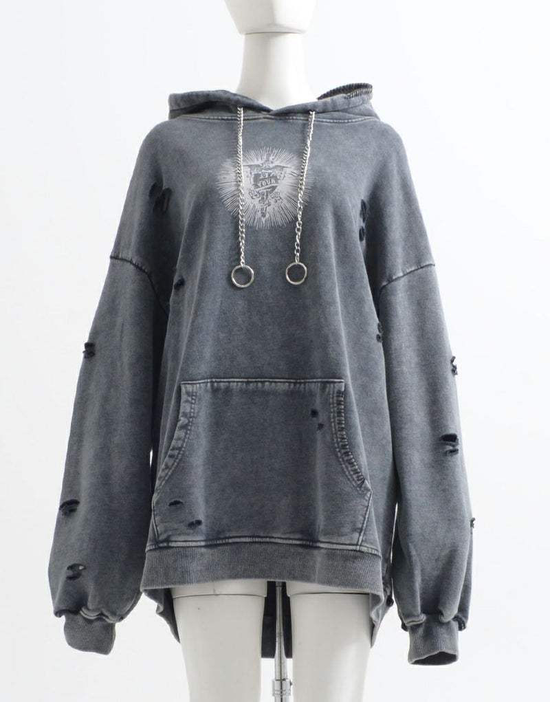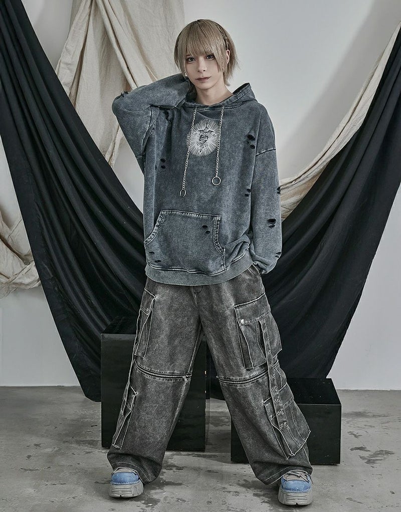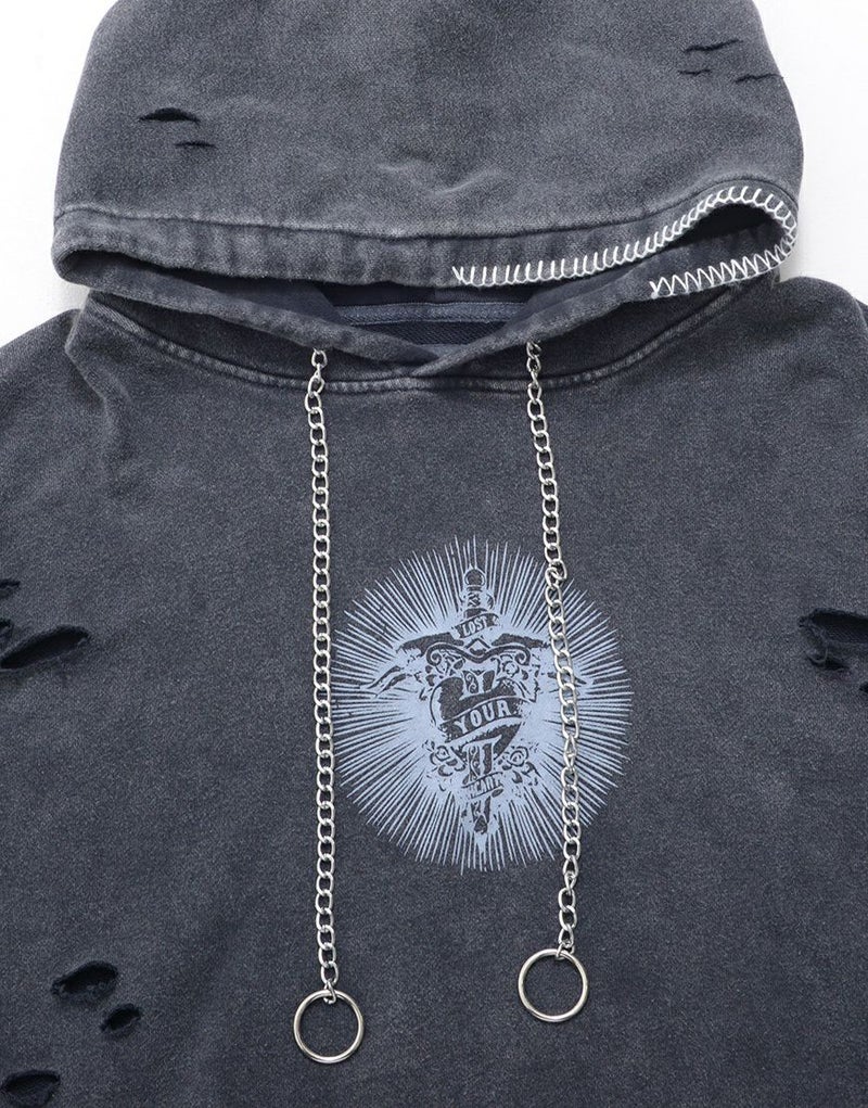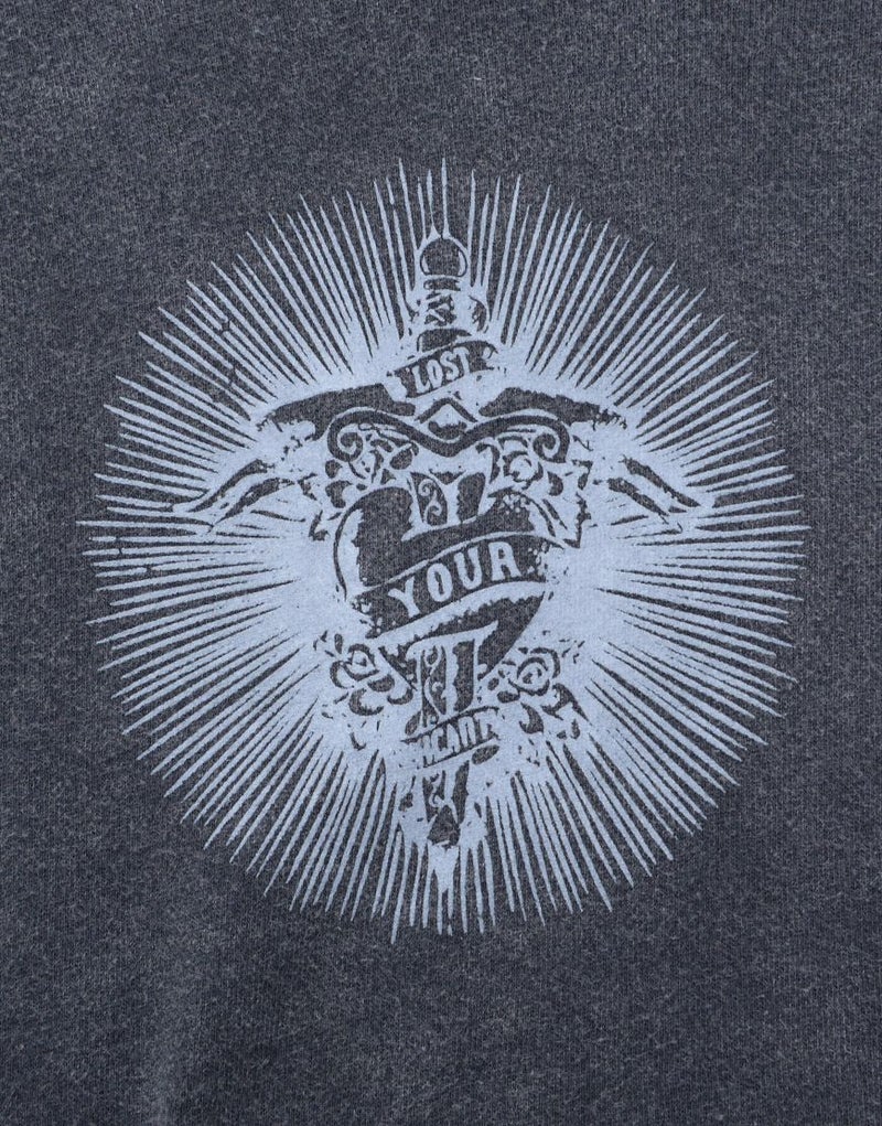 ililil【イルイルイル】よりlost your heartクラッシュ加工パーカーが登場です。 フロントにダガーハートグラフィックがされたプルオーバーパーカー。 所々にダメージ加工を施しヴィンテージ感を演出。ポイントでポケットや袖、フードの配色ステッチデザインと更にドローコードのリングチェーンがアクセントに。 ビッグシルエットでメンズ、レディースを問わず、ユニセックスでご着用頂ける一押しパーカーです。