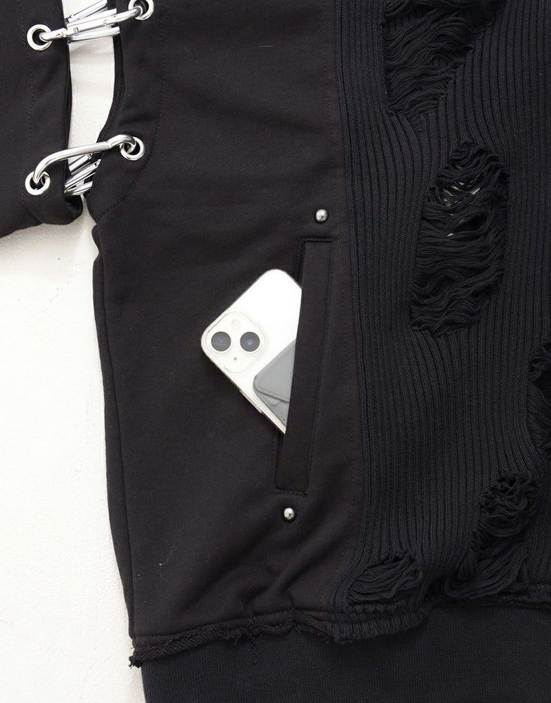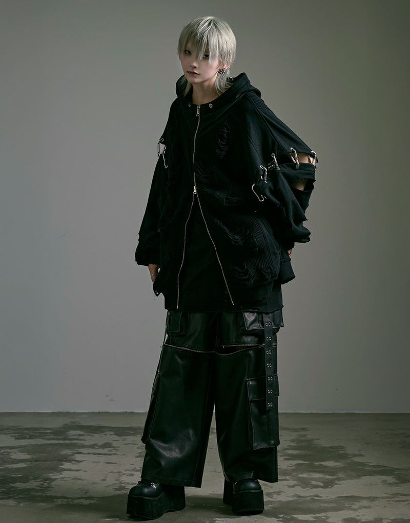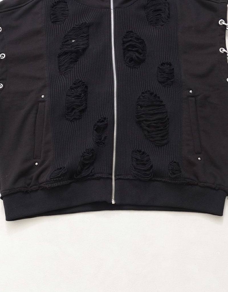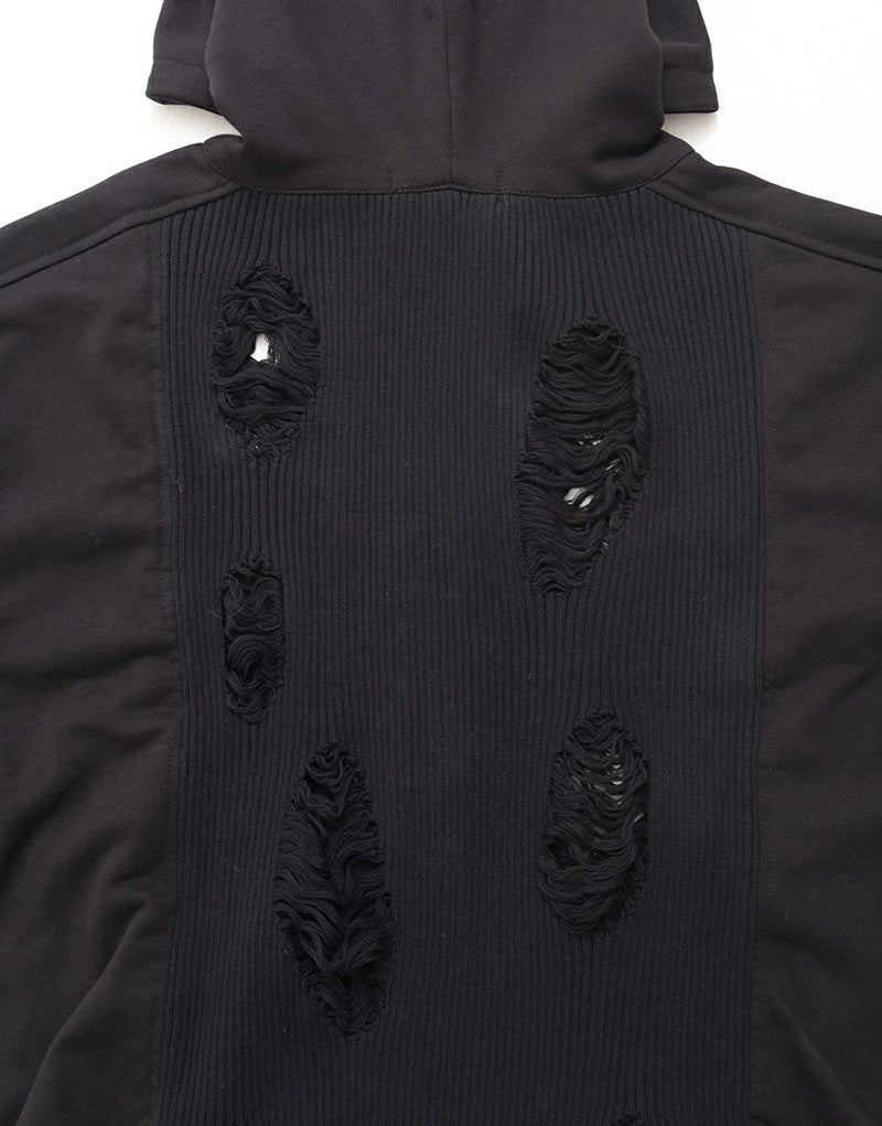 ラフなダメージ加工が施されたニット部分が、退廃的なムードを漂わせる一着です。