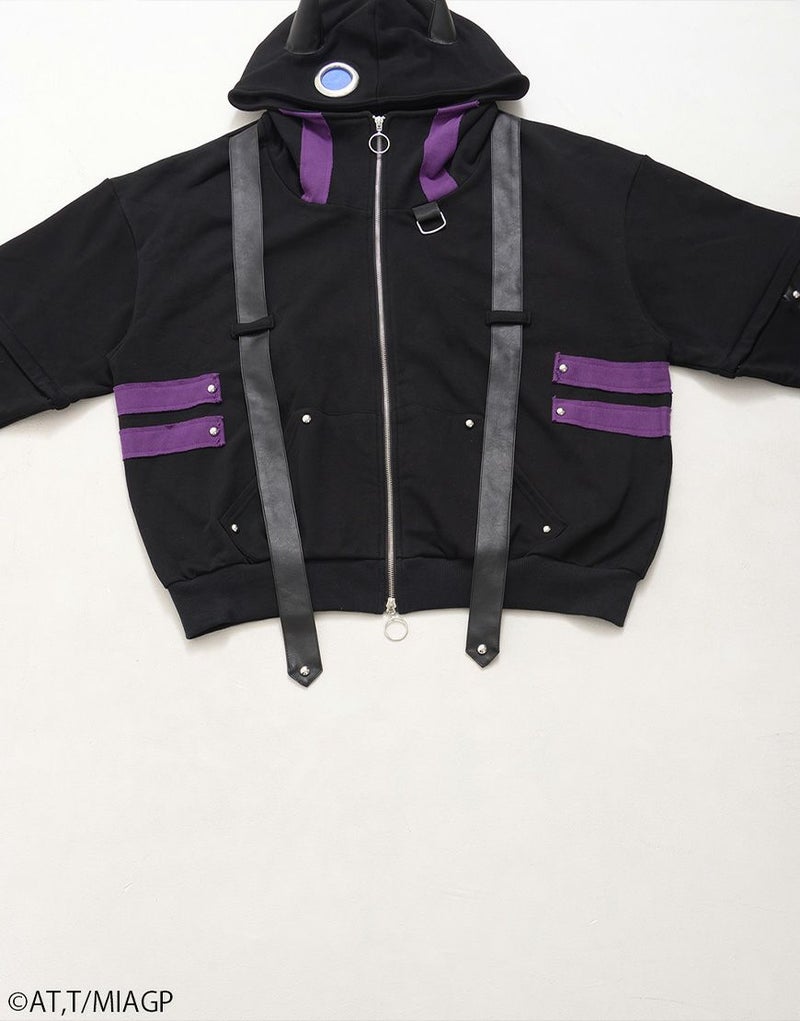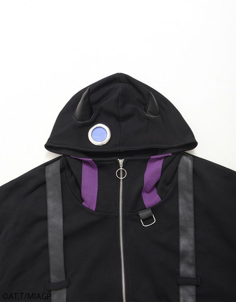 フード後部には角のような突起パーツとレンズモチーフを配置し、レグの機械的な要素をファッションへと昇華。