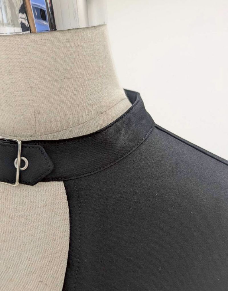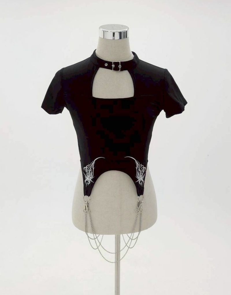 首元のチョーカー風デザインに、ゆるく揺れる3連のチェーンを組み合わせた