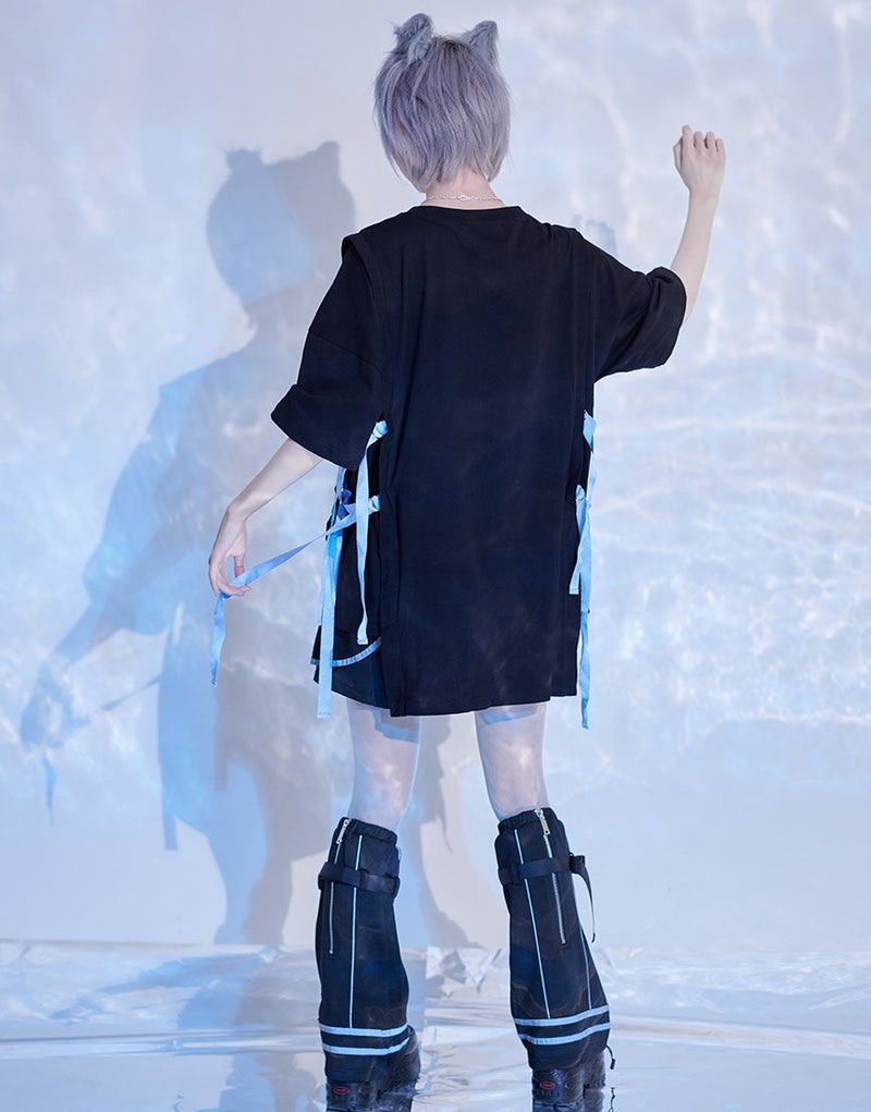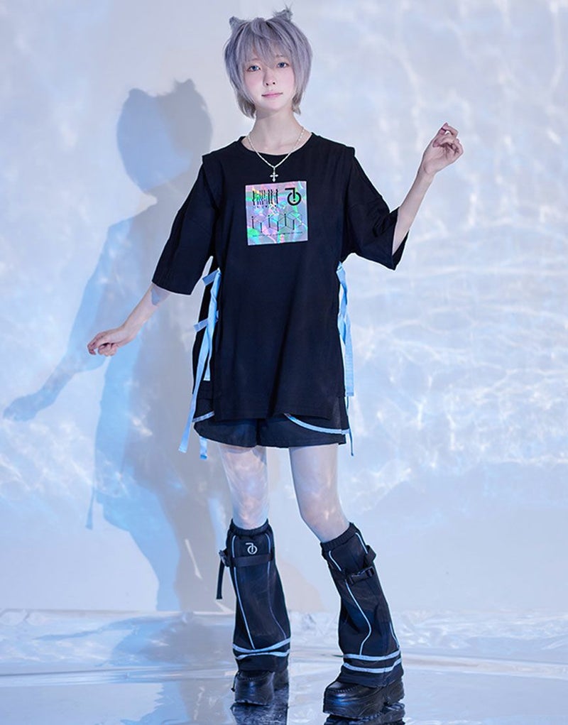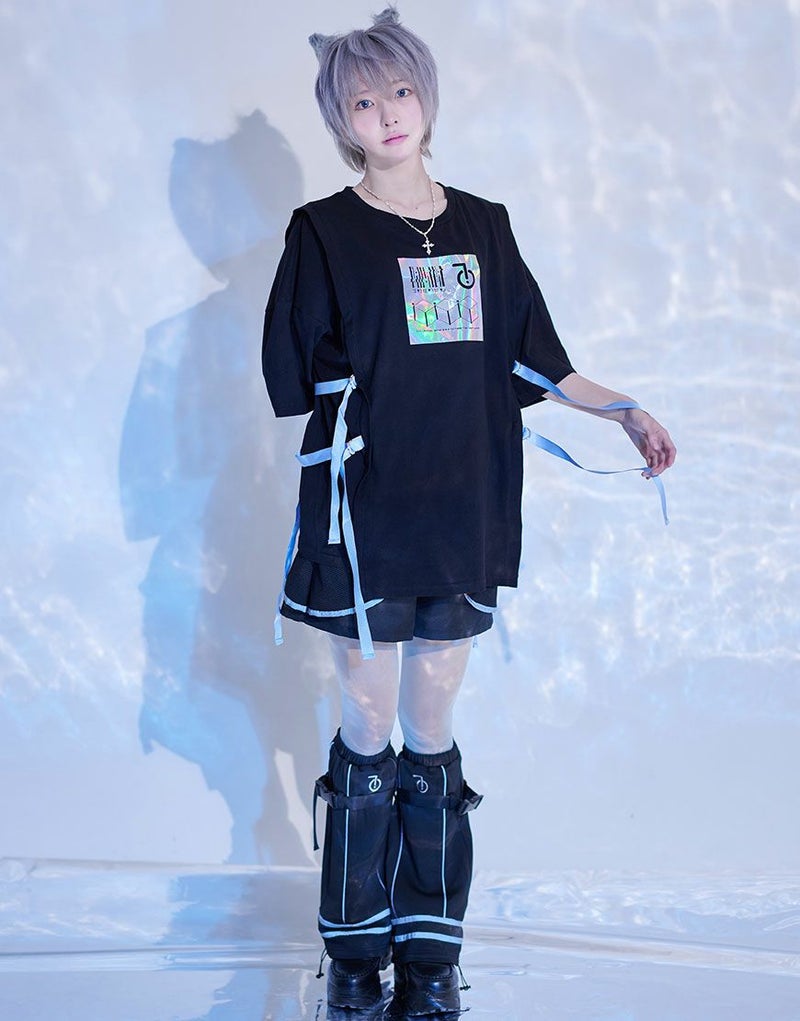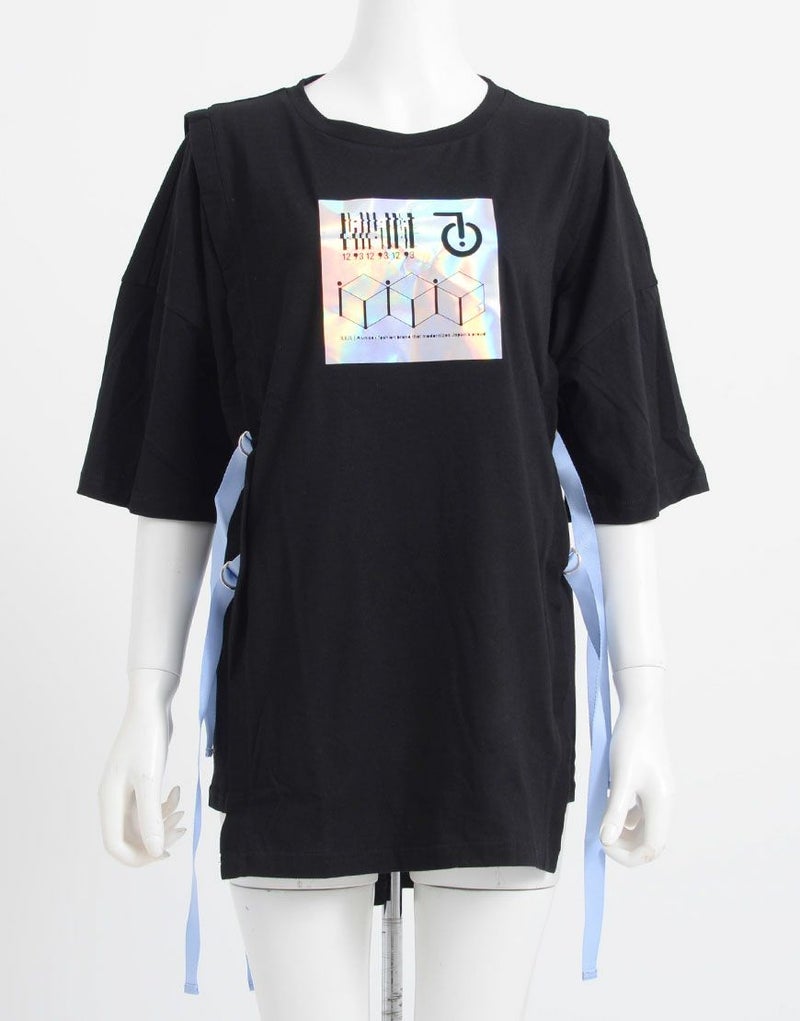 ililil【イルイルイル】よりぴかぴかホログラムTシャツが登場です。 フロントにオーロラ箔による大判ロゴプリントが施されたカットソー。 両サイドにデザインされた2連のベルトがアクセントに 前後で丈の長さが違うのもポイント♪ オーバーサイズで仕上げメンズ、レディースを問わず、ユニセックスで着用可能です。 #Tシャツ #半袖 #プリント #cyber #サイバー #天使界隈 #ユニセックス #ジェンダーレス