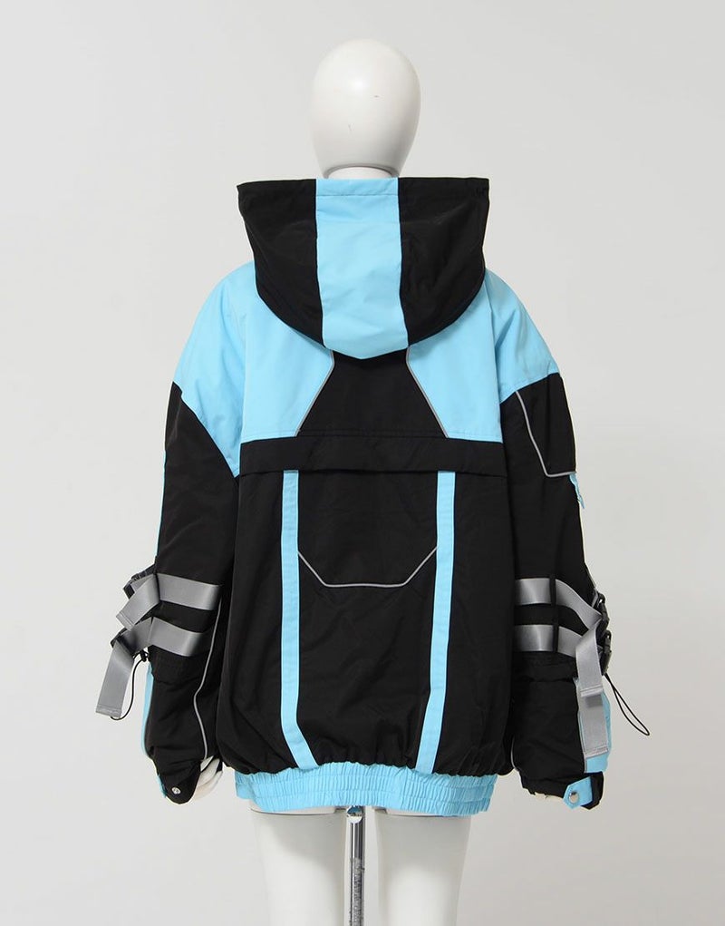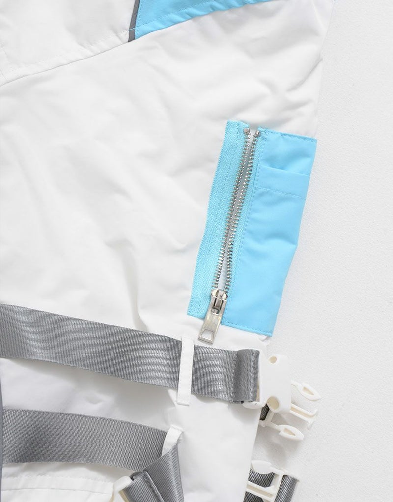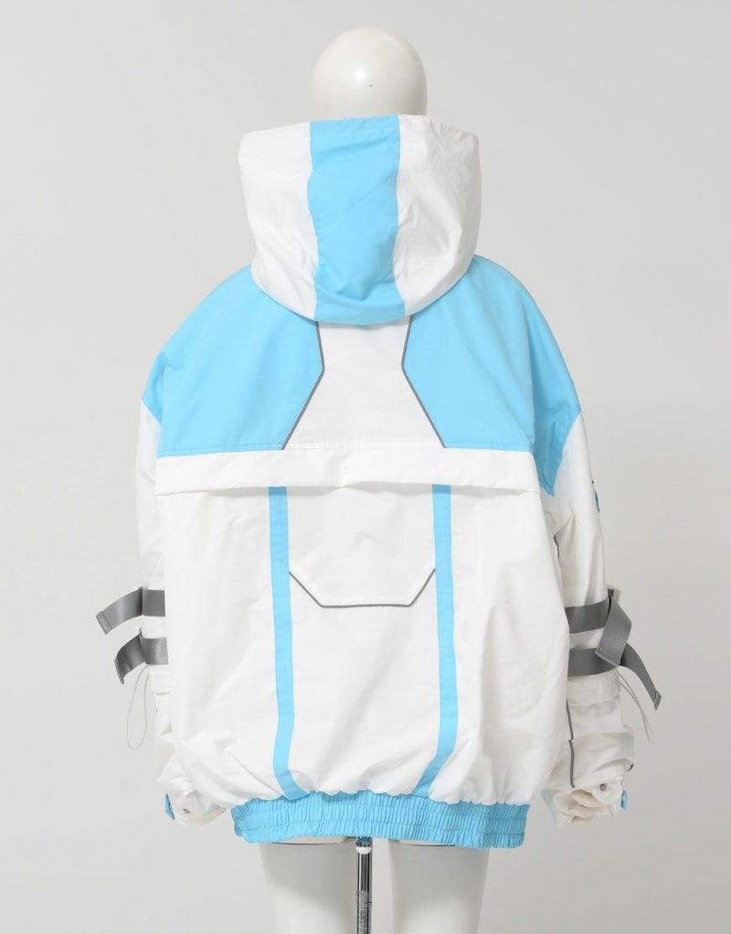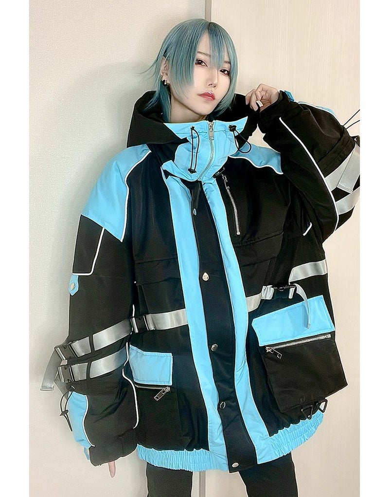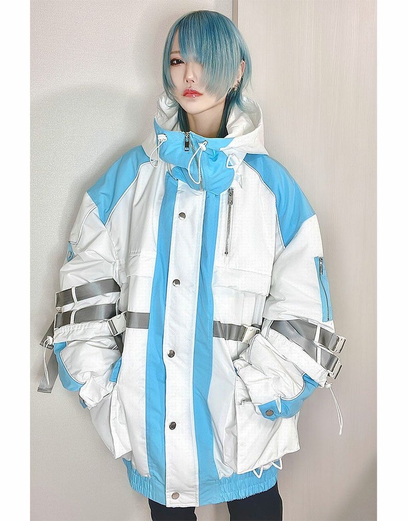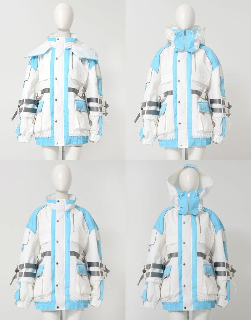フロントと袖にはフェイクベルトを配置しサイバー感を演出。