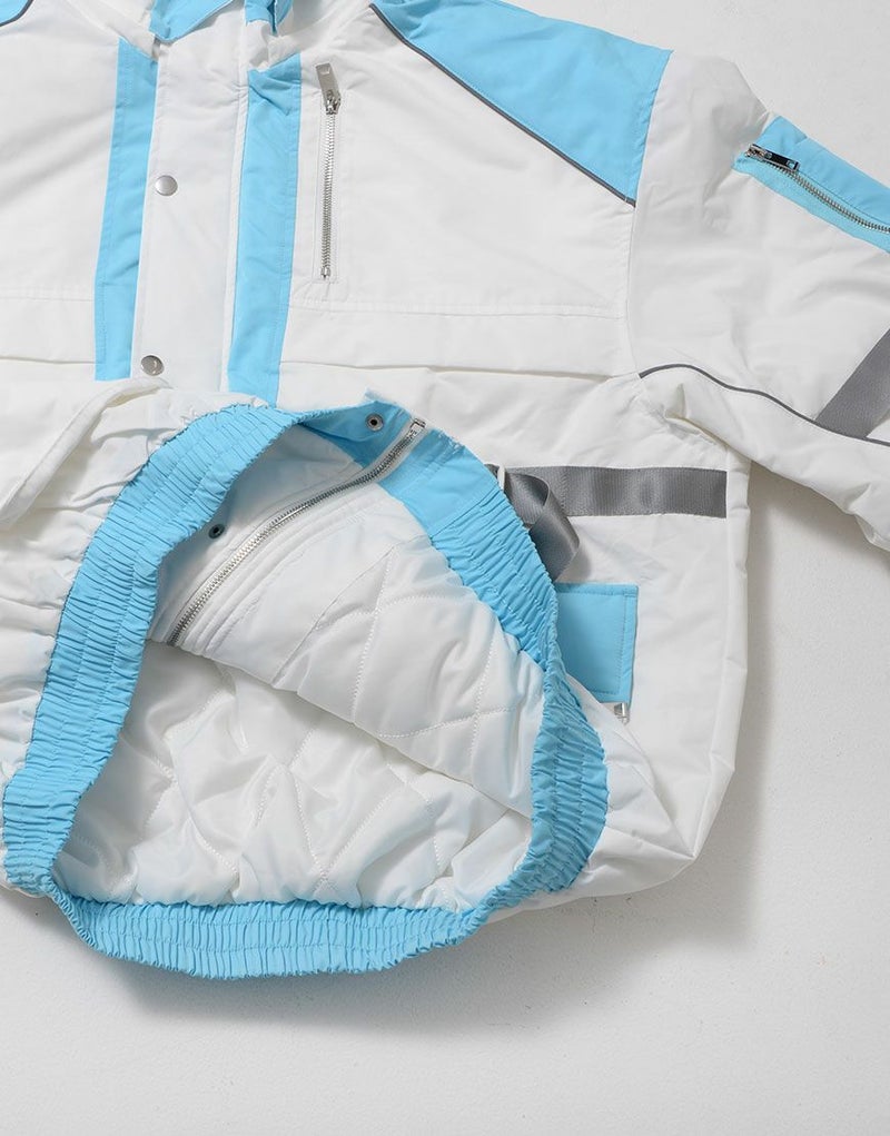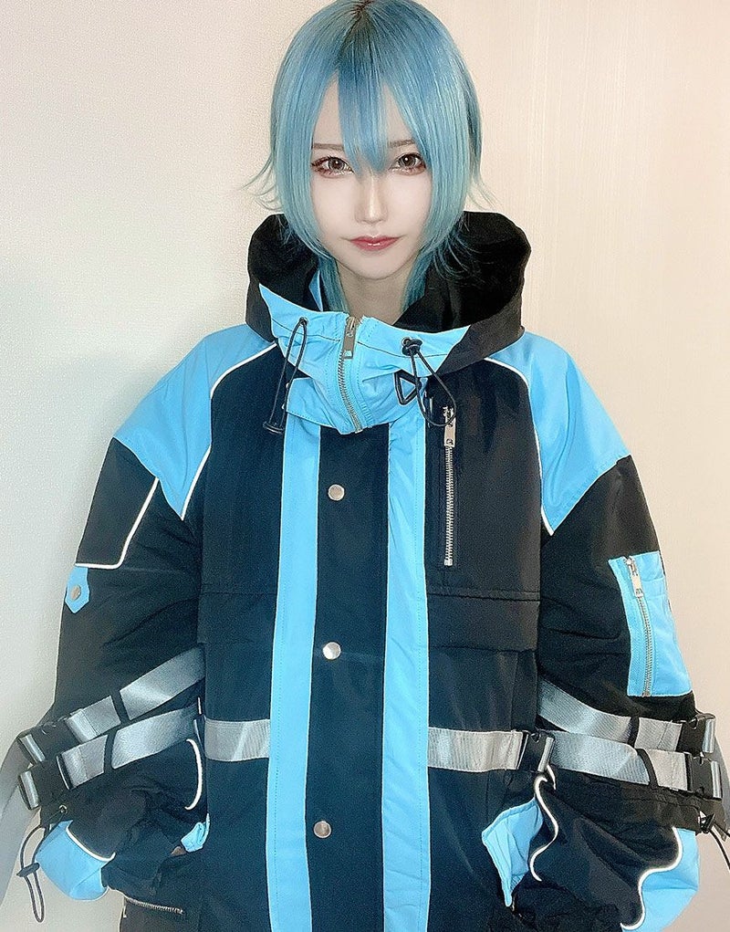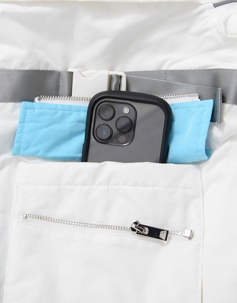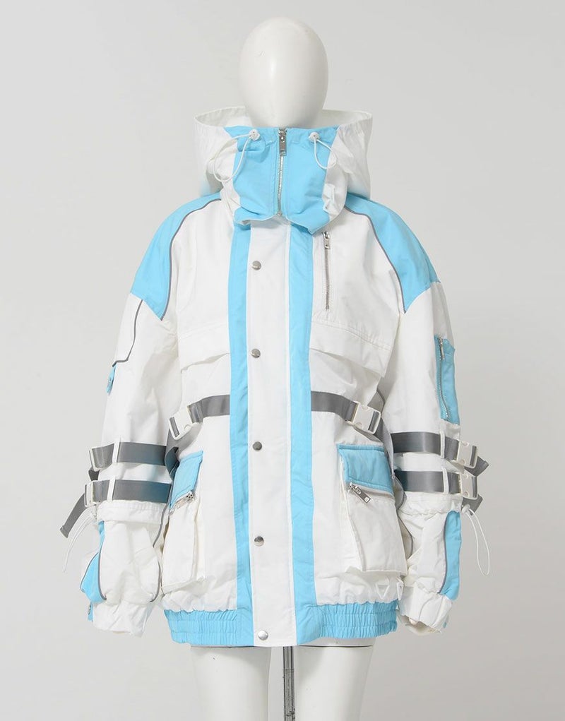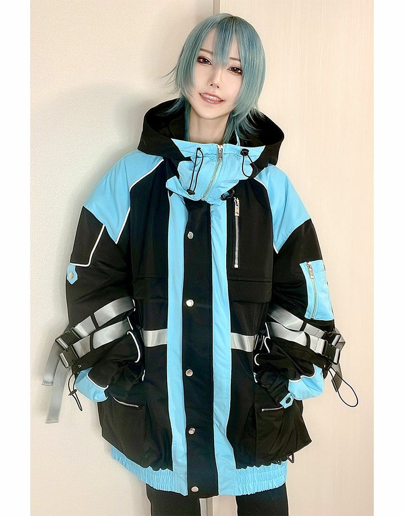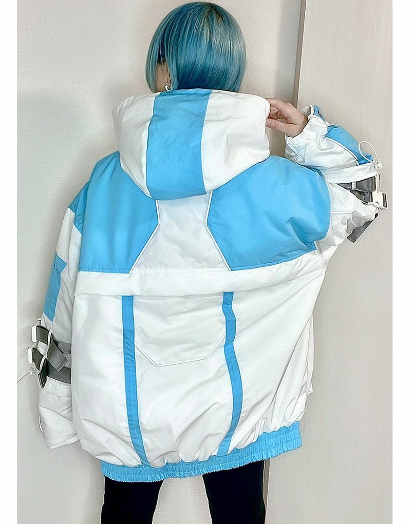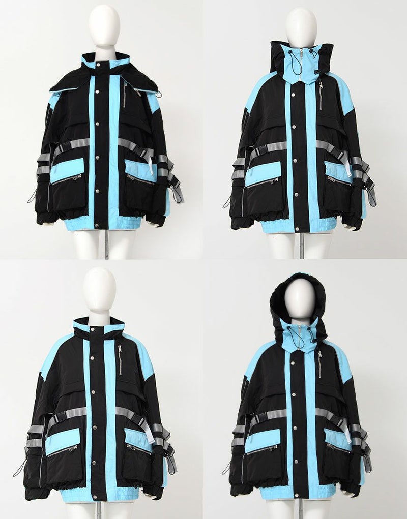 フロントと袖にはフェイクベルトを配置しサイバー感を演出。