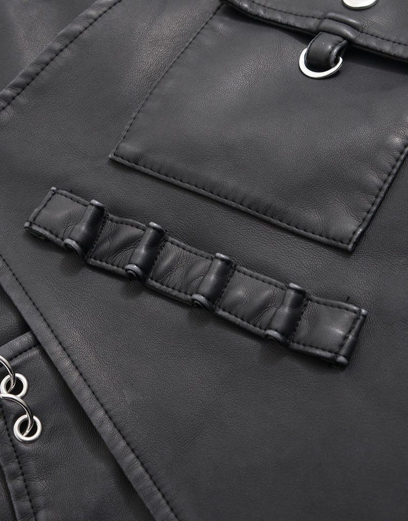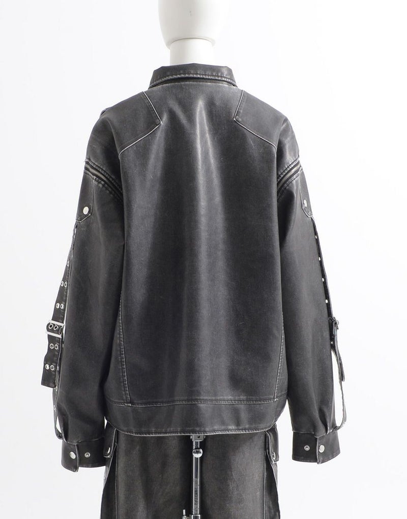 更に袖、フロントポケット、襟先など各所に同様のメタルパーツやダブルアイレットのベルトが