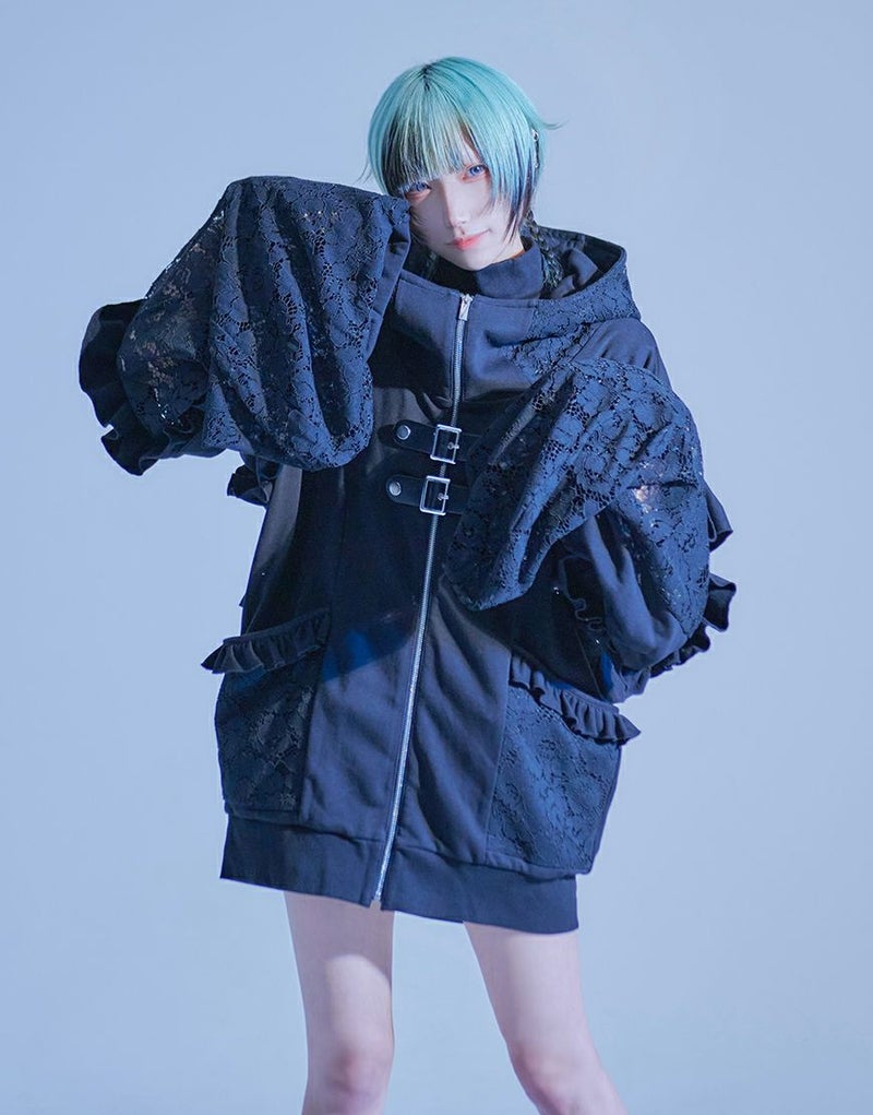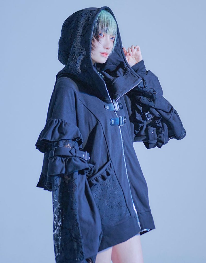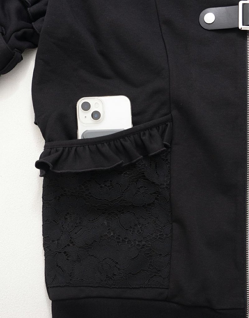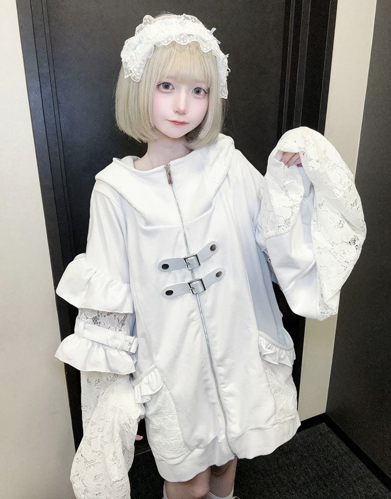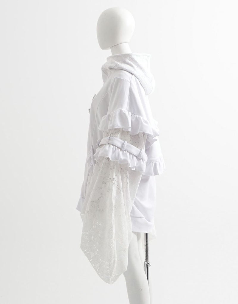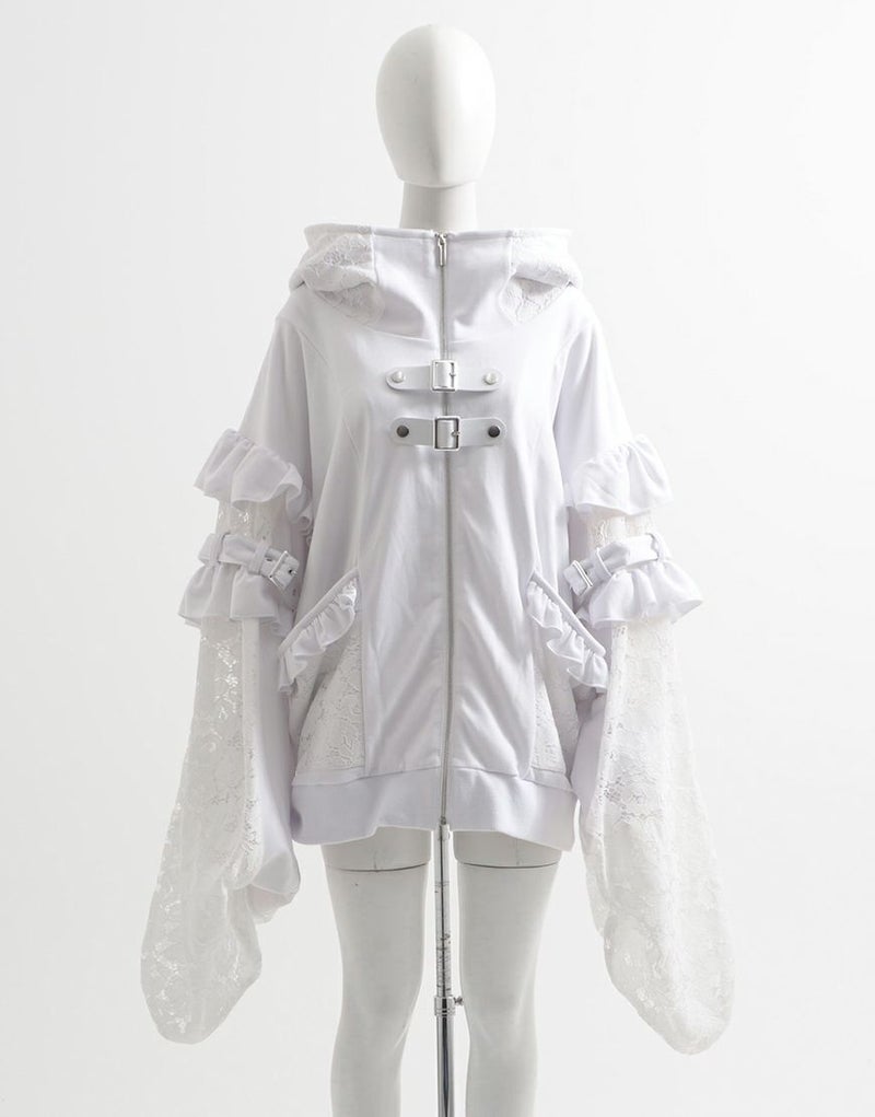 繊細なレースと共地フリルをたっぷりあしらった、華やかなパーカーデザイン。