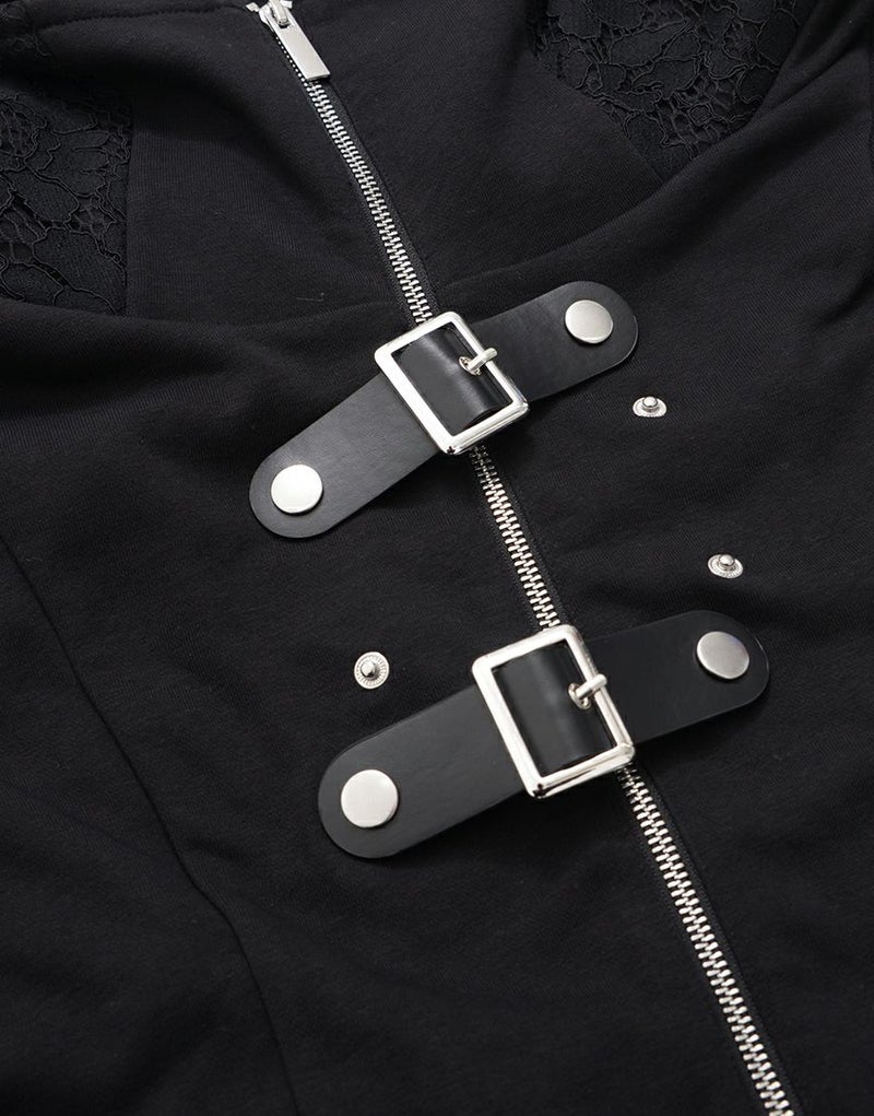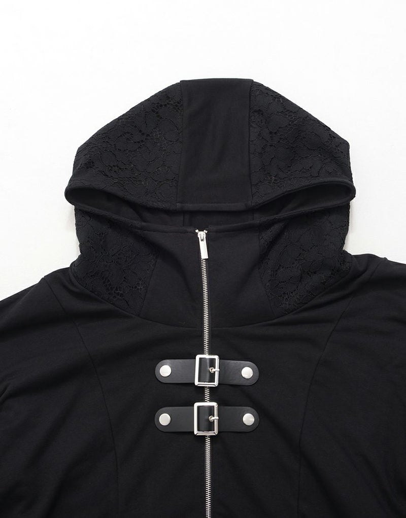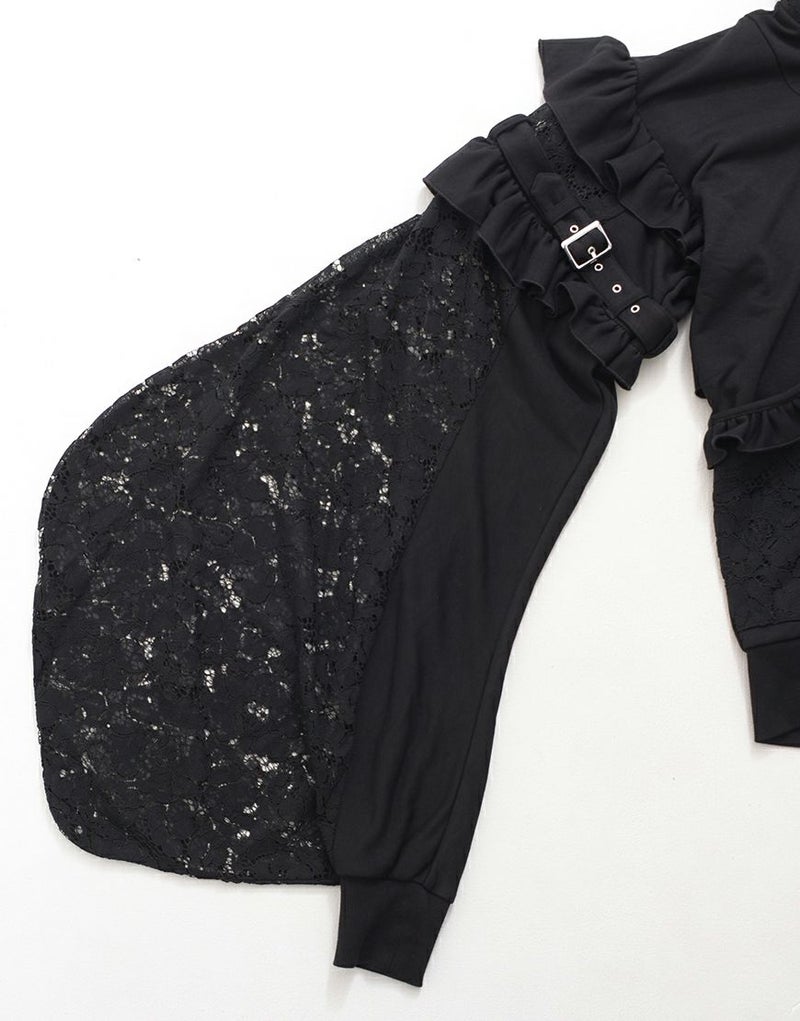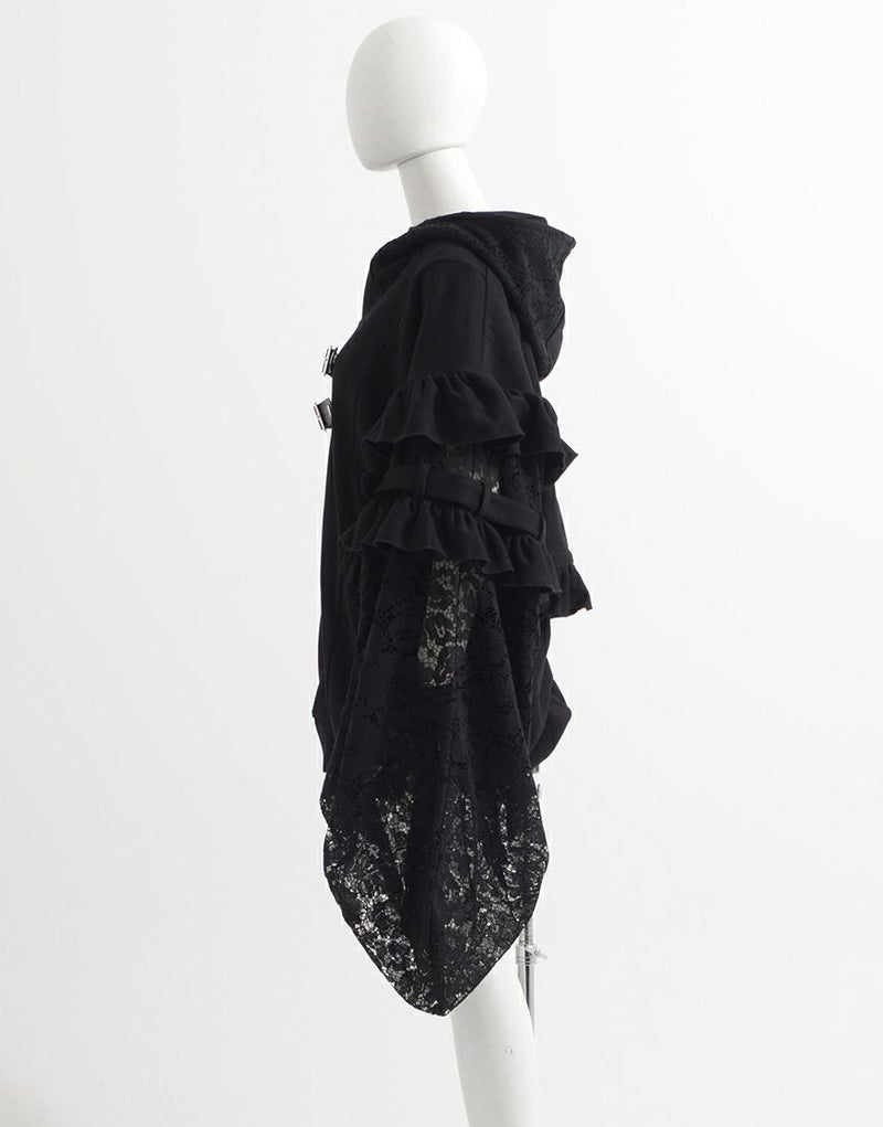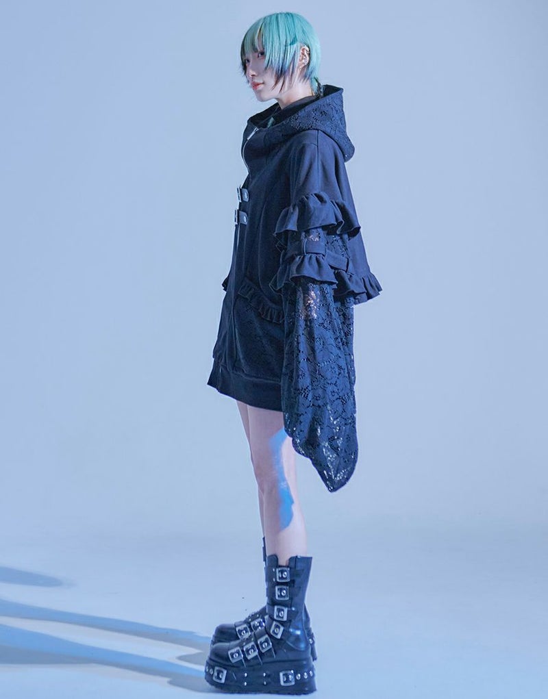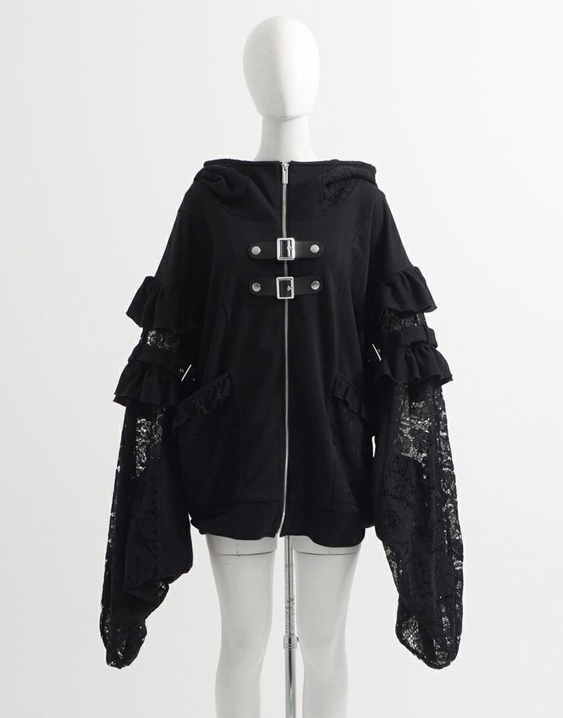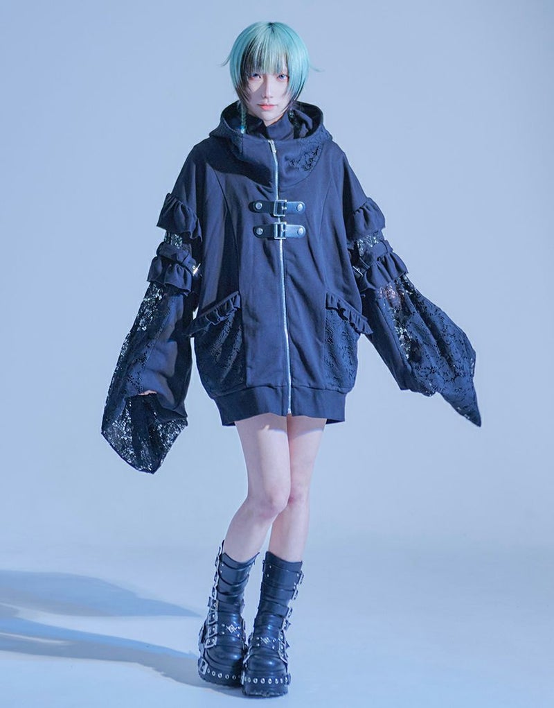 繊細なレースと共地フリルをたっぷりあしらった、華やかなパーカーデザイン。