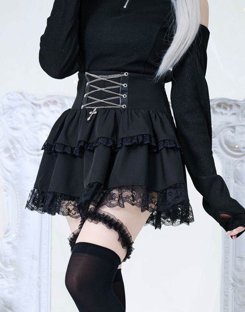 ウエストのチェーン編み上げデザインがポイントのガーター付きティアードスカート。