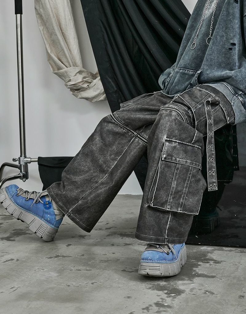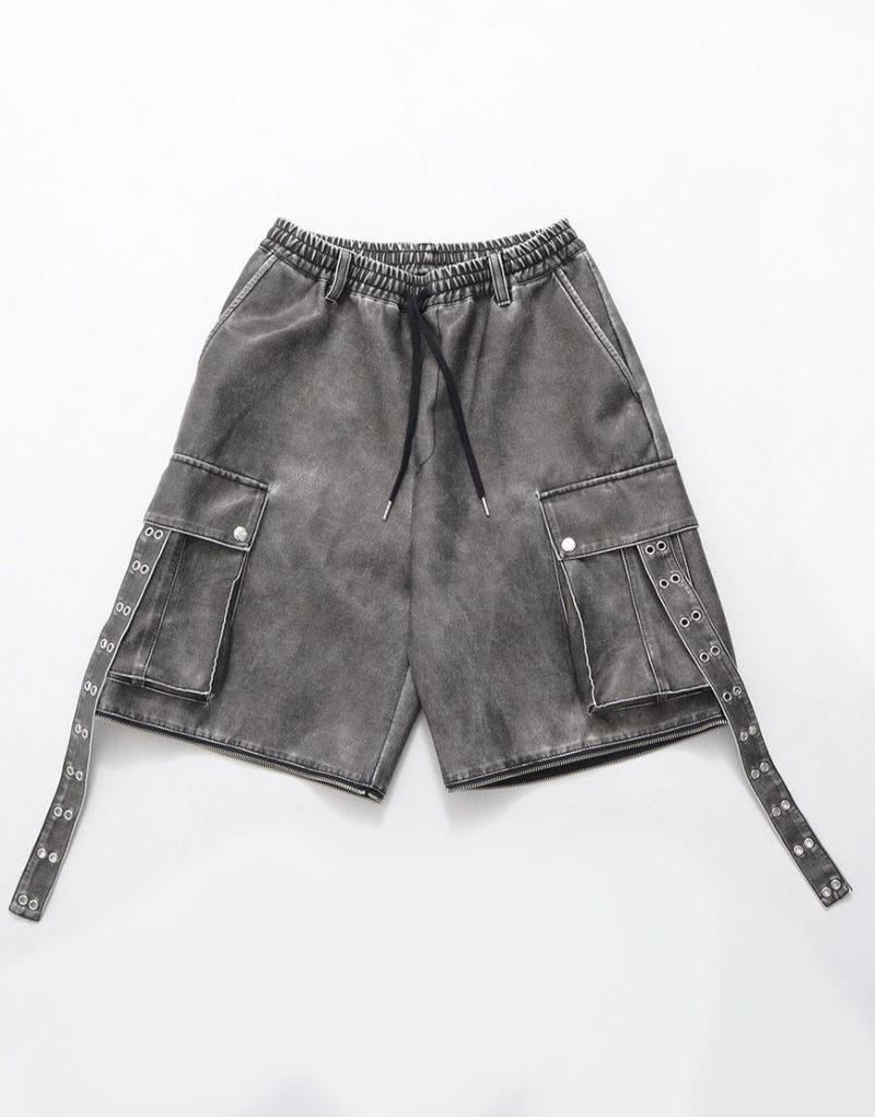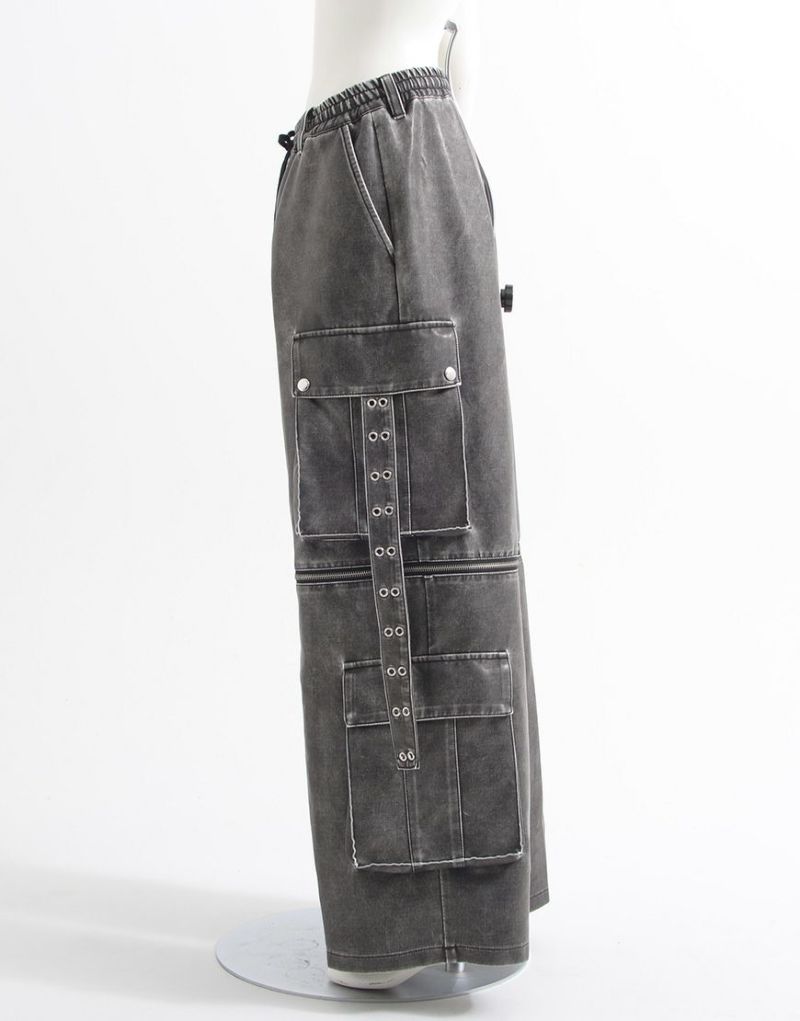 サイドのカーゴポケットにメタルパーツやダブルハトメベルトで装飾を施し、