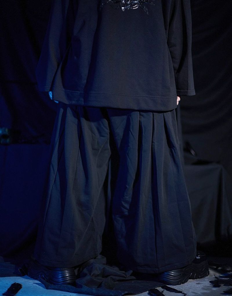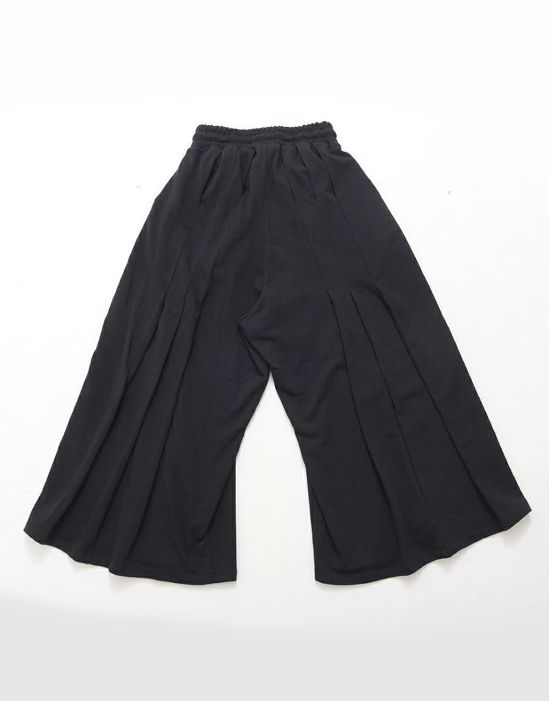 ◆裾が大きく広がったワイドシルエットの袴風パンツ。