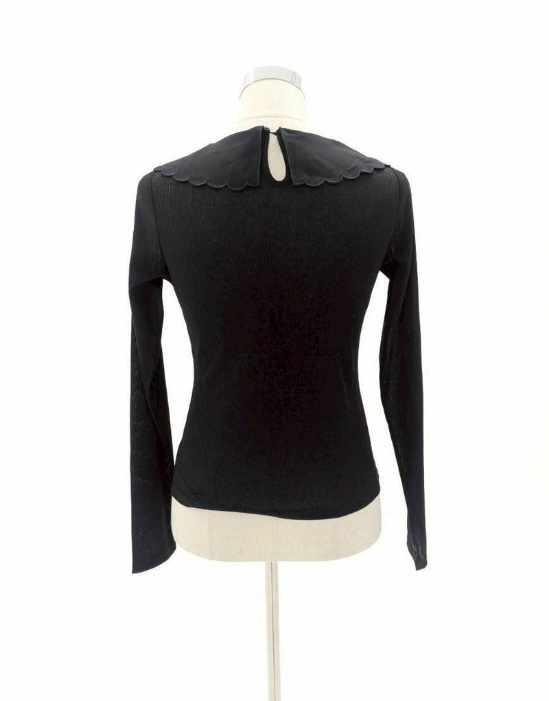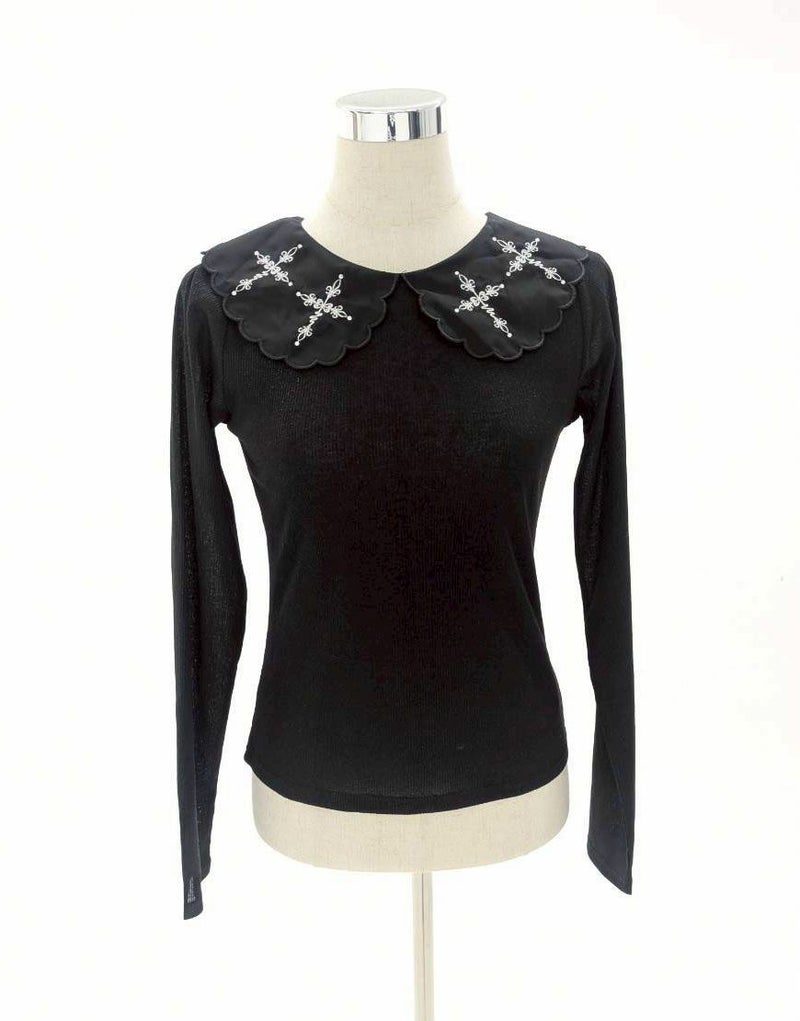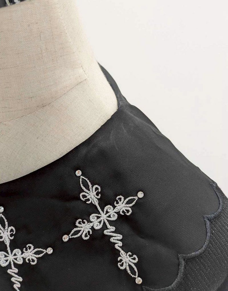 存在感たっぷりの大きなスカラップ襟には、銀糸のクロス刺繍とラインストーンがあしらわれており、首元を華やかに彩ります。