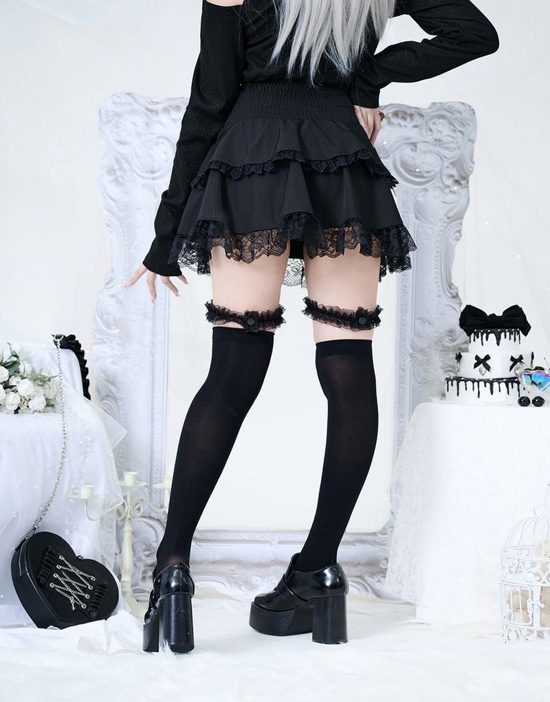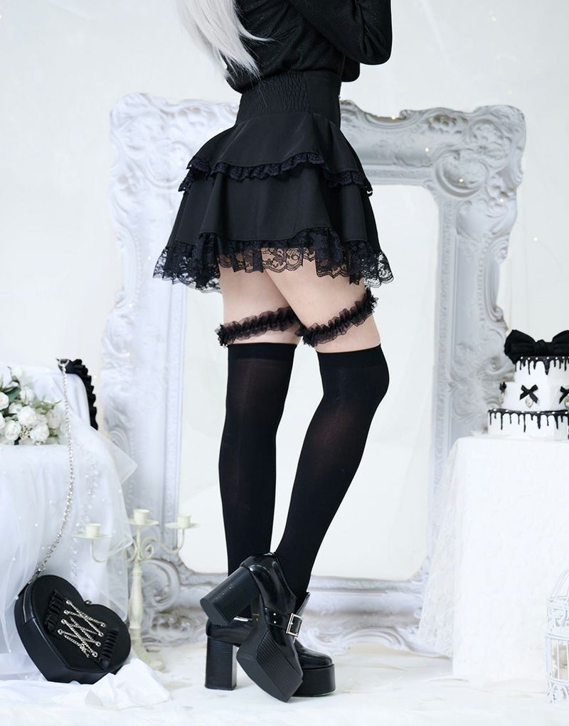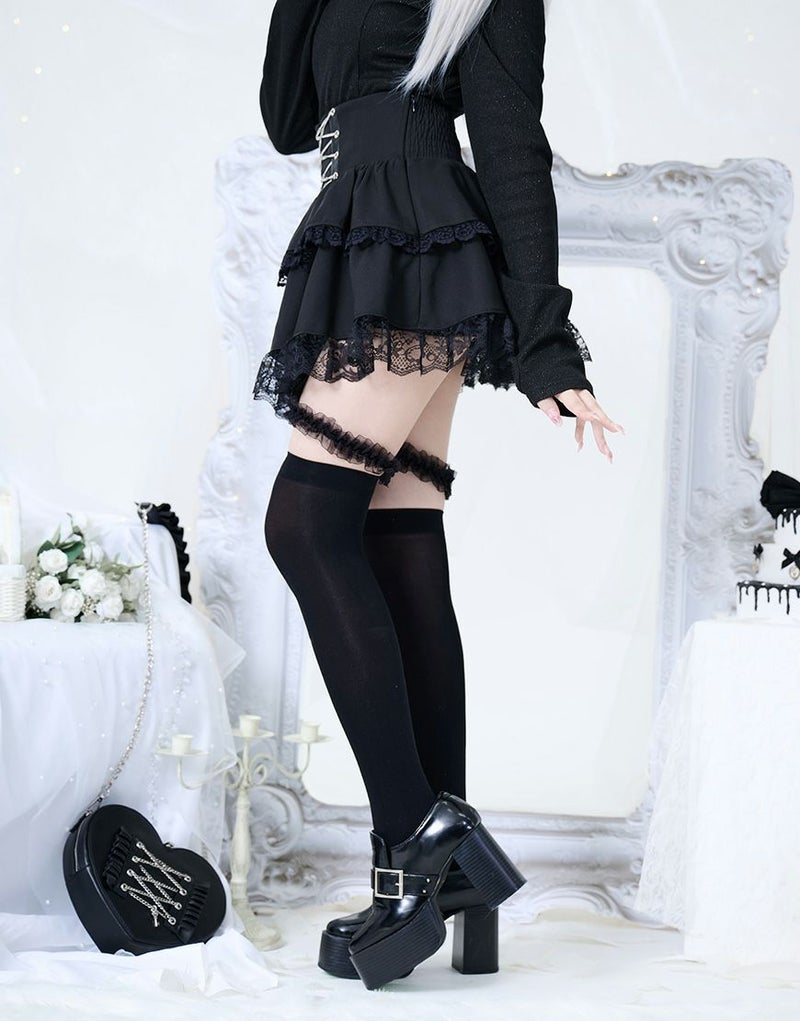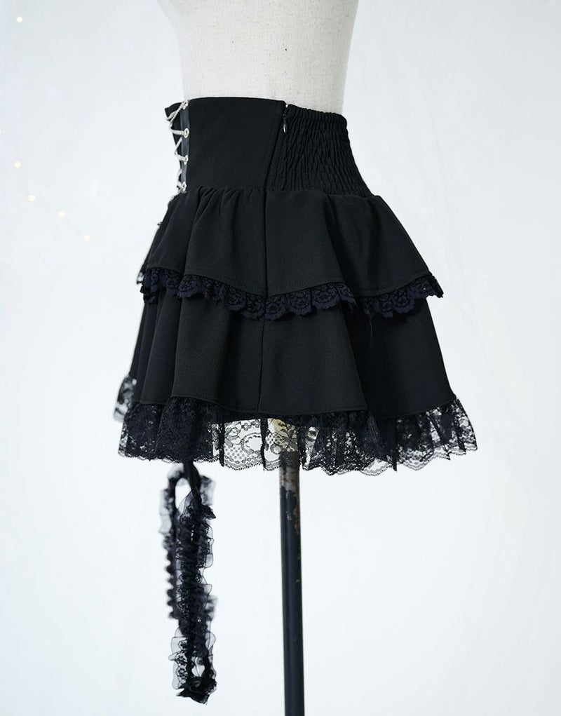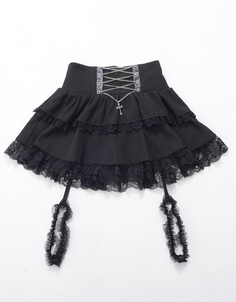 ウエストのチェーン編み上げデザインがポイントのガーター付きティアードスカート。