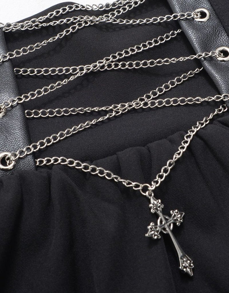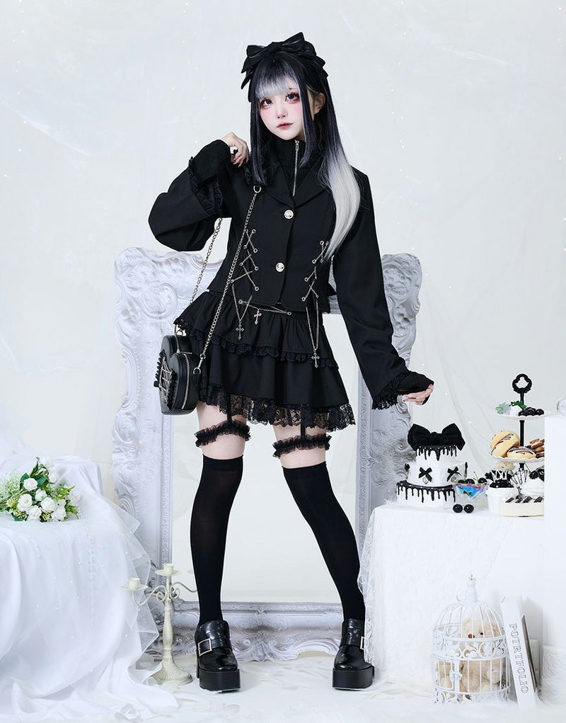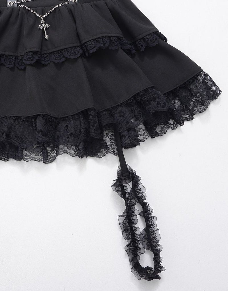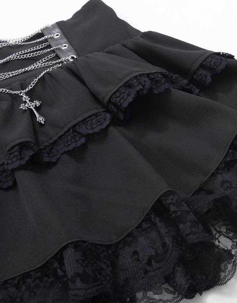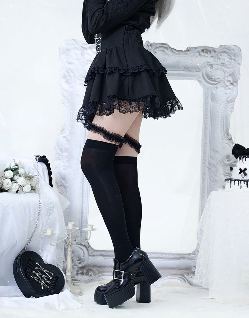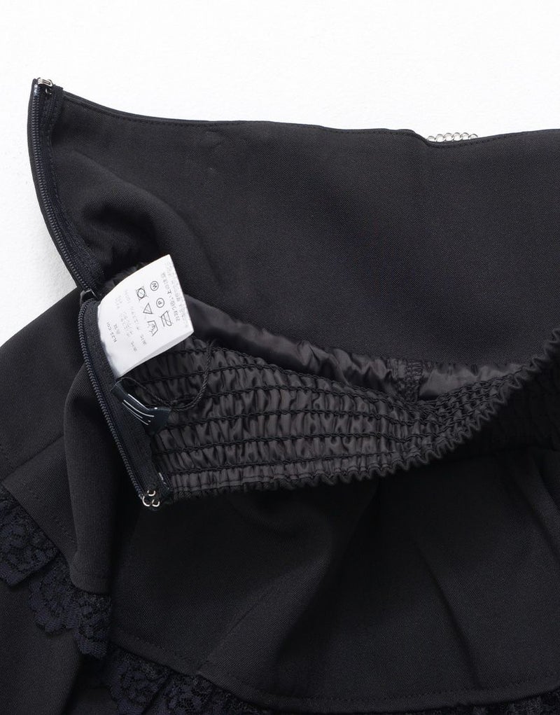 ウエストのチェーン編み上げデザインがポイントのガーター付きティアードスカート。