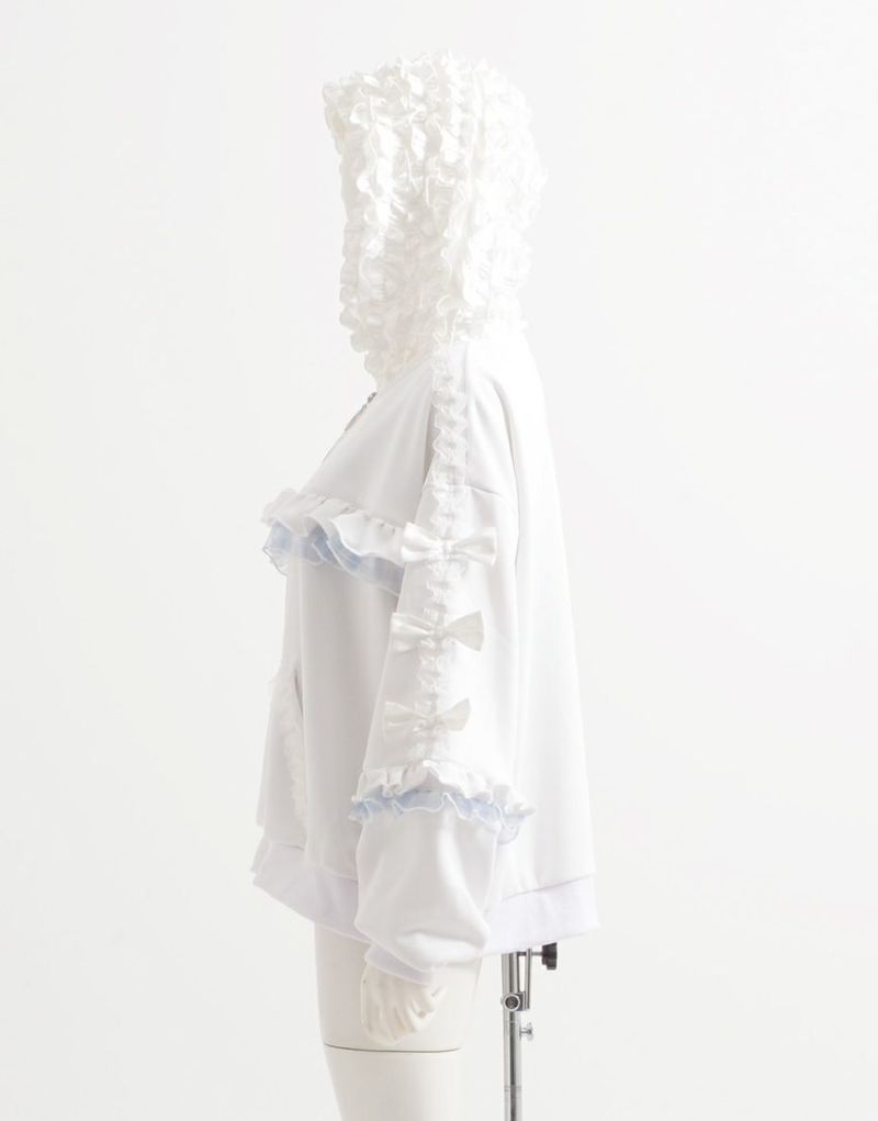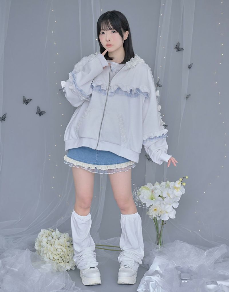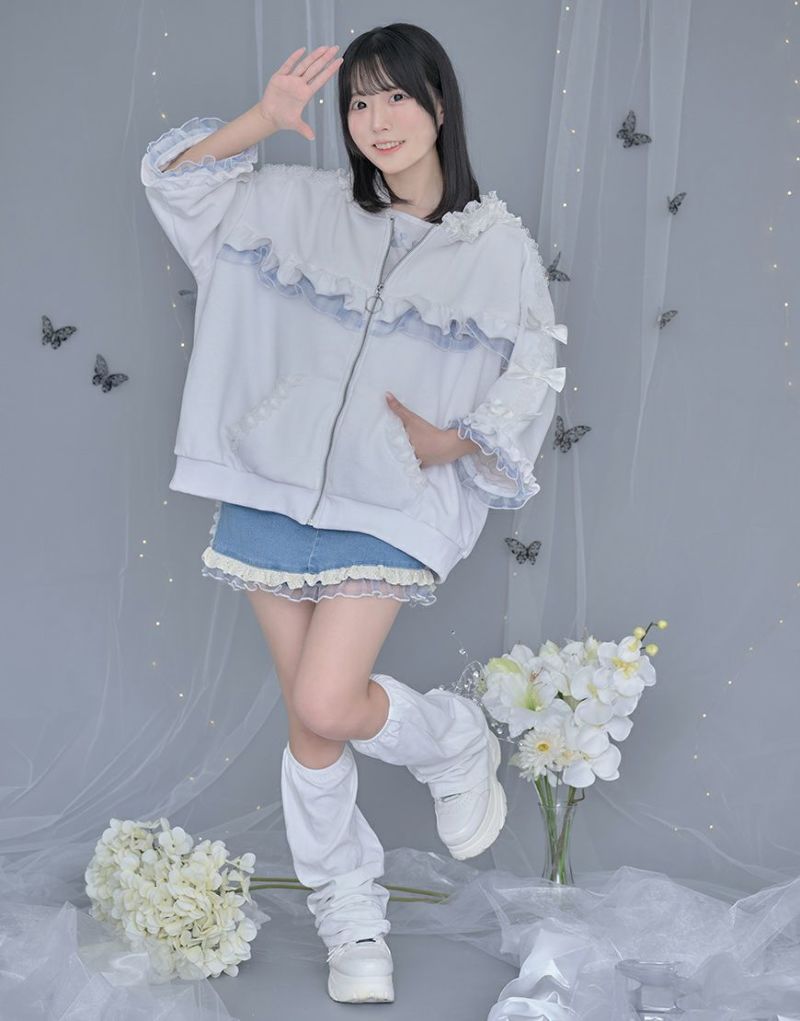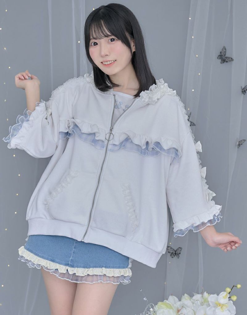 ililil【イルイルイル】より生クリームフリルのバブみ全開2wayパーカーが登場です。 まるで生クリームみたいなふわふわフードが主役 共地フリルと淡いチェックシフォンが、さりげない甘さを添えてくれるジップパーカー。 お袖は取り外しOKで、気分や季節に合わせてアレンジ自在♪ 「天使界隈さん」や「ゆめかわさん」にぴったりな、やさしいホワイトの一枚です。
