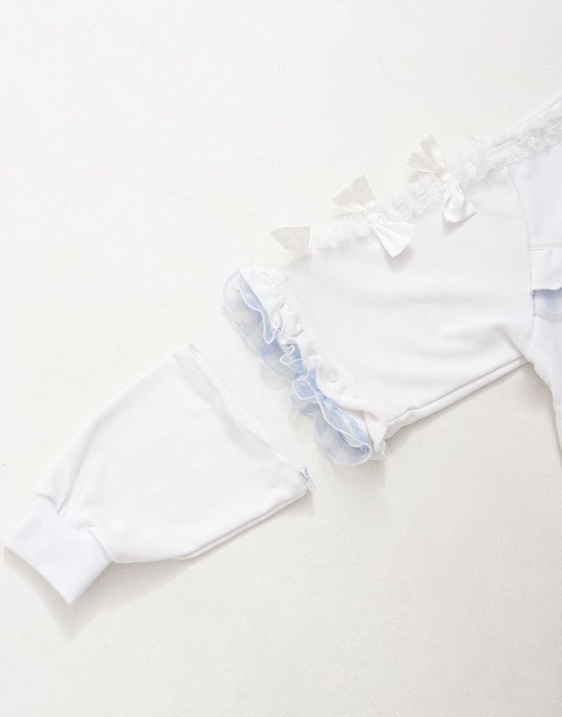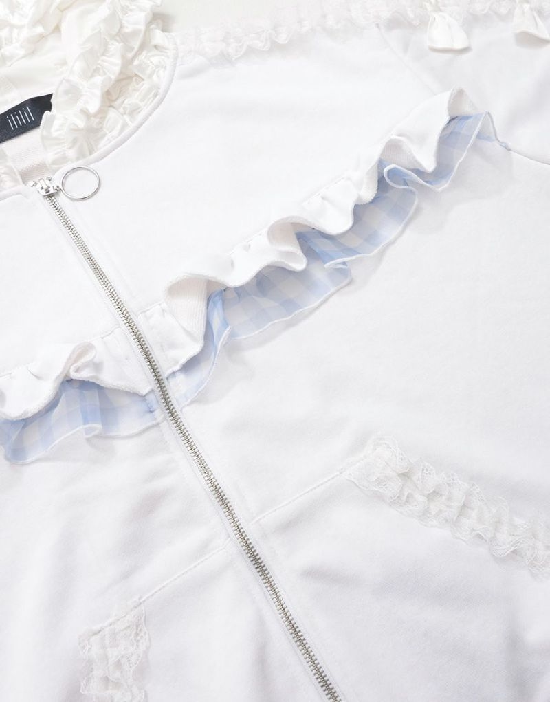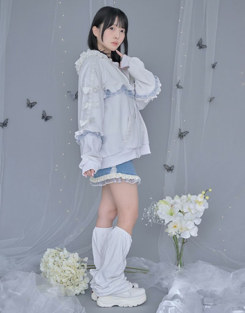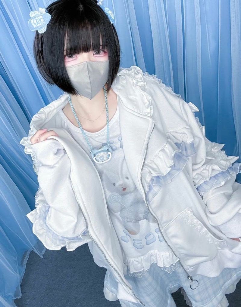 ililil【イルイルイル】より生クリームフリルのバブみ全開2wayパーカーが登場です。 まるで生クリームみたいなふわふわフードが主役 共地フリルと淡いチェックシフォンが、さりげない甘さを添えてくれるジップパーカー。 お袖は取り外しOKで、気分や季節に合わせてアレンジ自在♪ 「天使界隈さん」や「ゆめかわさん」にぴったりな、やさしいホワイトの一枚です。