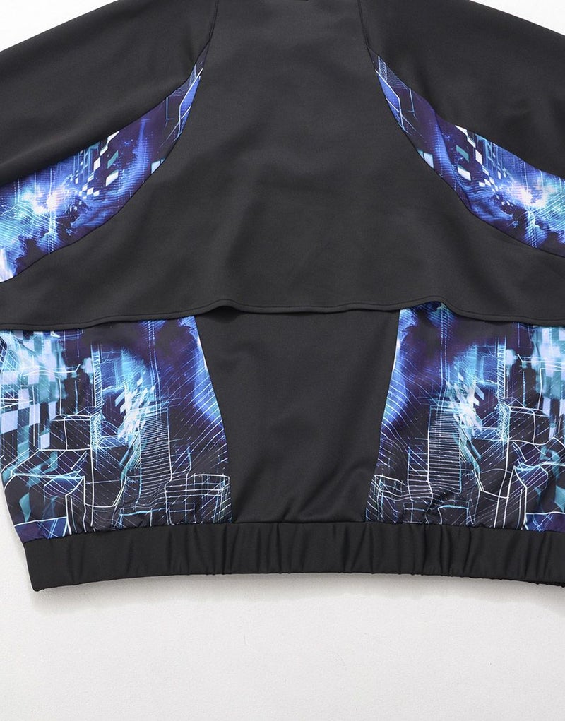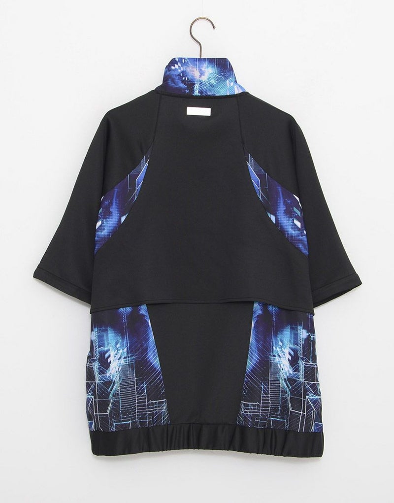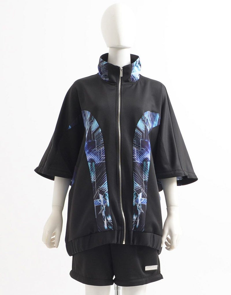 ブルーのグラフィック切替が目を引く、ジップ仕様のジャージトップス。
