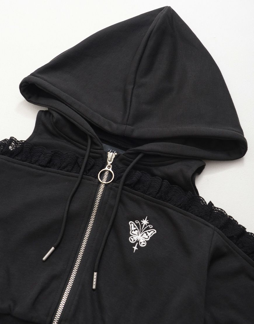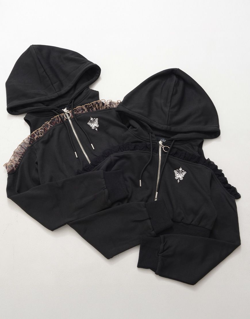 パーカー:肩あき×フリル♡ 胸元ワンポイント刺繍♪ ショート丈で脚長効果◎
