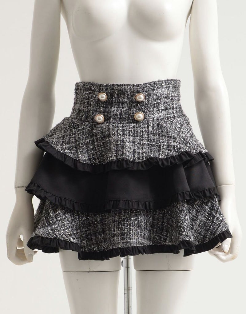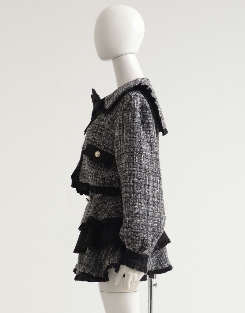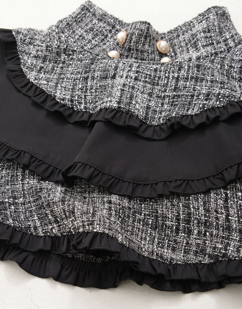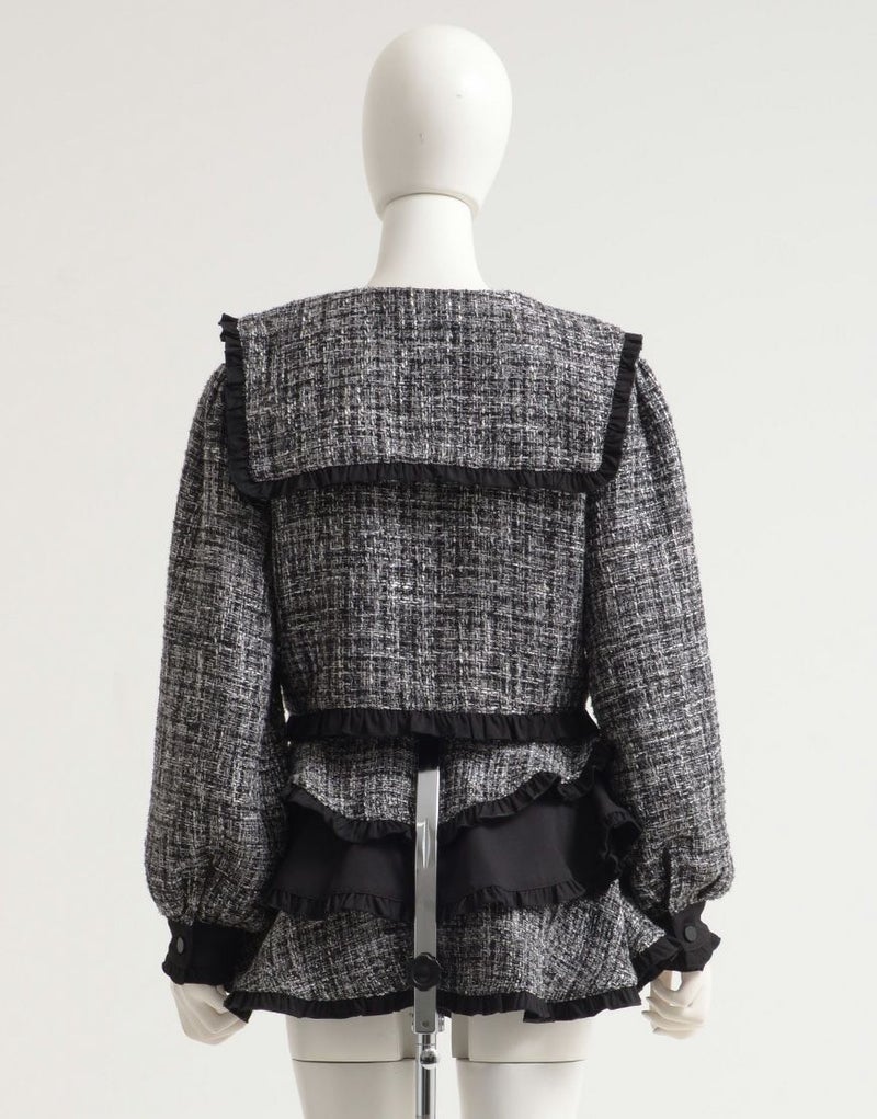 クラシカルなチェックツイードに、フリルとパールボタンを重ねたガーリーデザイン。