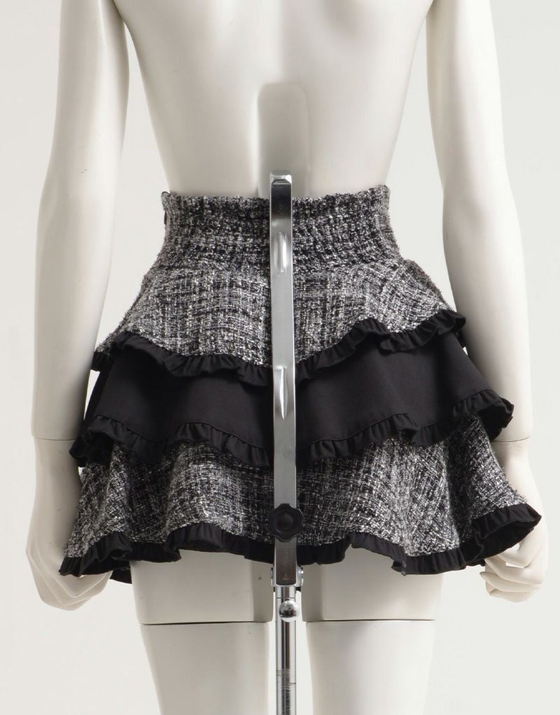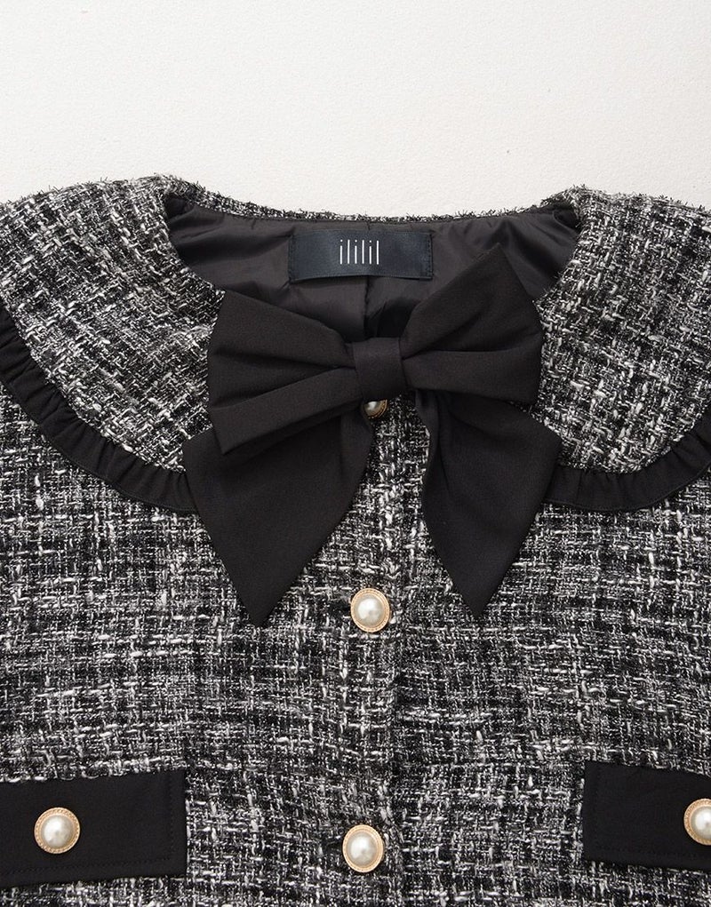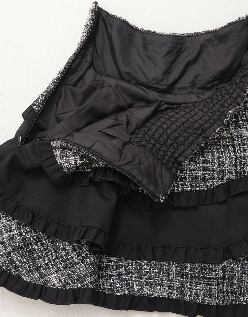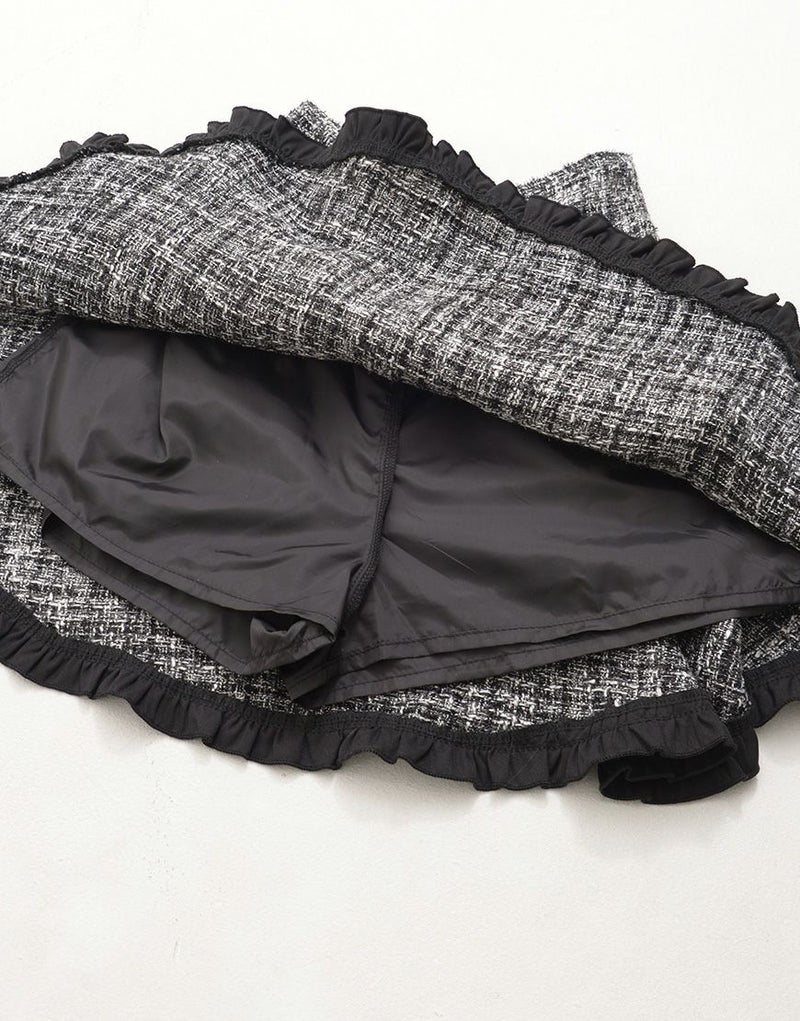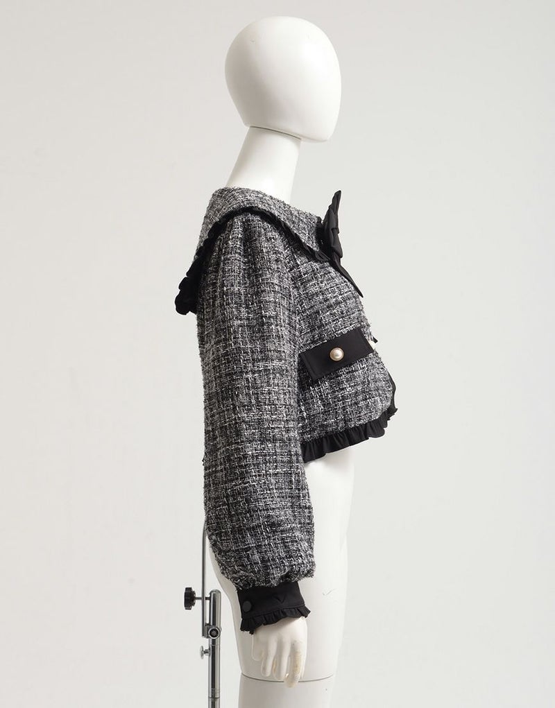 クラシカルなチェックツイードに、フリルとパールボタンを重ねたガーリーデザイン。