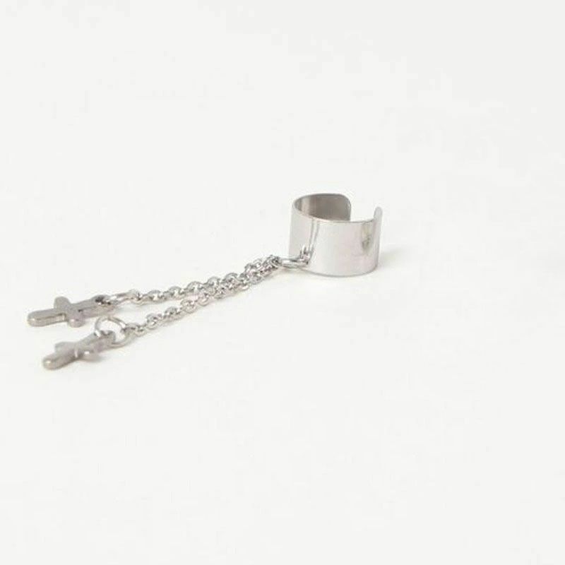 NOVESSELからクロスイヤーカフが登場しました。 シンプルで合わせやすい小ぶりな十字架を2つ垂らしたイヤーカフです。 ゴシック服、ゴスロリやパンク・V系・原宿系に相性抜群のワンポイントアクセとなっています。 ※モデル画像は照明などの影響により実際の商品と異なる場合がございます。