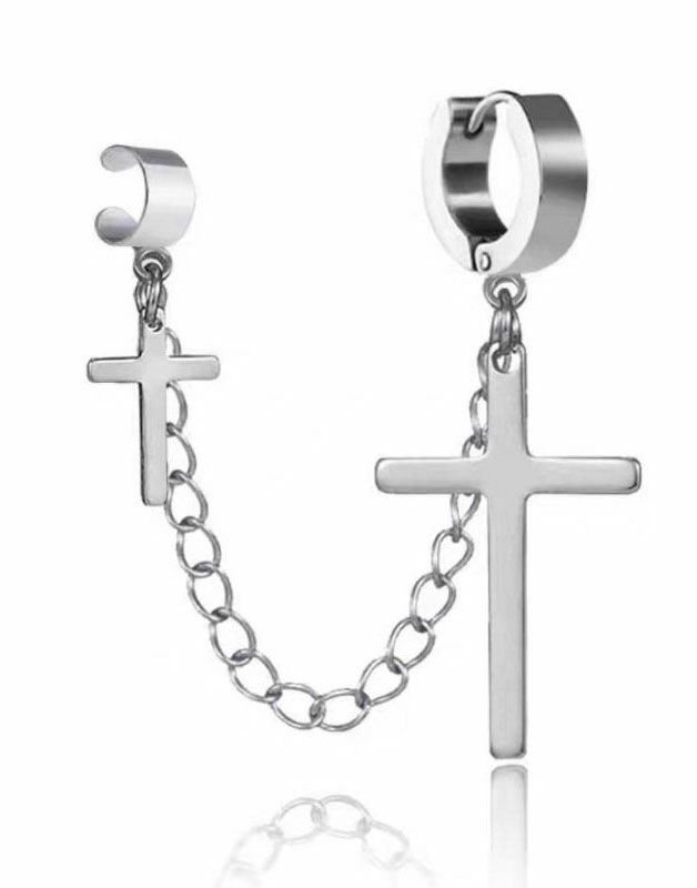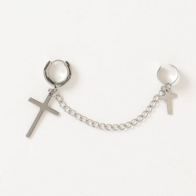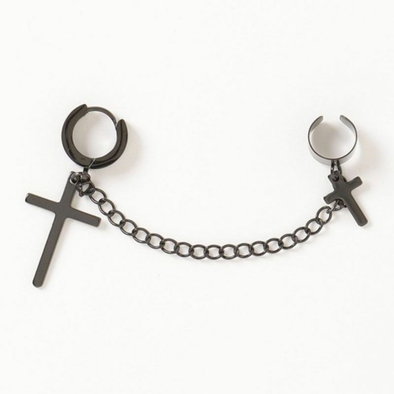NOVESSELからクロスチェーン付きピアス&イヤーカフが登場しました。 ピアスとイヤーカフをクロスチェーンで連結したお洒落なデザインのアクセサリー。 ロック系のスタイリングは勿論、ピープス系やストリートスタイルのアクセントにもおすすめ◎ ユニセックスとしても着用可能ですので、是非お試しください! ※モデル画像は照明などの影響により実際の商品と異なる場合がございます。