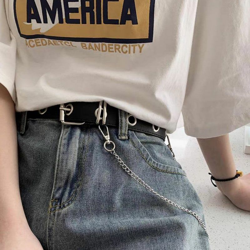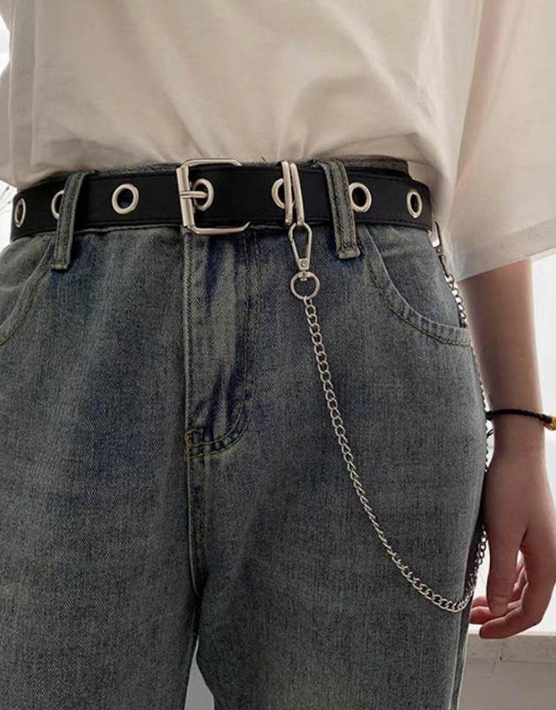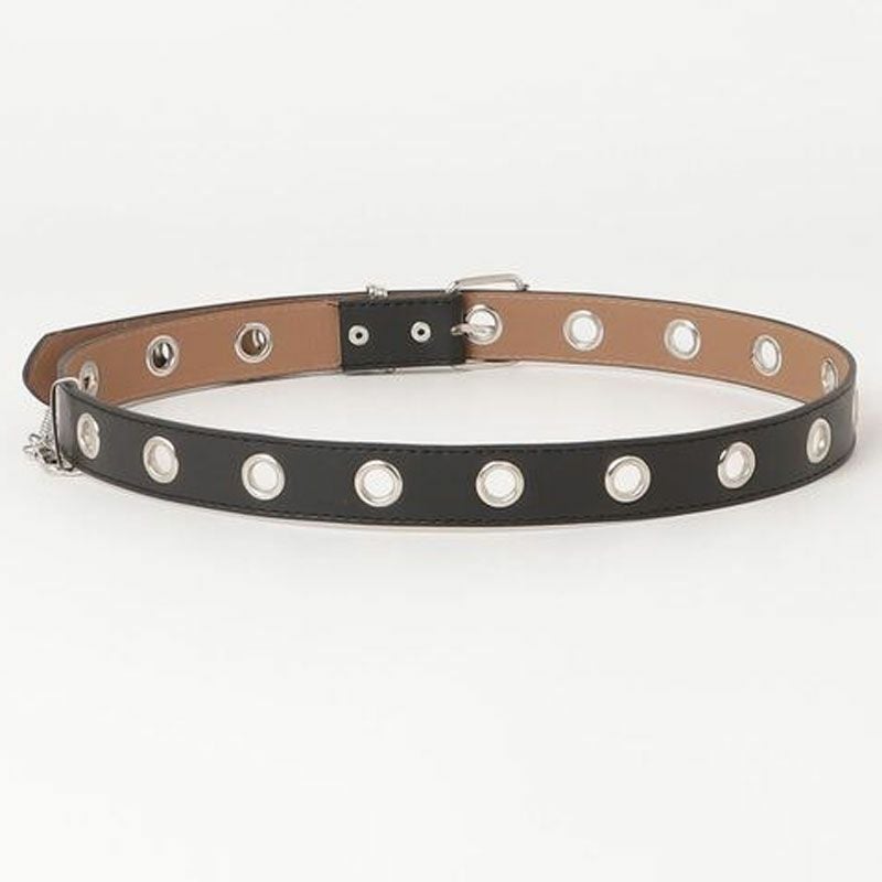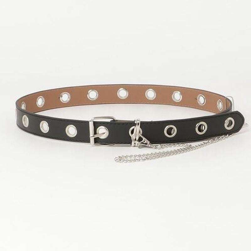 マットなフェイクレザー素材に、チェーンの装飾をあしらったハト目ベルト。