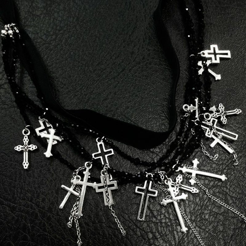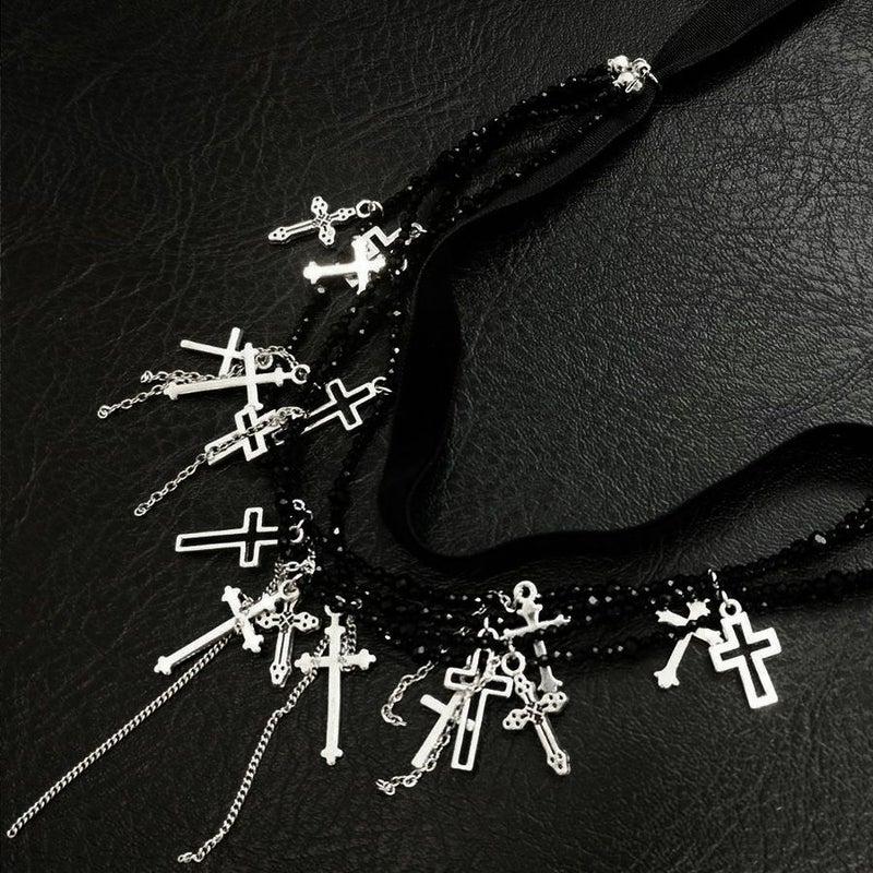 NOVESSEL【ノベセル】メニークロス多連チョーカーが登場。 たくさんのデザインが異なるクロスを散りばめた多面カットビーズとリボンが連なっ多連チョーカー。 闇カワ、パンク、ロック系のスタイリングは勿論、ストリートスタイルのアクセントにもおすすめ◎ ユニセックスとしても着用可能ですので、是非お試しください! ※モデル画像は照明などの影響により実際の商品と異なる場合がございます。