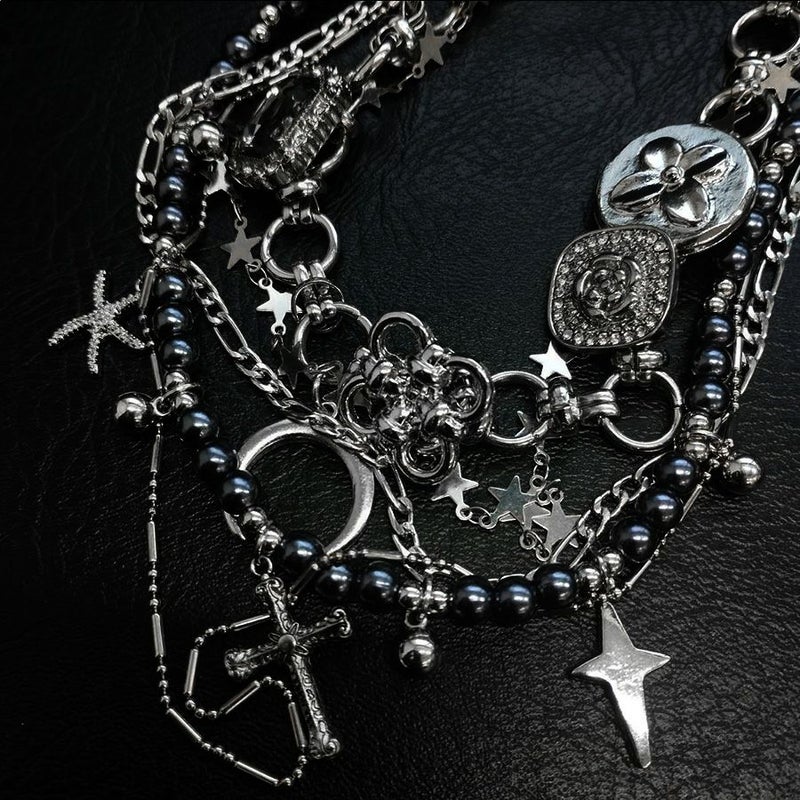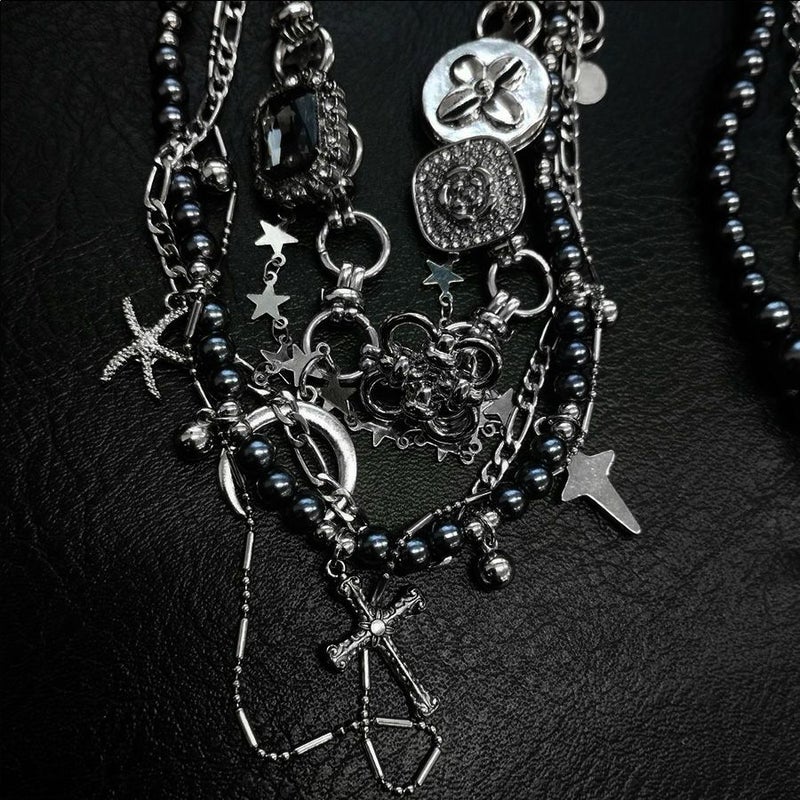 NOVESSEL【ノベセル】多連マルチデザインネックレスが登場。2つのネックレスがセットになっているアイテム。 重量感があり、細かなモチーフも魅力です。 ボールチェーン、クロス、三日月、ブラックダイヤモンドにハート、スタッズ… 1つで3WAYに楽しめる、バリエーションに富んだ推しアイテムです。 ※モデル画像は照明などの影響により実際の商品と異なる場合がございます。 ユニセックスとしても着用可能ですので、是非お試しください!