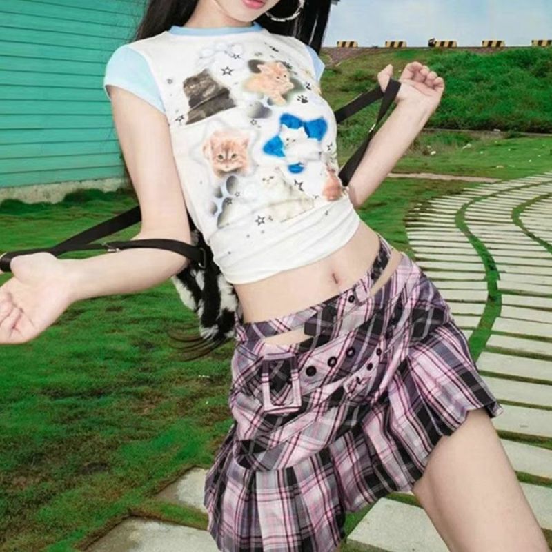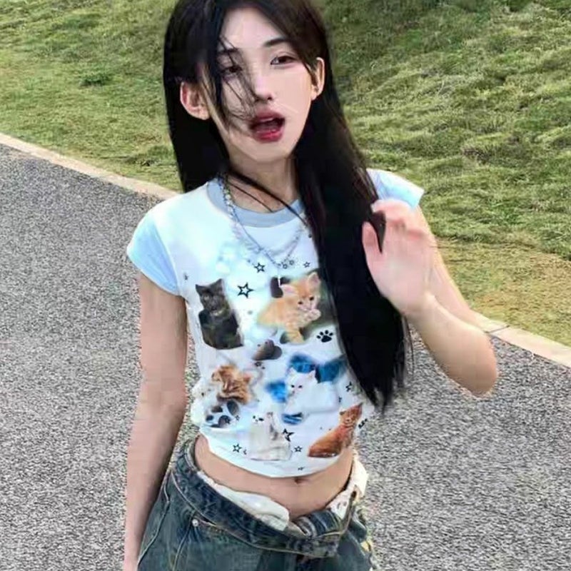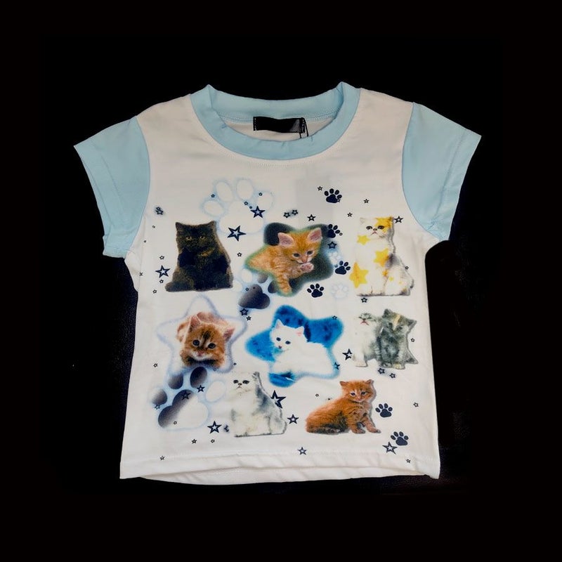 猫ちゃんいっぱいのクロップド丈Tシャツ ちっちゃめのサイズ感だけど女児服じゃないもん! 今っぽいY2Kスタイルに合わせてもキュート! ※モデル画像は照明などの影響により実際の商品と異なる場合がございます。